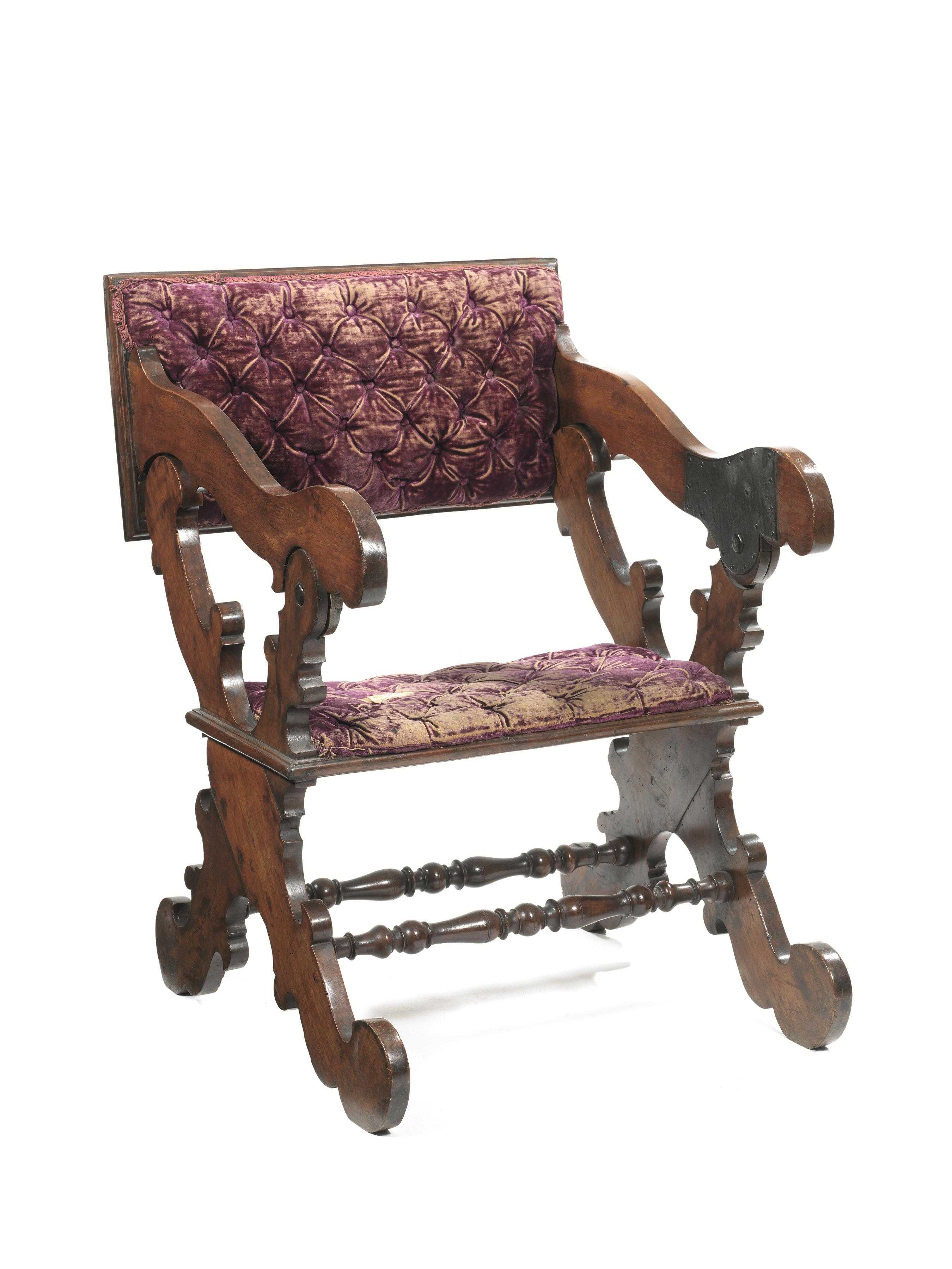 Poltrona inginocchiatoio, Toscana, inizi sec. XVIII, in noce a patina scura filettato in bosso, braccioli a giorno con estremità a ricciolo stilizzato, gambe a volute riunite da traverse tornite, sedili in velluto viola, trasformabile in inginocchiatoio, alcuni restauri e sostituzioni