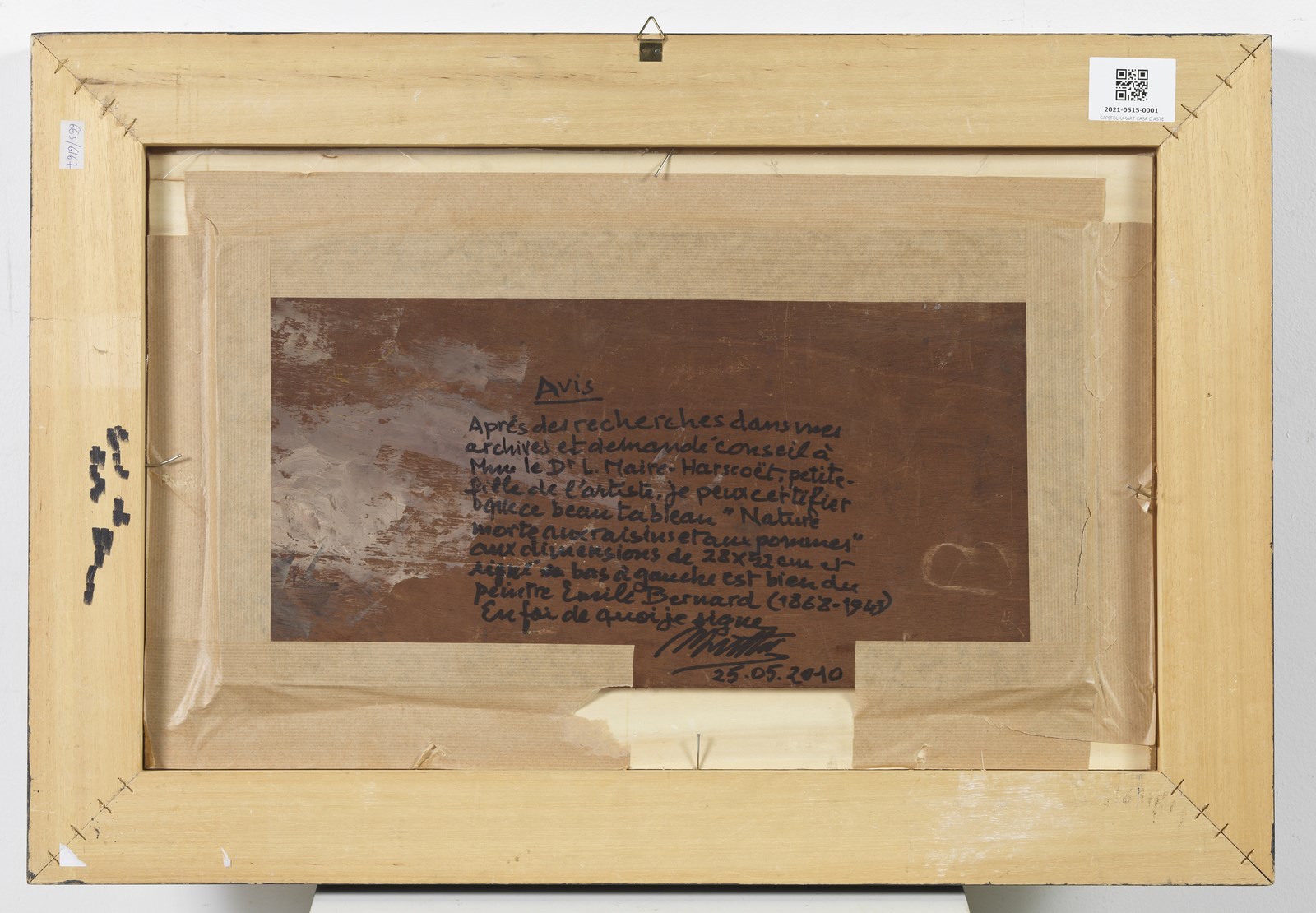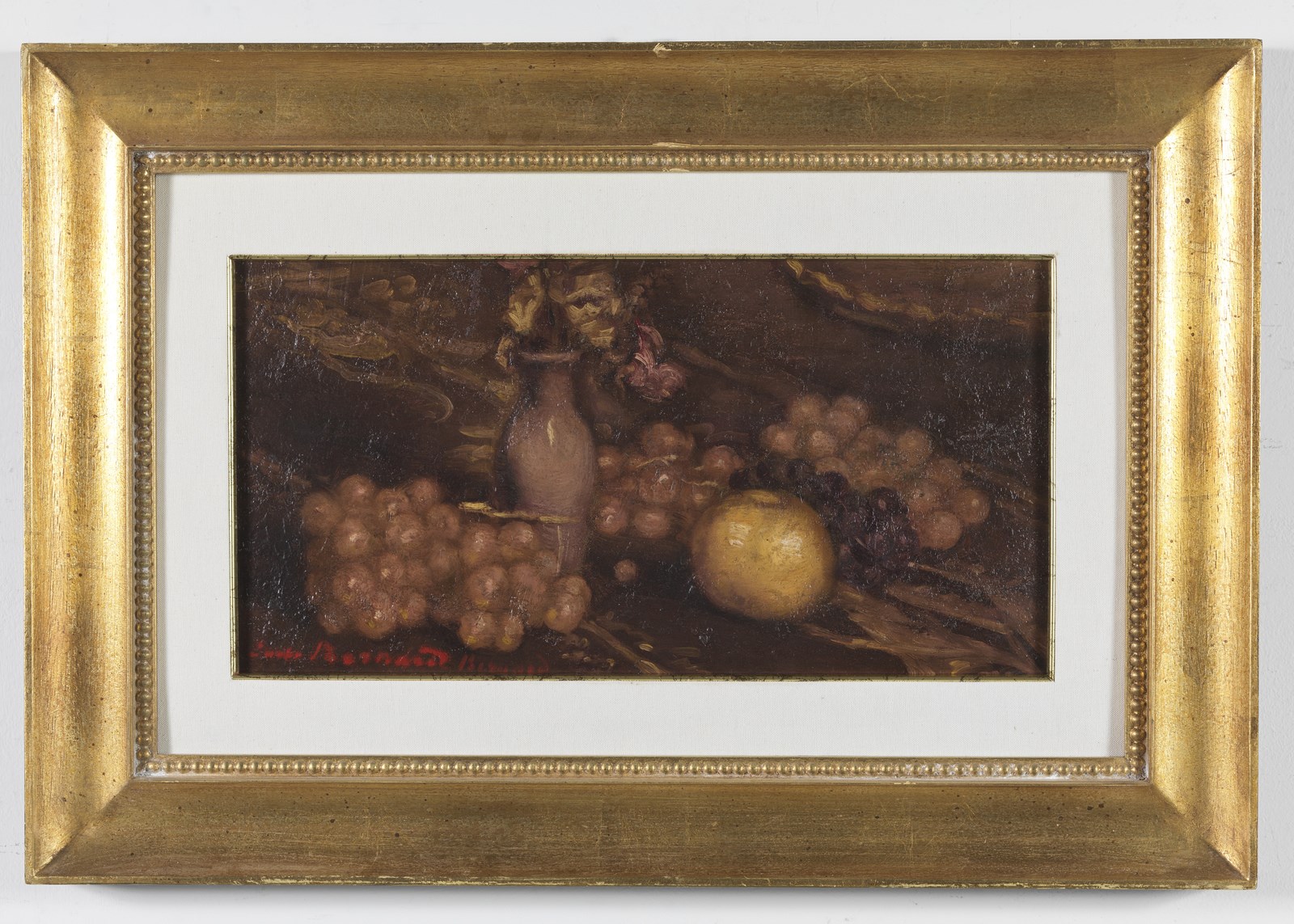 BERNARD EMILE HENRI (1868 - 1941) Uva, altri frutti ed un vaso di fiori su un piano. Olio su tavola. Cm 54,00 x 30,00. Firma in basso a sinistra. Al retro dichiarazione di autenticità di Jean Jaques Luthi. Autentica su fotografia di Mr Luthi. Cornice presente