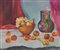 BERGAMASCHI MARIO Vaso con frutta. 1991. Olio su tela . Cm 60,00 x 50,00. Firma in basso a destra. Al retro firma per autentica e anno. Cornice presente