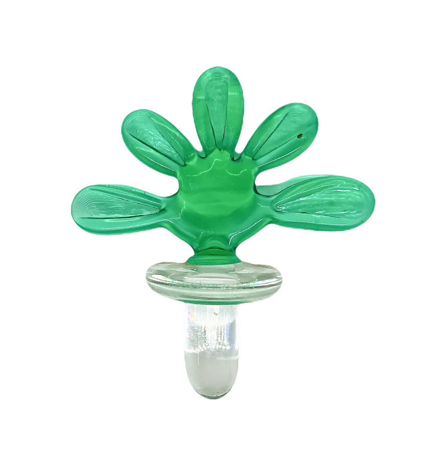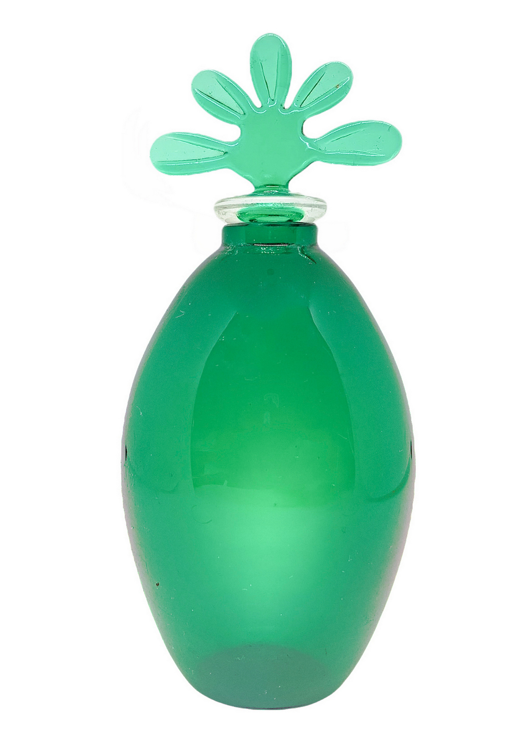 Venini, piccola bottiglia in vetro di Murano colore verde con tappo che richiama forme della natura. Firmato alla base Venini '89