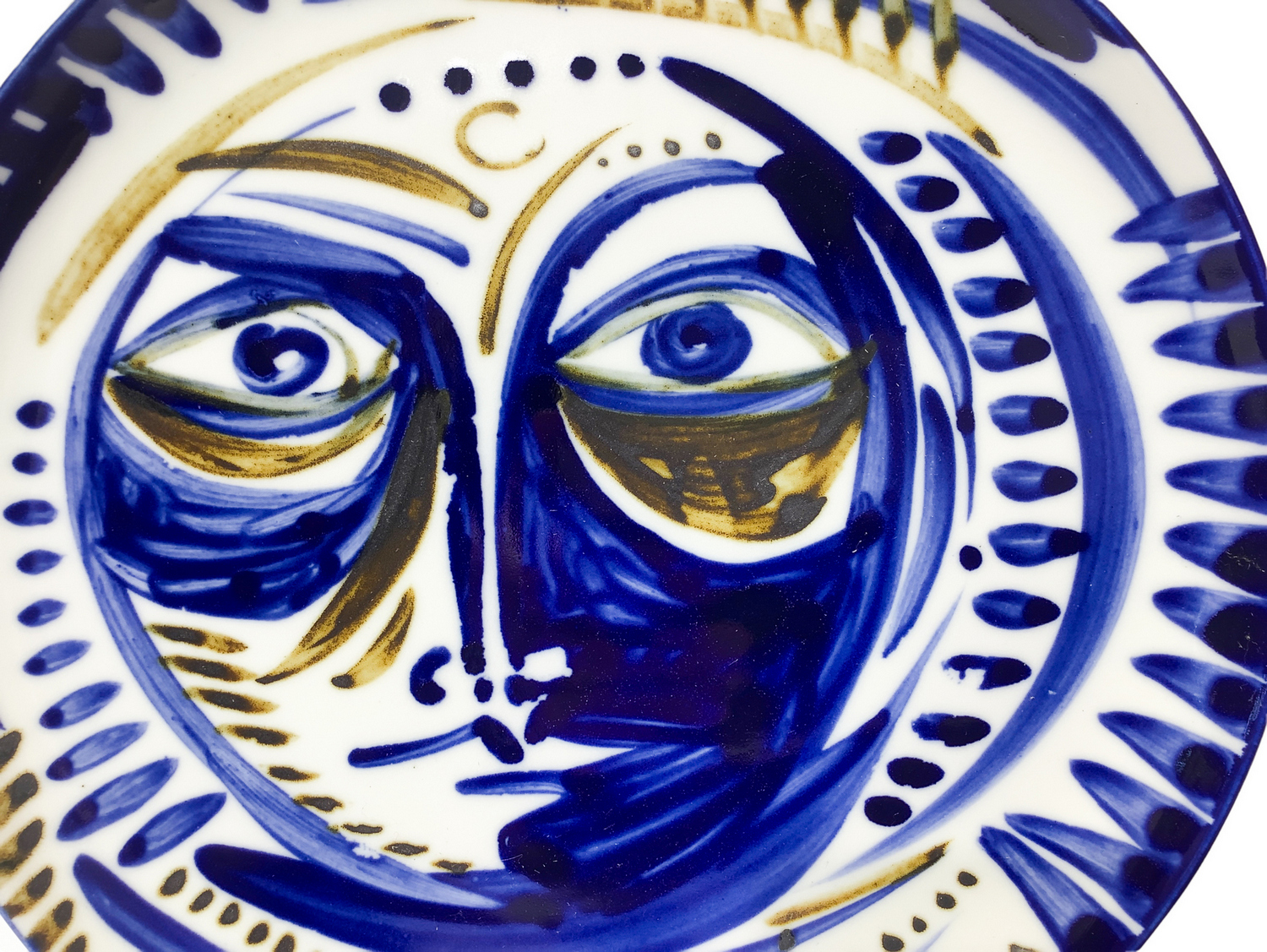 Piatto da muro in porcellana raffigurante volto nei toni del blu. nello stile delle ceramiche di Vallaurice.