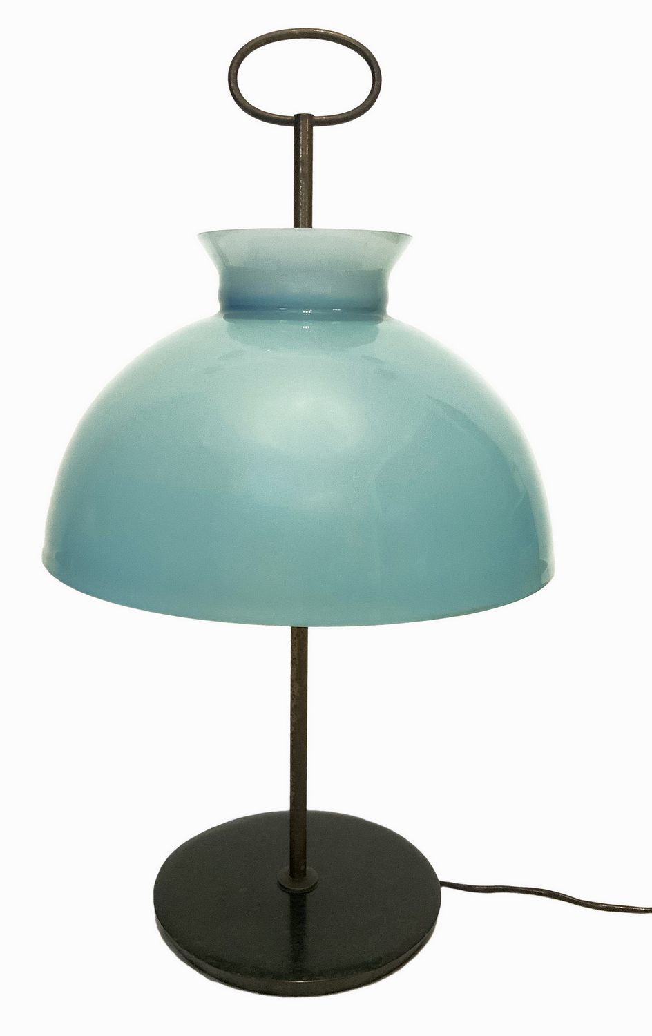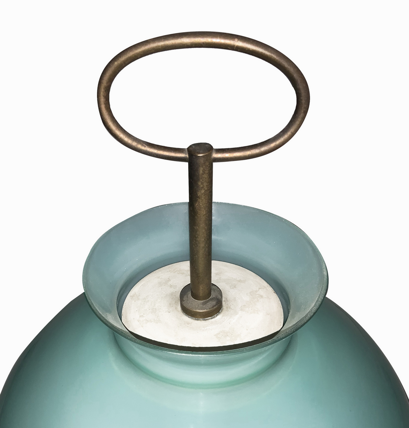 Adrasteia. Lampada da tavolo in vetro incamiciato nei toni del verde acqua. Anni '50.,struttura in ottone brunito e base in marmo nero del Belgio.