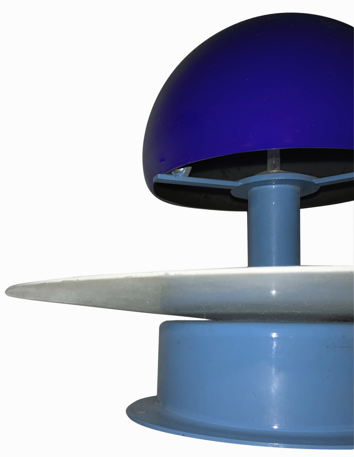 Vistosi, Attribuibile a Michele Delucchi stile Memphis. Anni ‘80. Coppia di Appliques. in metallo laccato laccato e diffusori in vetro incamiciato nei toni del blu cobalto.