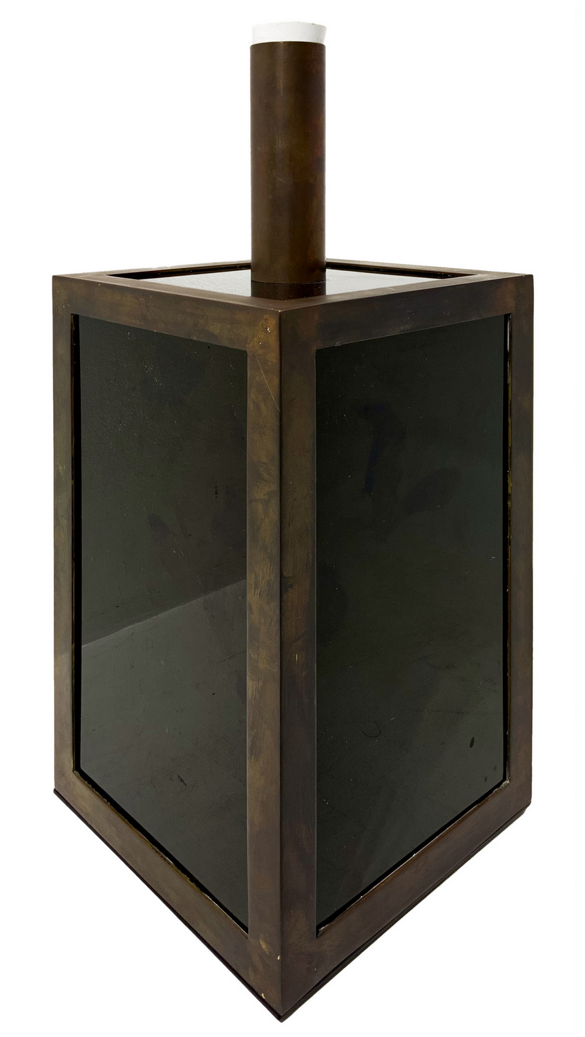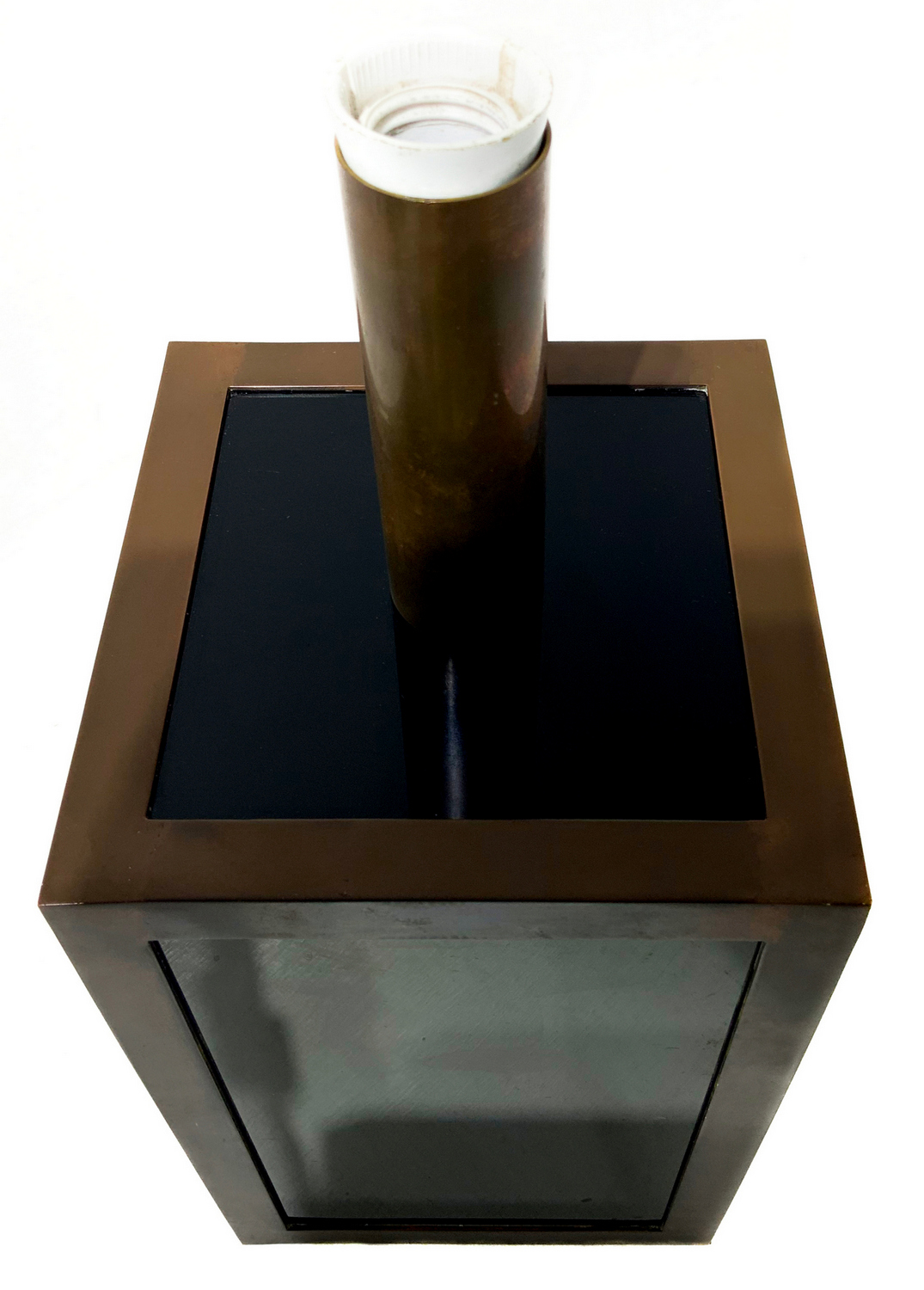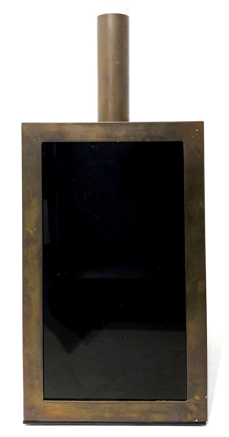Produzione italiana stile Gabriella Crespi. Lampada con struttura in ottone e vetro onixdor nero. Anni ‘60 ,inserti in plastica.