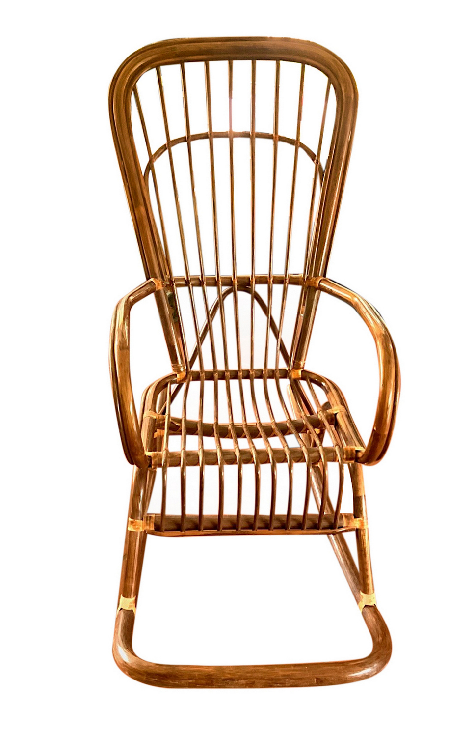 Poltrona in rattan a dondolo. H cm 115, larghezza cm 55, profondità cm 110