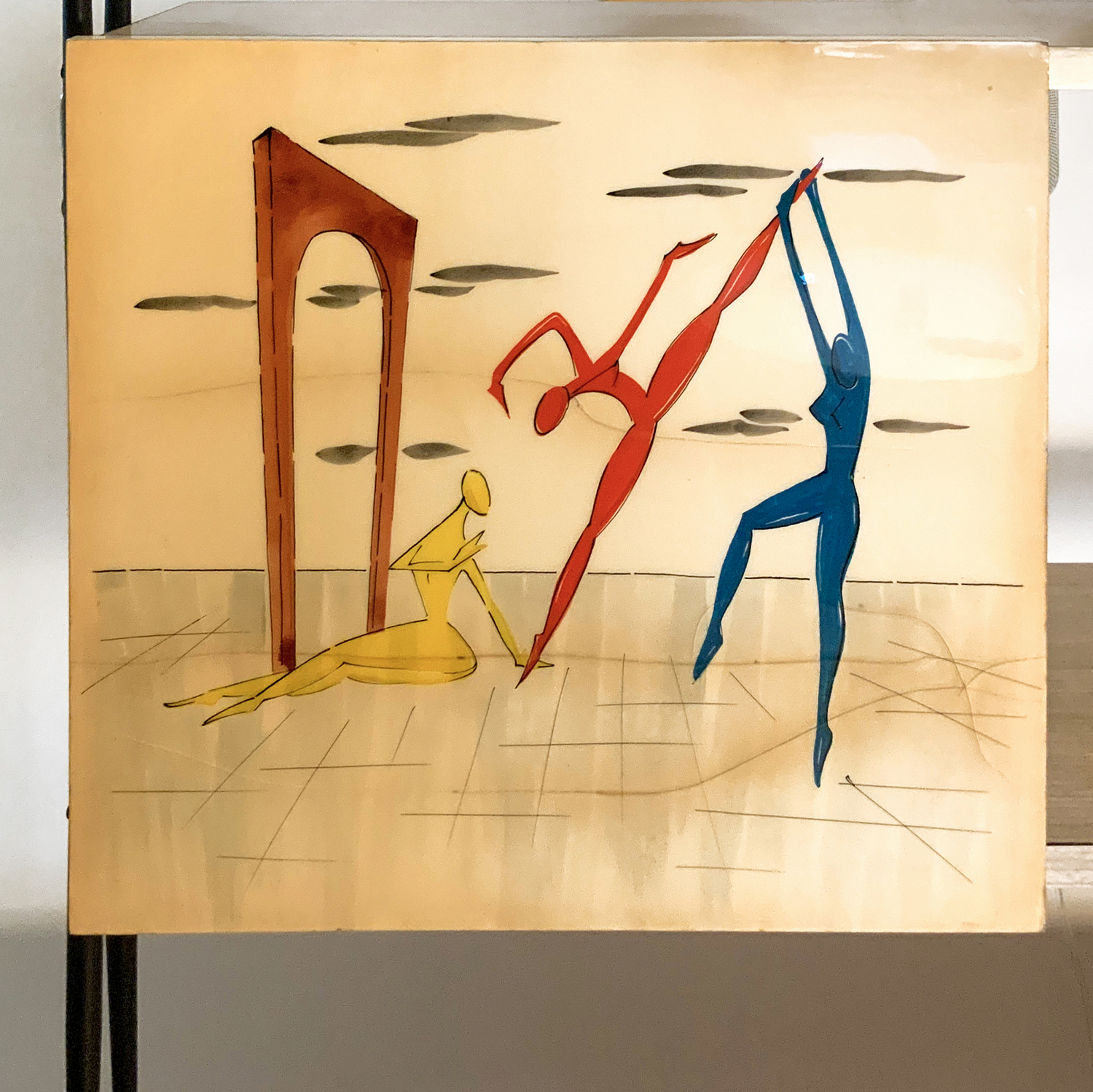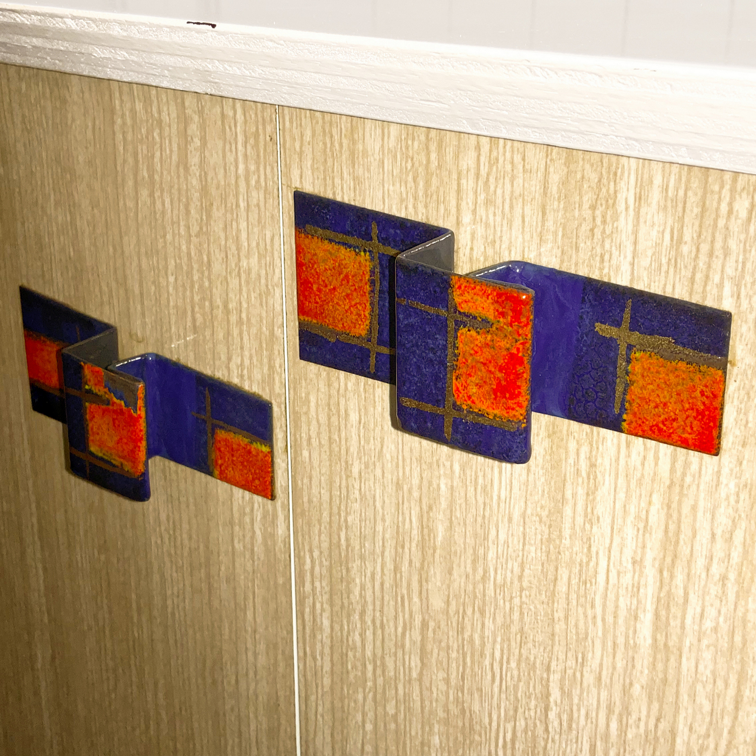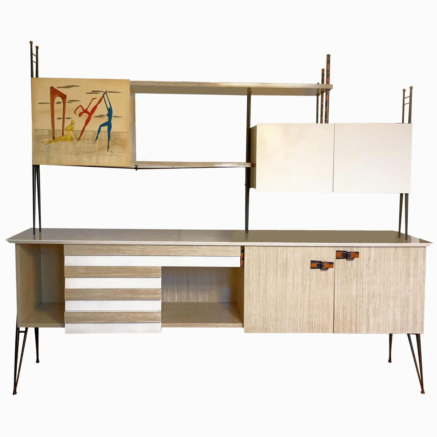 Siva Poggibonsi. Anni ’50. Credenza in legno rivestita in formica. struttura in metallo laccato e finiture in ottone, applicazione di maniglie ed elementi in rame smaltato al terzo fuoco