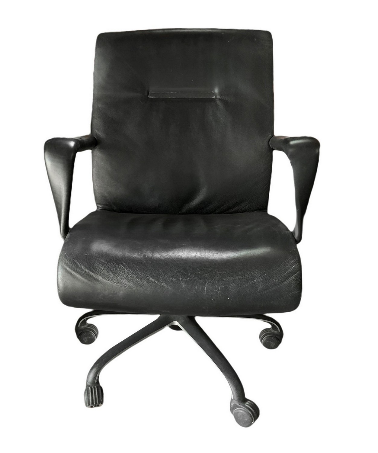 Poltrona Frau, poltrona modello Forum, disegno Design Centre. Anni '90,Struttura del piede in alluminio a cinque razze, rivestimento in pelle color nero.