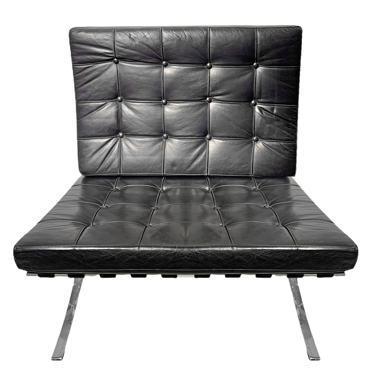 Poltrona stile Barcelona. Anni '90,struttura in metallo cromato, spalliera e seduta in pelle nei toni del nero, lavorazione capitonnè. Stringhe di supporto in cuoio H cm 74, cm 75x90