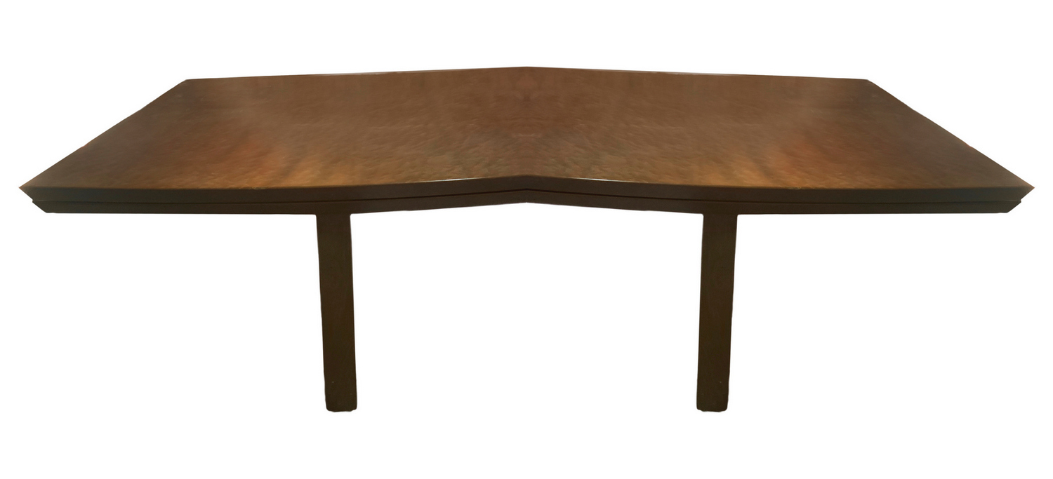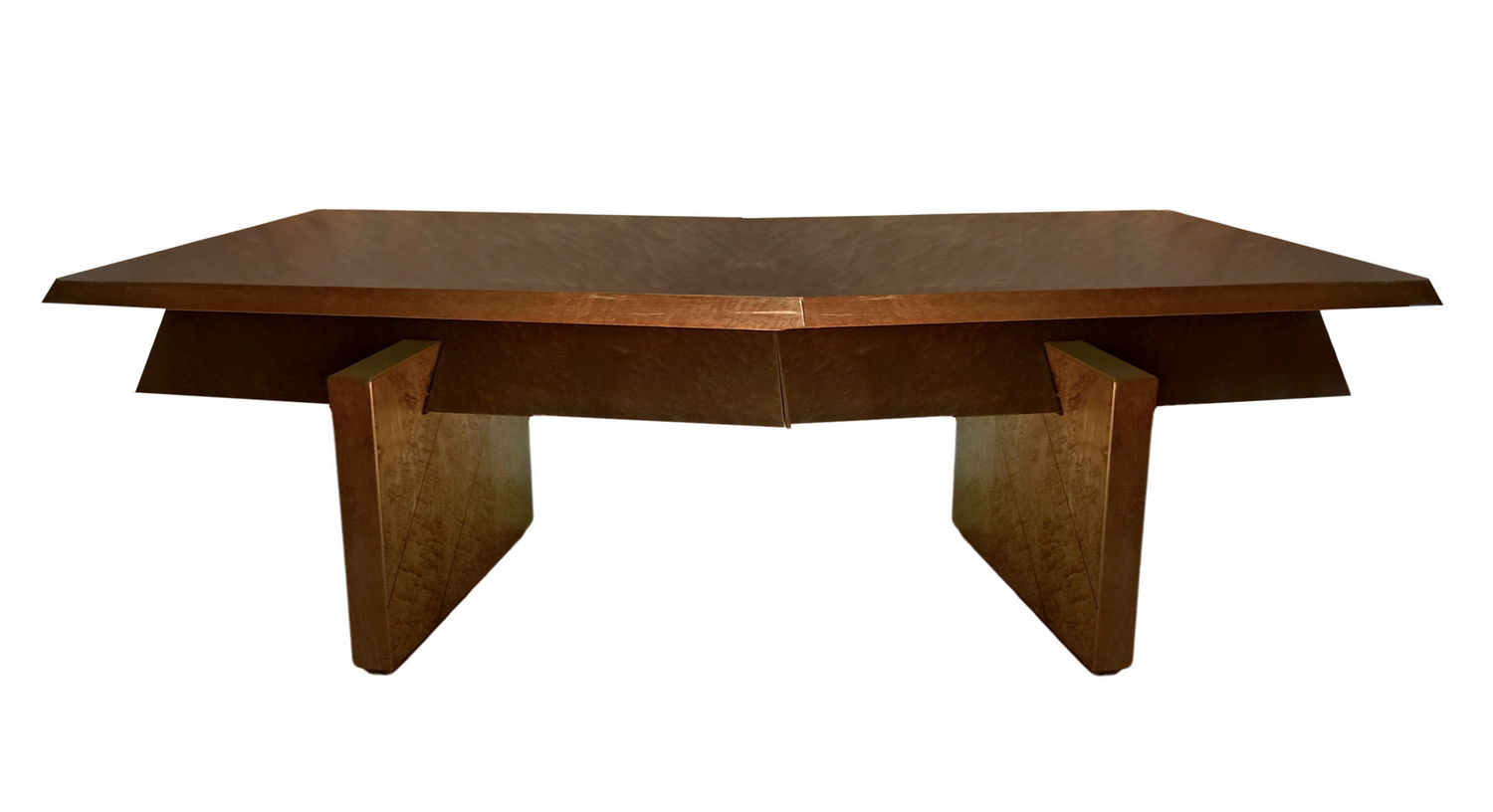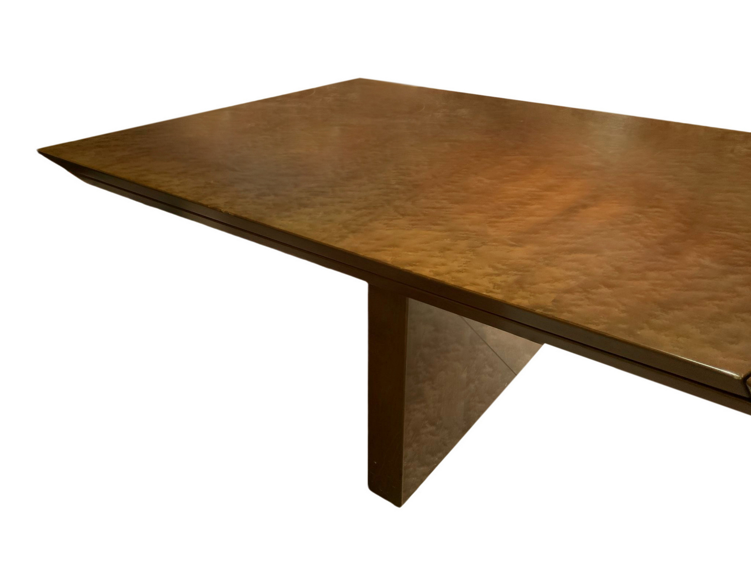 Saporiti, scrivania dirigenziale, disegno Giovanni Offredi. Anni '90,struttura in legno rivestita in radica di olmo acrilicata nei toni del marrone chiaro