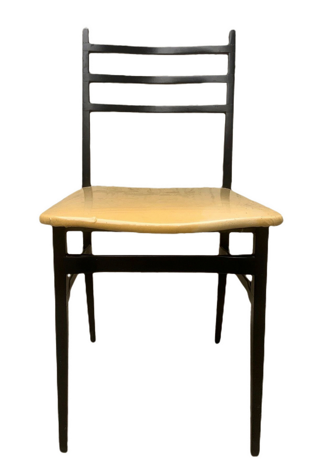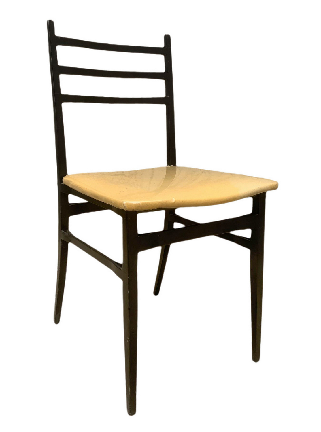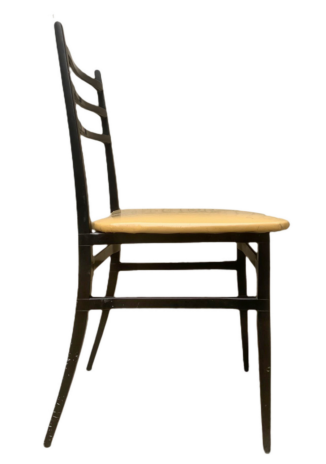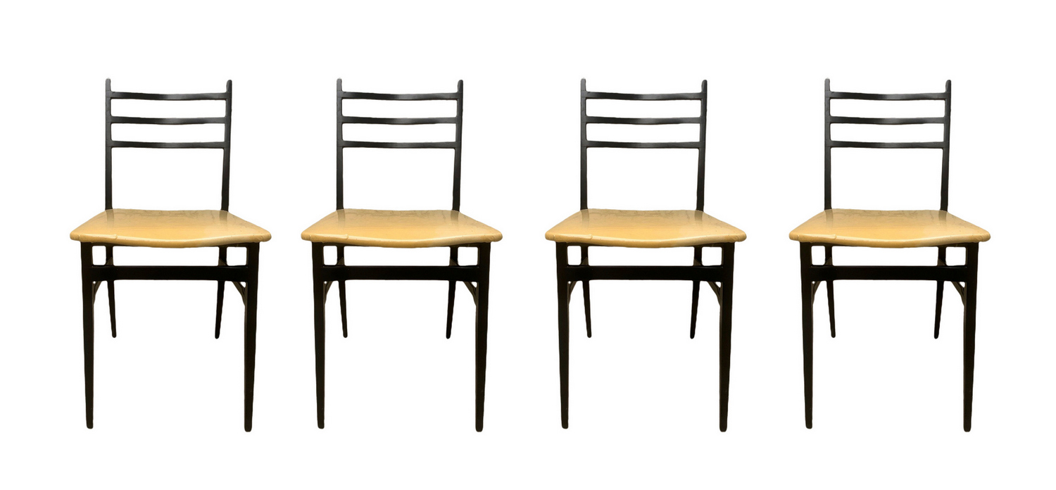 Produzione Saffa, disegno Guglielmo Ulrich, modello Trieste. Gruppo di quattro sedie. Anni '50,struttura in legno laccato nero e sistema di incastro brevettato a coda di rondine, seduta rivestita in tessuto. Segni di uso.