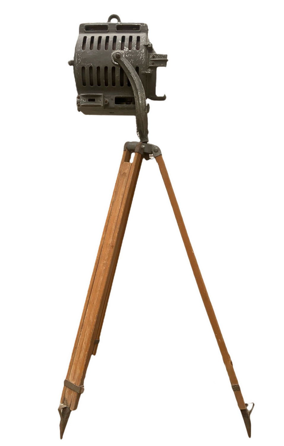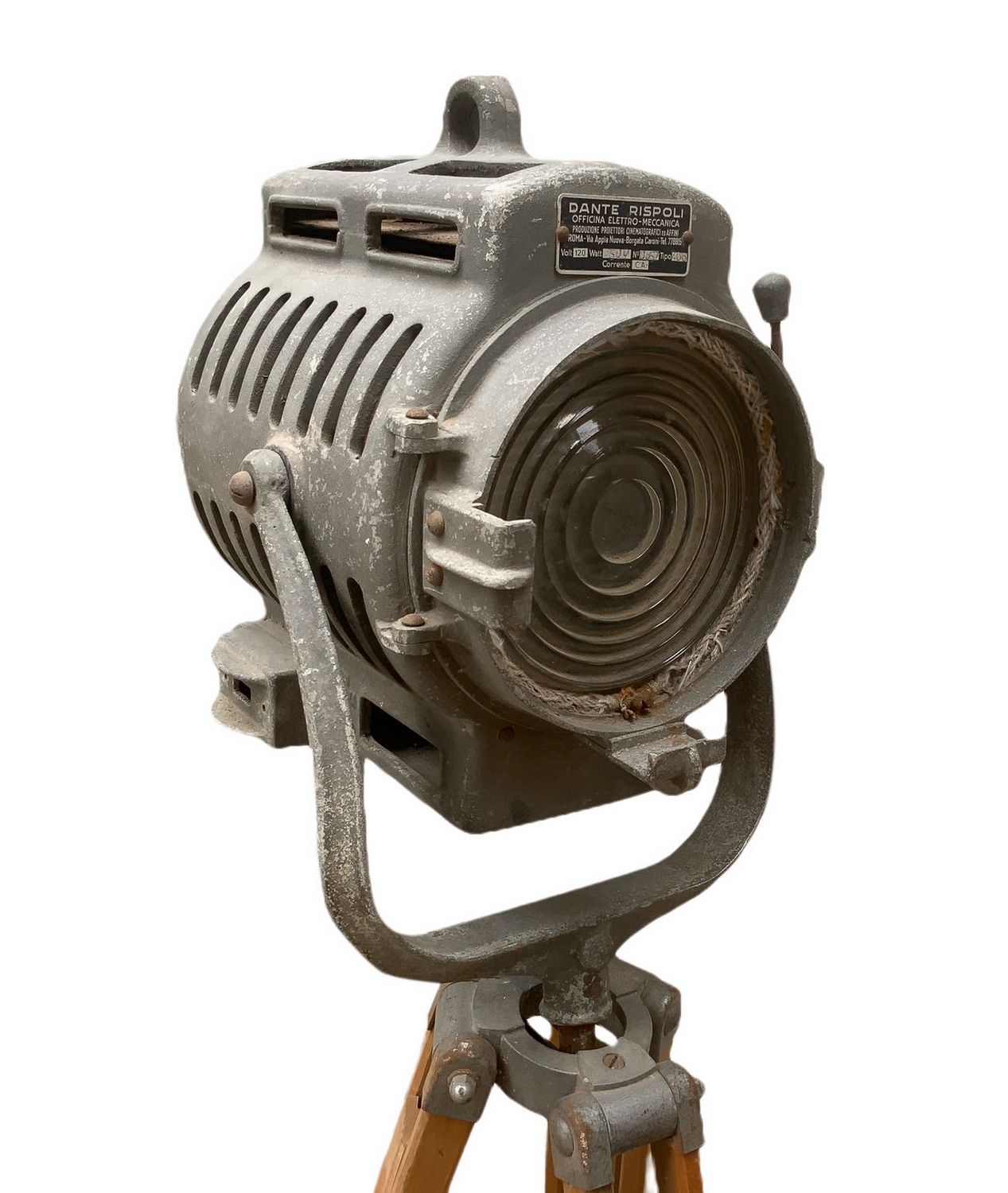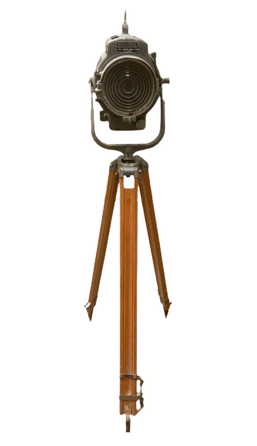 Produzione Dante Ruspoli. Proiettore in metallo con supporto treppiedi in legno regolabile. Mancanze e segni di uso da elettrificare.