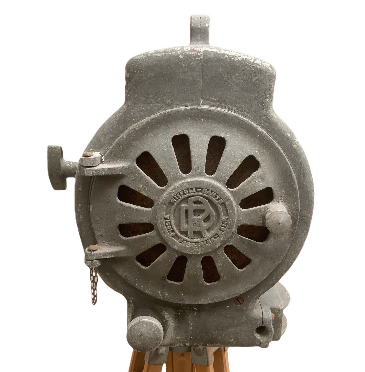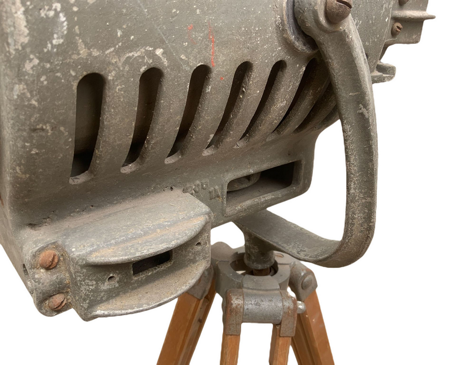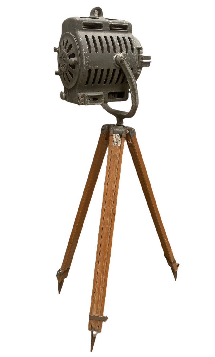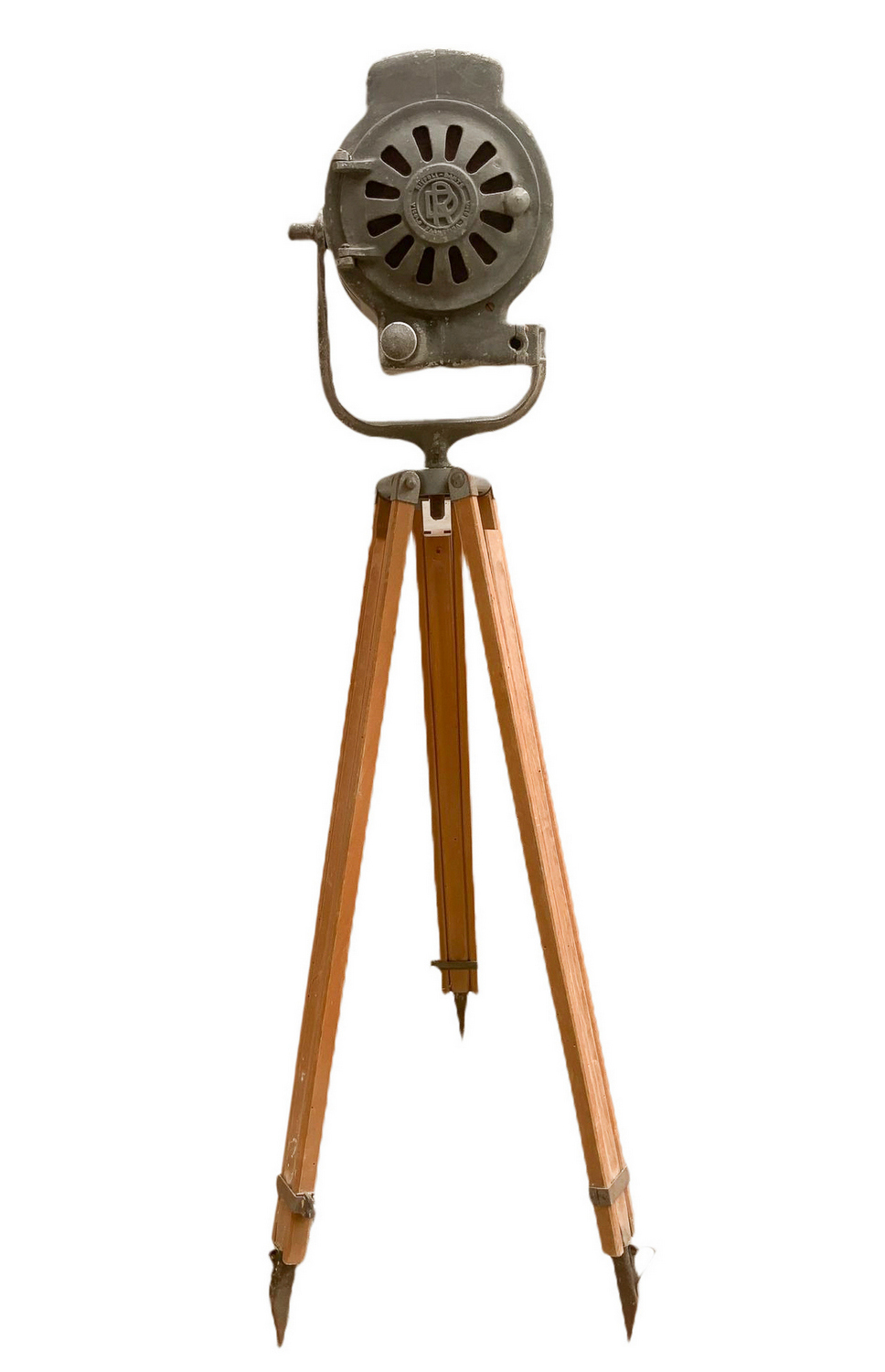 Produzione Dante Ruspoli. Proiettore in metallo con supporto treppiedi in legno regolabile. Mancanze e segni di uso da elettrificare.