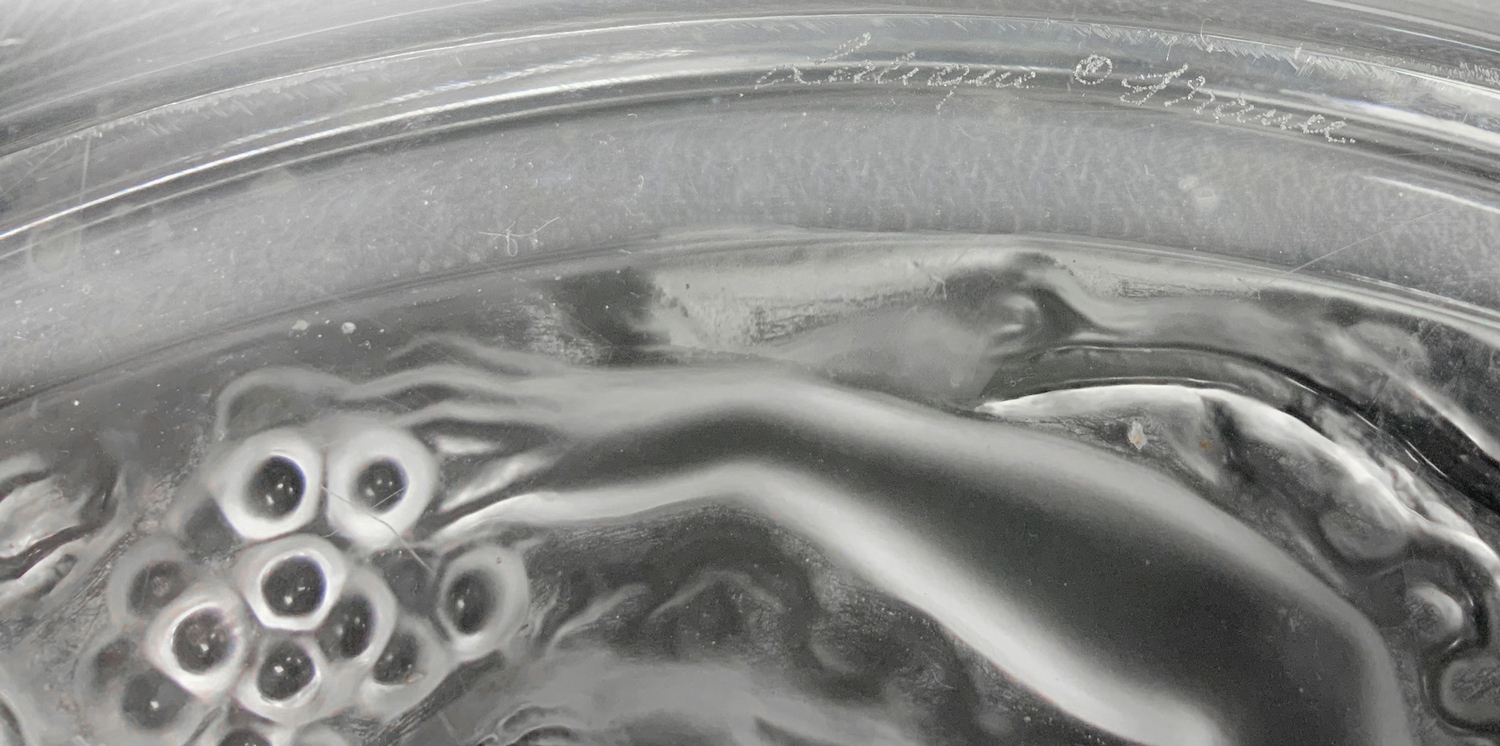 Lalique, grande piatto in cristallo "Côte-d'Or" chiamato anche "Trois figurines et raisins". Francia,Con finiture satinate, firmato Lalique sul retro del bordo. Presenti tre sbeccature sul bordo