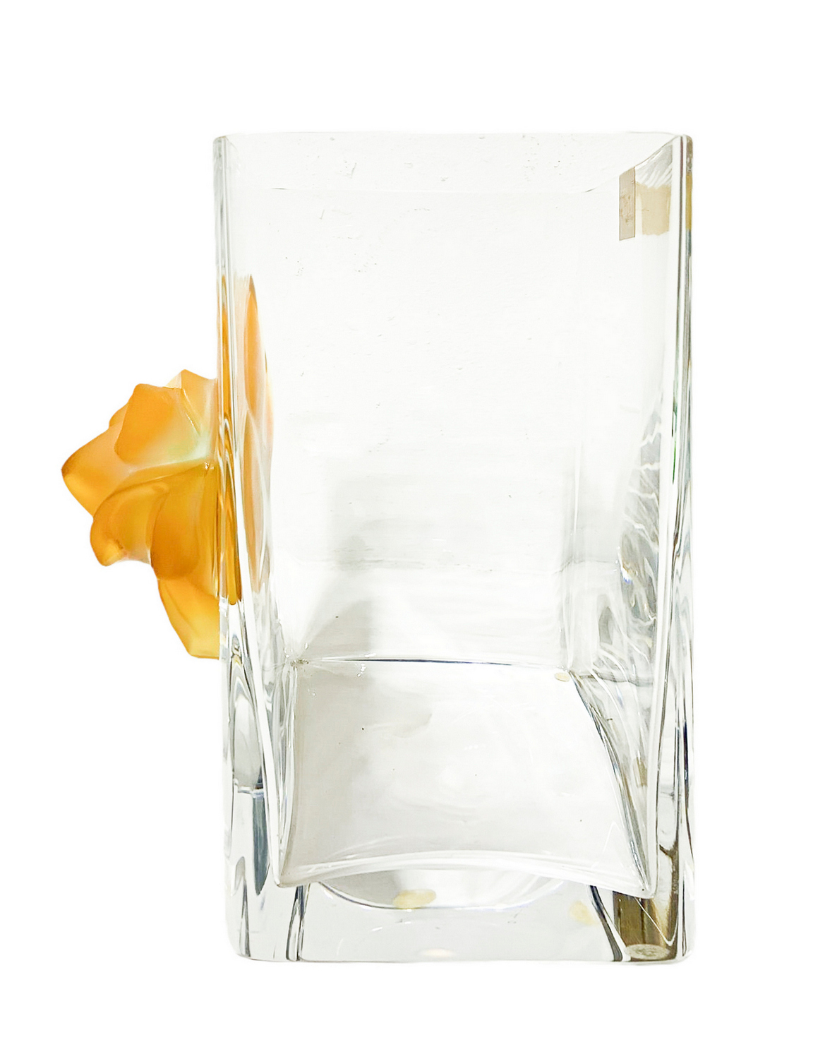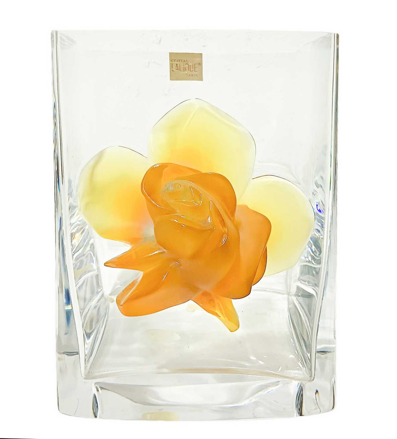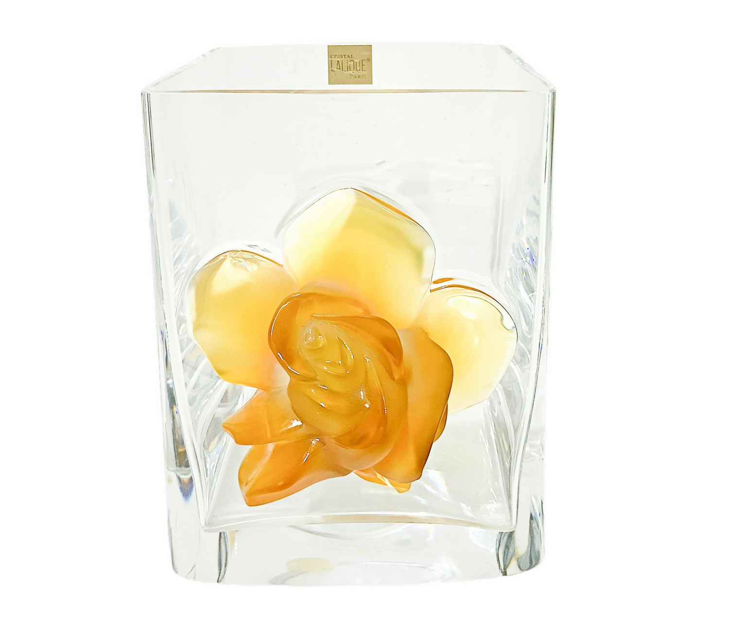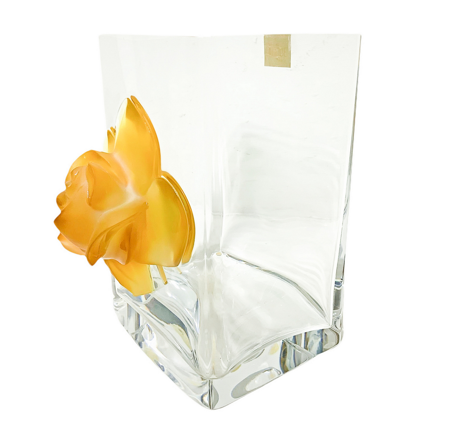 Vaso Lalique "Amber Rose", vaso in vetro trasparente. Francia,con una rosa applicata sul davanti modellata in color ambra. Firmato sulla base Lalique Francia.