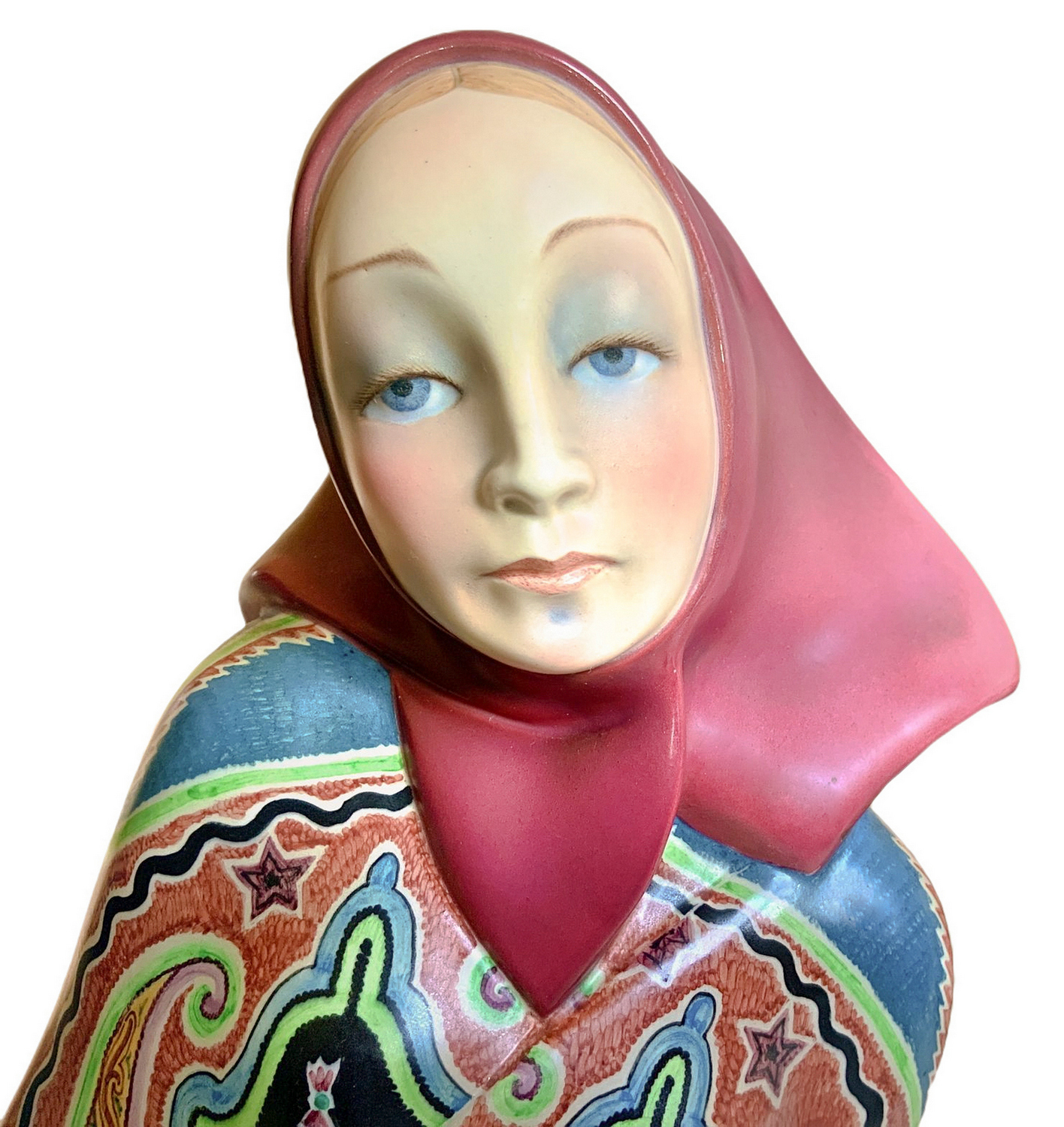 Produzione Lenci Torino, disegno Elena Scavini. Statua in pasta bianca. Anni ’30,modellata a colaggio raffigurante Madonna del vento, decorato in policromia con finitura matte. Minime mancanze.