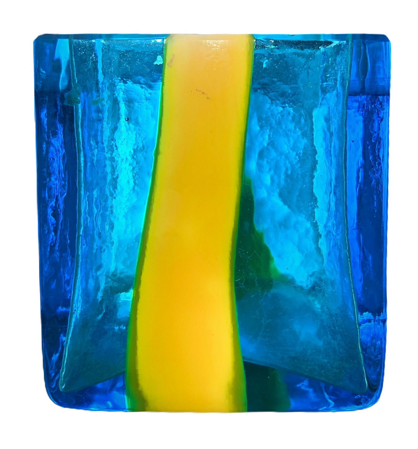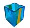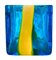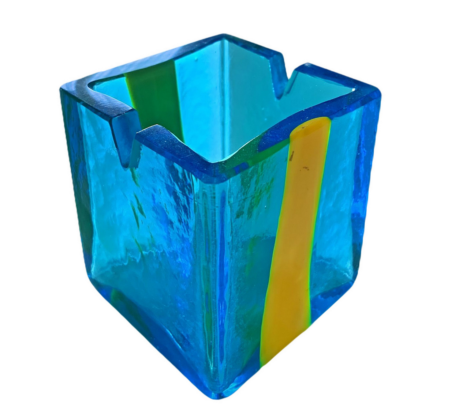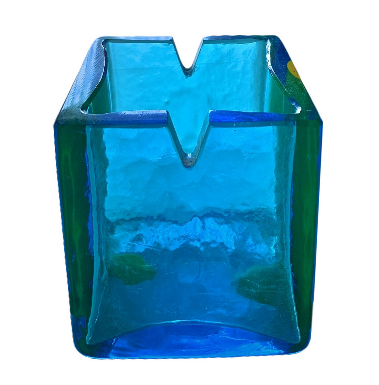 Produzione Venini, disegno Pierre Cardin. Lotto composto da un posacenere ed un vaso in vetro. Anni ’70,solifiore nei toni del blu chiaro e inclusioni di pasta vitrea nei toni del giallo firmati sulla base a punta di diamante.