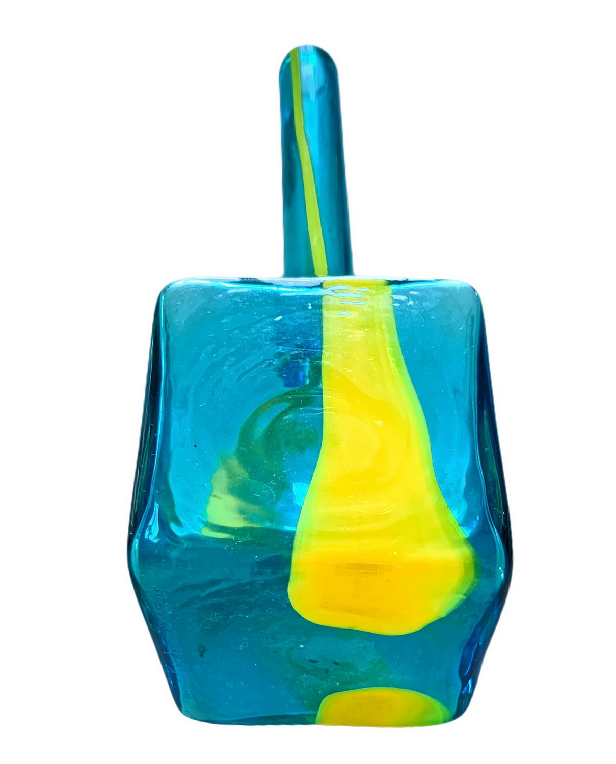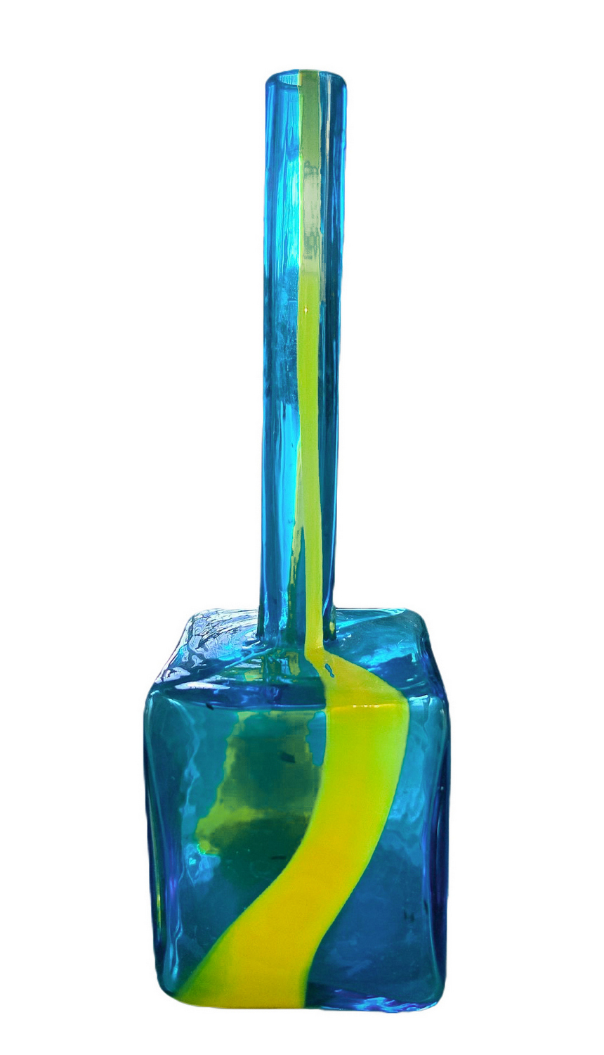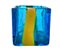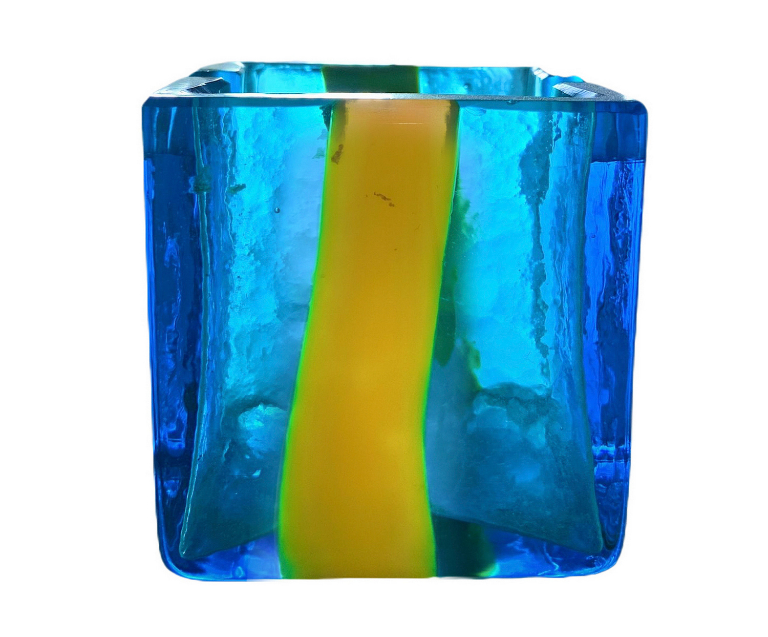 Produzione Venini, disegno Pierre Cardin. Lotto composto da un posacenere ed un vaso in vetro. Anni ’70,solifiore nei toni del blu chiaro e inclusioni di pasta vitrea nei toni del giallo firmati sulla base a punta di diamante.