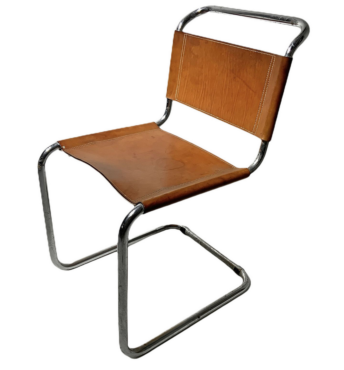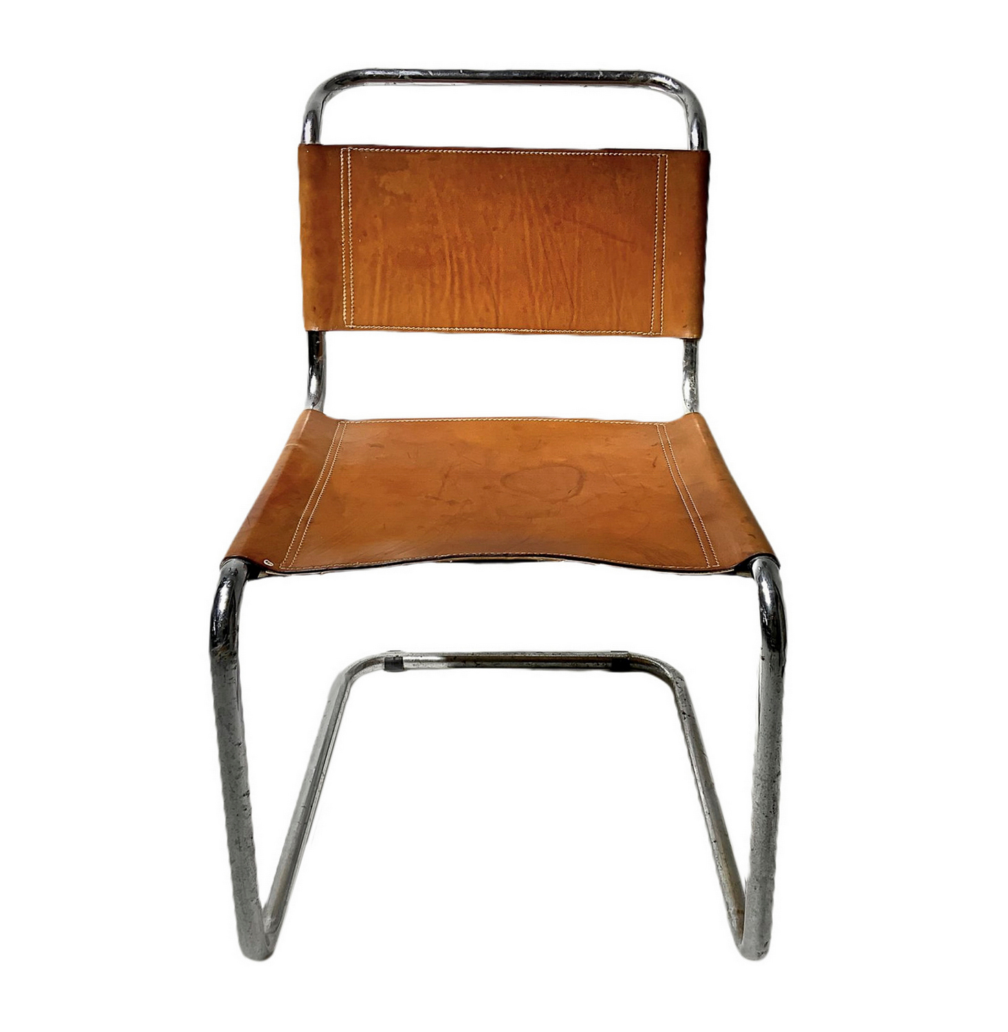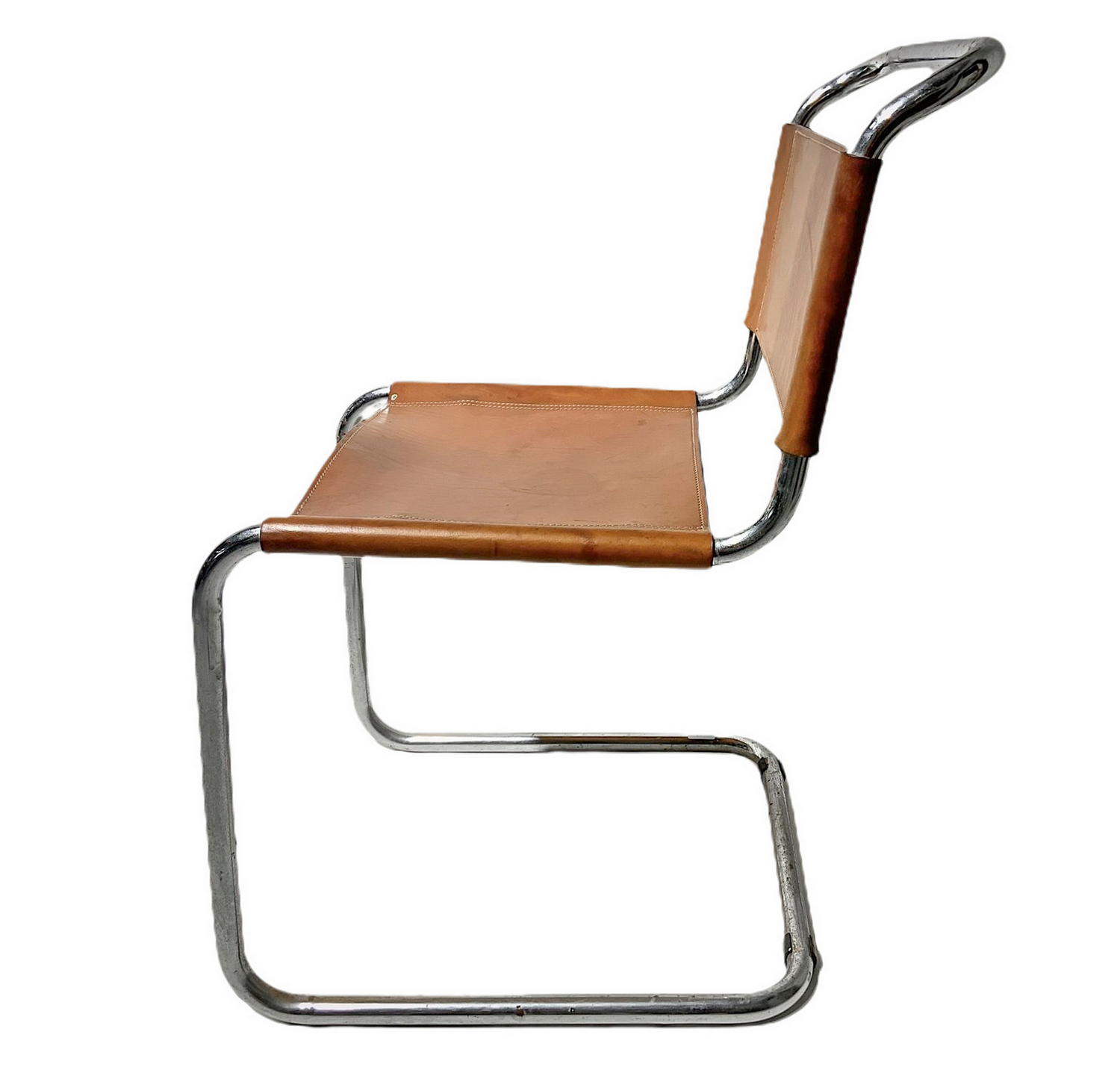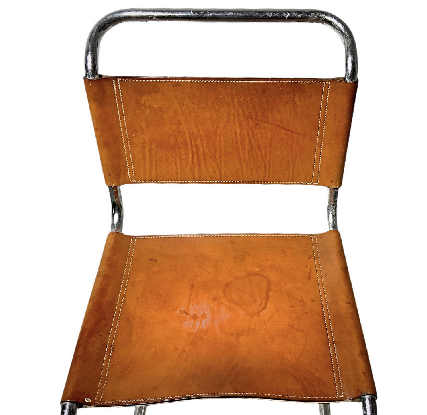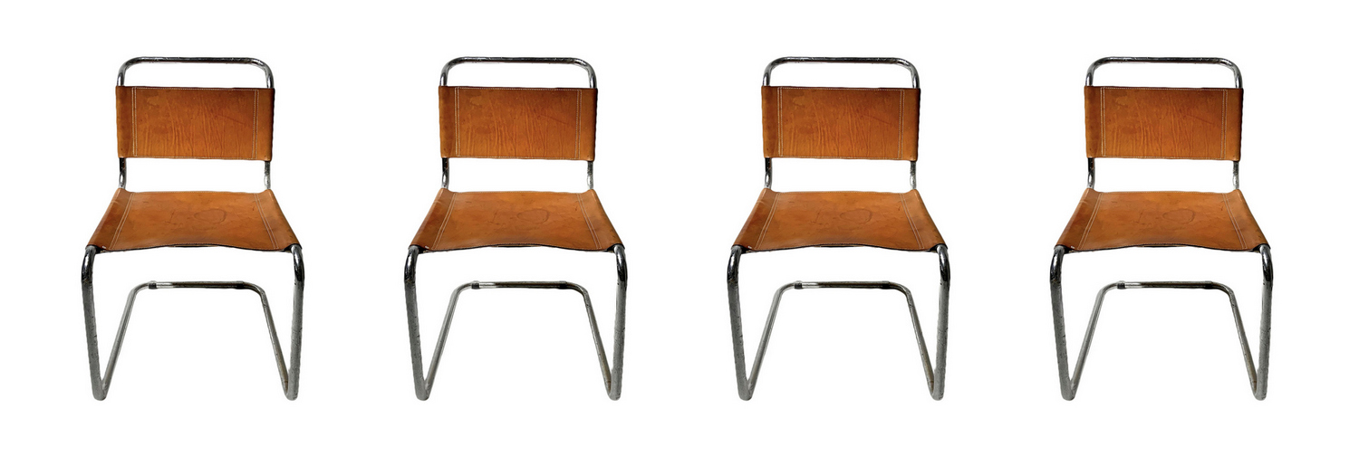 Gavina, lotto composto da quattro sedie, disegno Marcel Breuer. Anni '80,con struttura in tubolare metallico cromato. Seduta e spalliera in fasce di cuoio