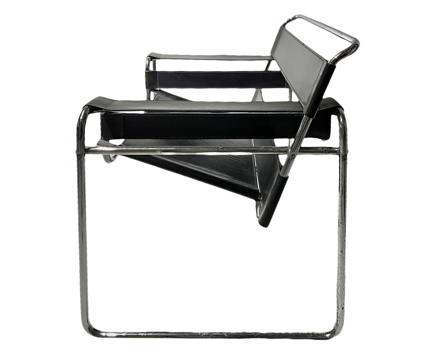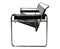 Gavina, poltrona disegno Marcel Breuer, modello Vassili. Anni '80,Poltrona con struttura in metallo tubolare cromato, seduta e spalliera a fasce di cuoio di forte spessore nei toni del nero. Salti di cromature H cm 75, cm 76 x 70 Salti nella cromatura