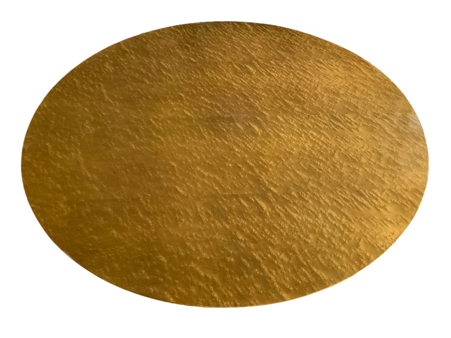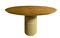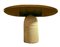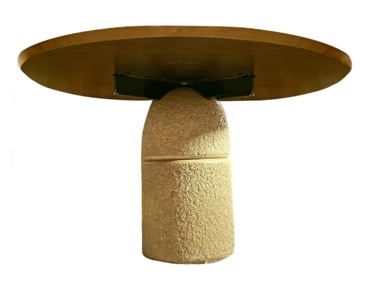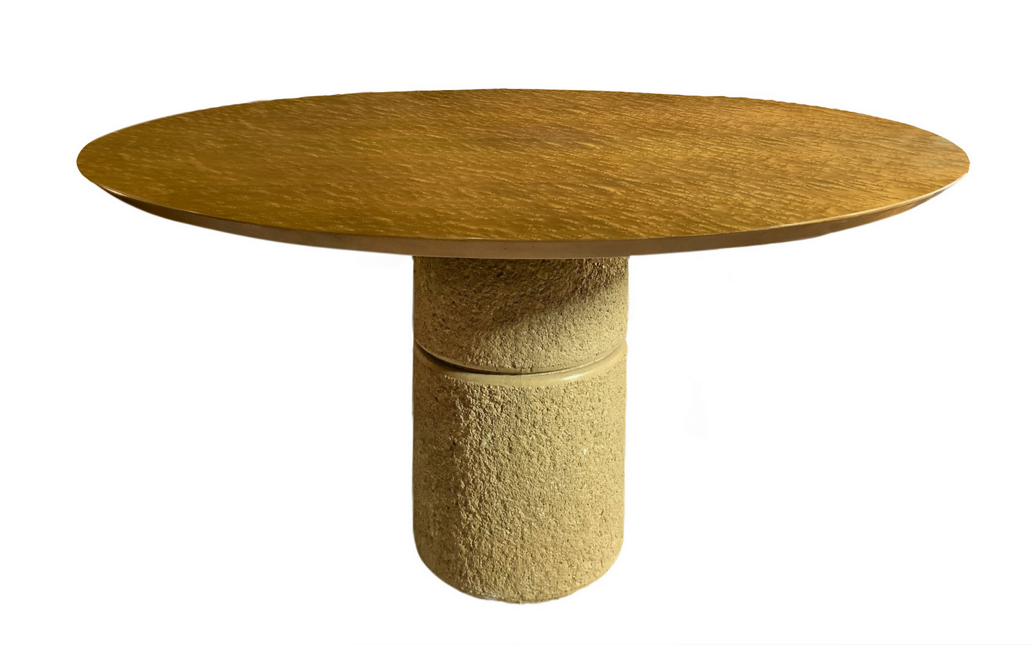 Saporiti, tavolo disegno Giovanni Offredi, modello Paracarro. Anni '80,Piano in legno di forma circolare rivestito in radica di olmo acrilicata nei toni del marrone, piede in cemento