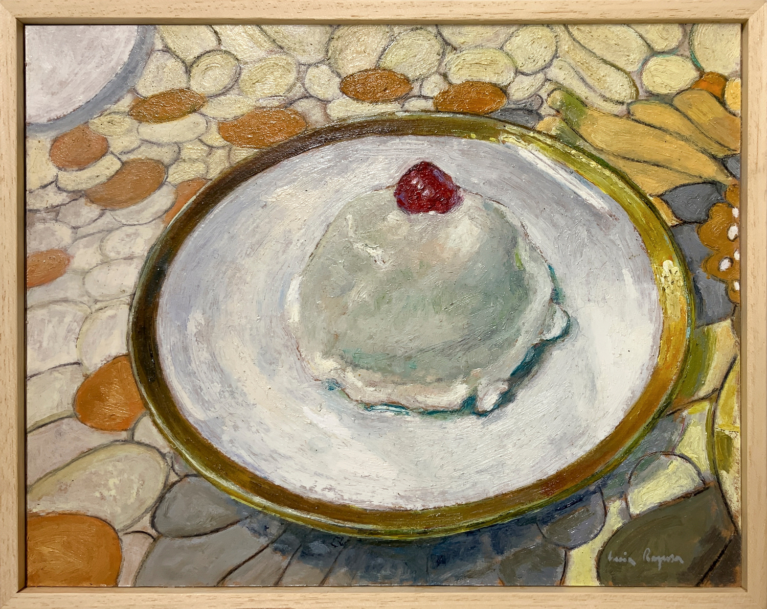 Dipinto ad olio su tavoletta raffigurante cassatella catanese "Minne di Sant'Agata". omaggio a Sant'Agata. Firmato in basso a sinistra Lucia Ragusa e datato sul retro 2020