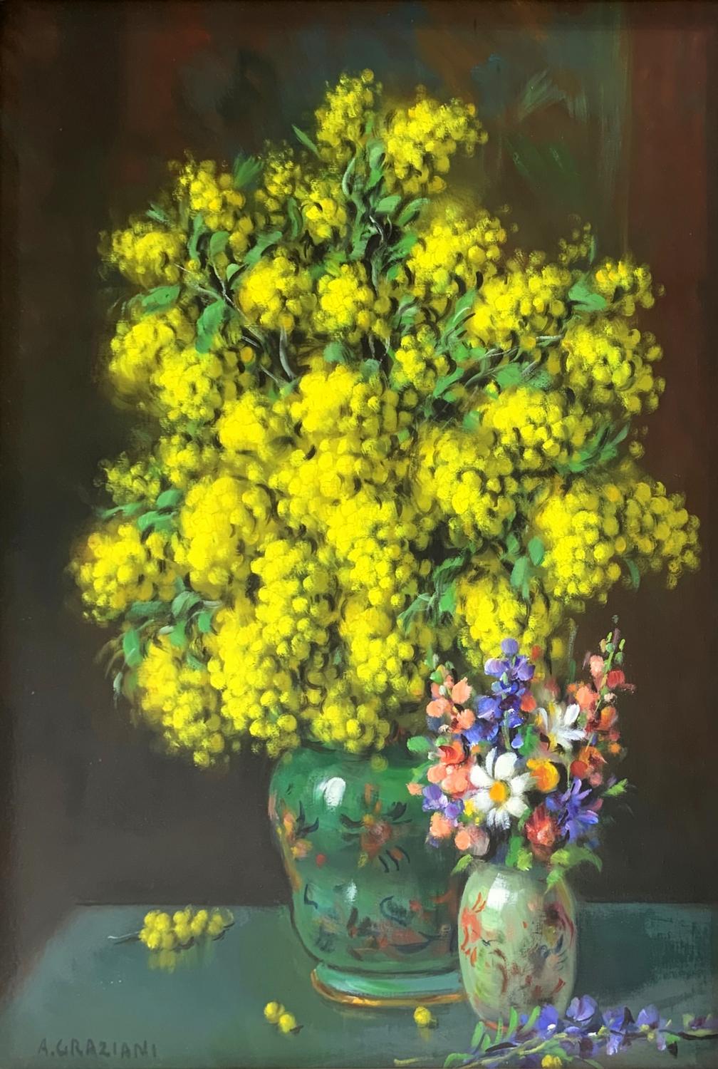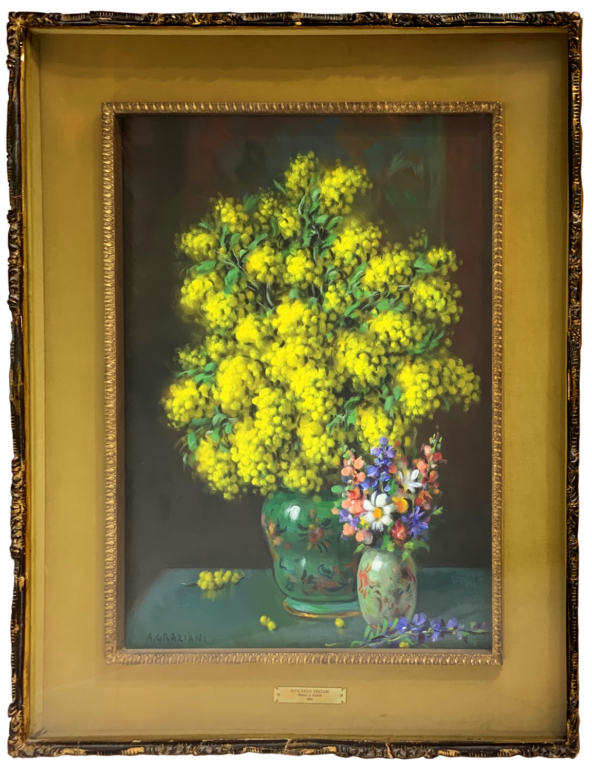 Dipinto ad olio su tela raffigurante “Mimose con violette, firmato in basso a sinistra A. Graziani. Alfio Paolo Graziani (Roncoferraro 1900-Gavirate 1981).