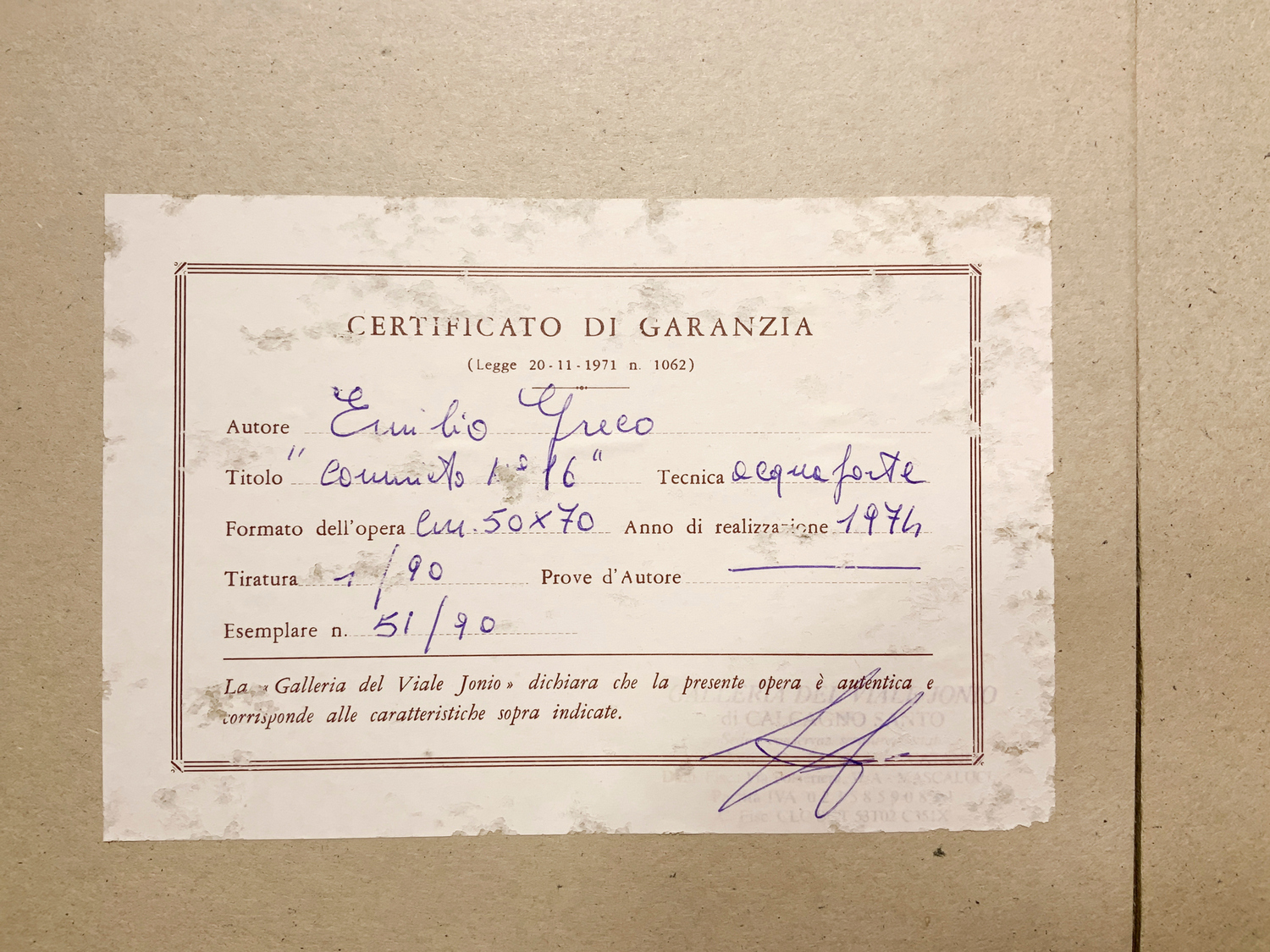 Emilio Greco, Acquaforte "Commiato". 1974,In bella cornice, tiratura 51/90 Cm...