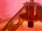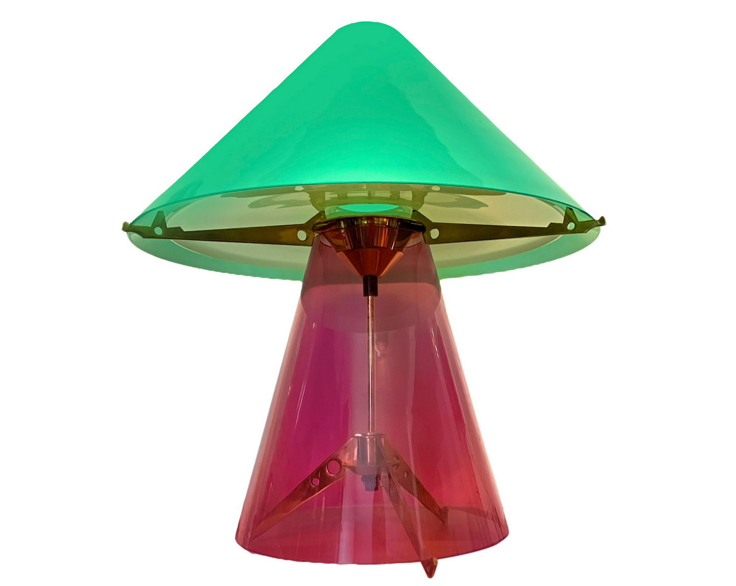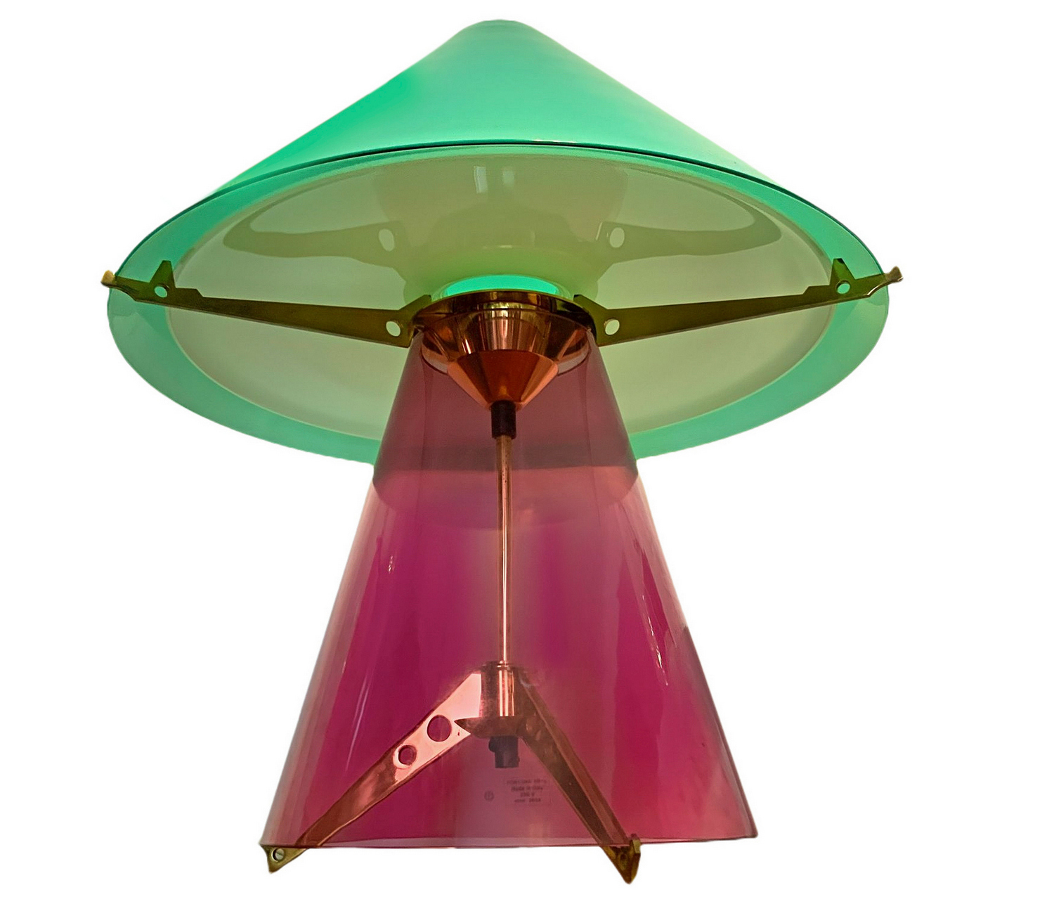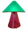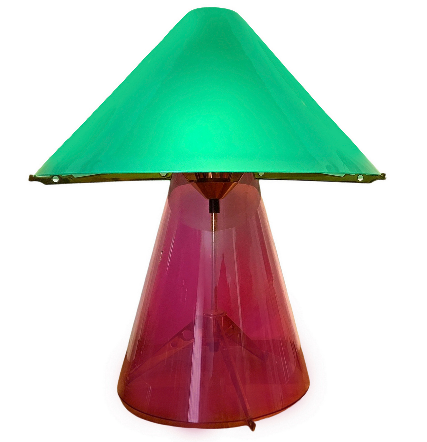 Produzione Fontana Arte, disegno Umberto Riva, modello Metafora. Lampada da tavolo. Anni ’70,struttura in vetro nei toni del rosa trasparente e del verde. Dettagli in ottone zapponato.