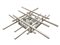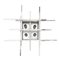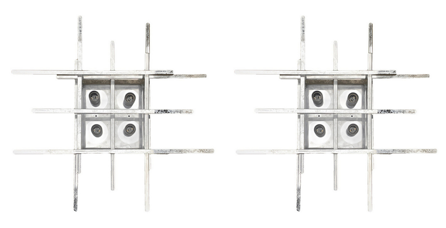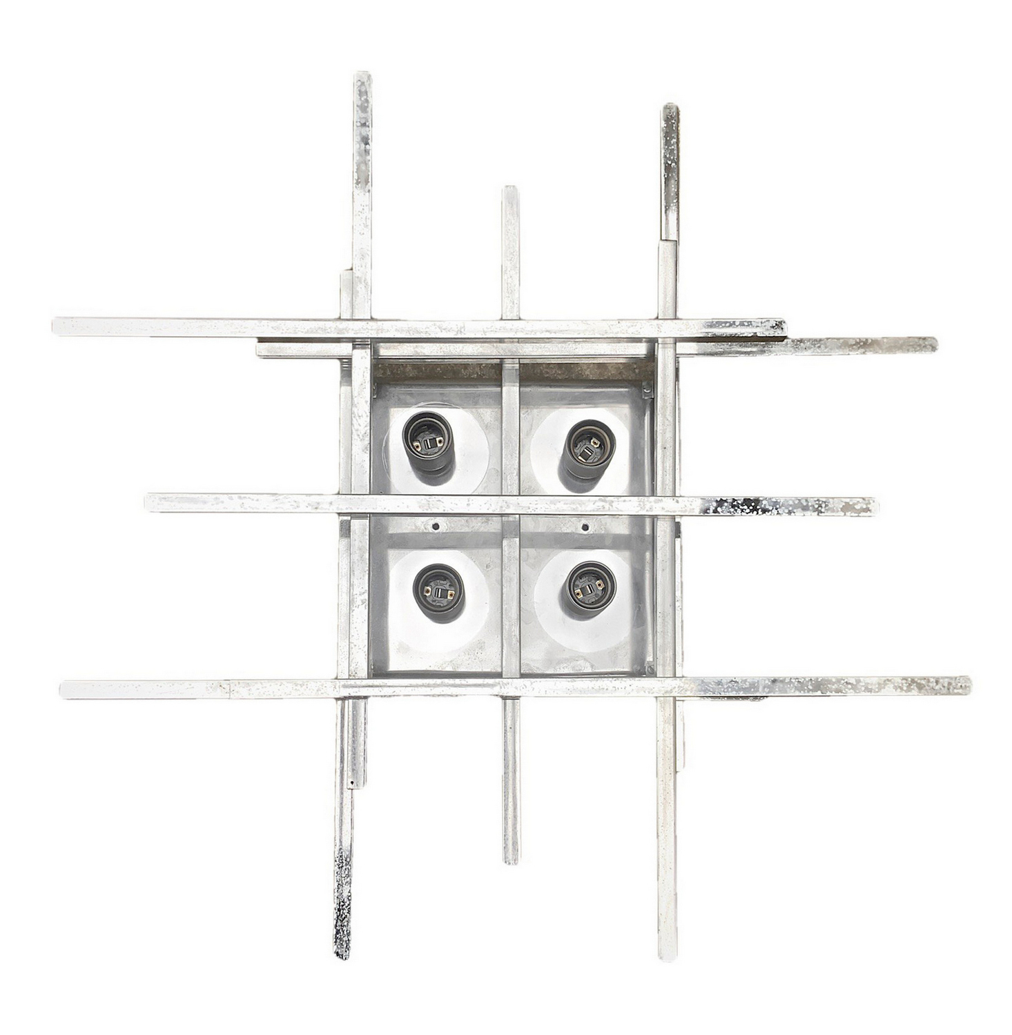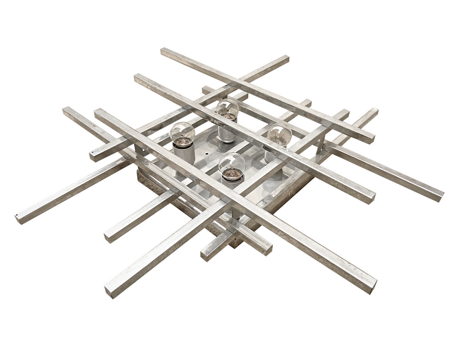 Produzione Sciolari Roma, su disegno di Gaetano Sciolari, coppia di plafoni a quattro luci. Anni ’70,struttura in metallo cromat. Da rielettrificare e tracce di ossidazione.
