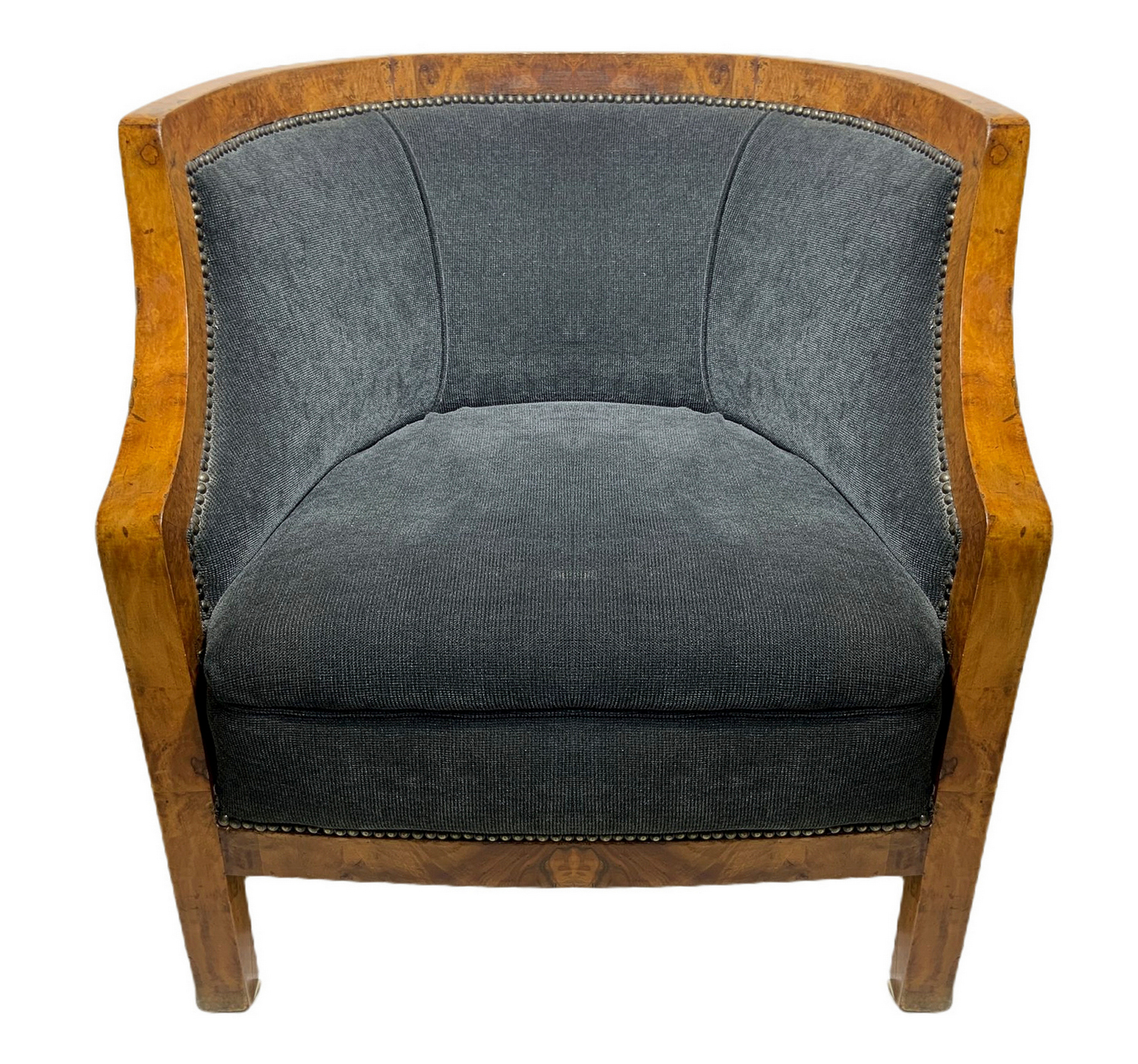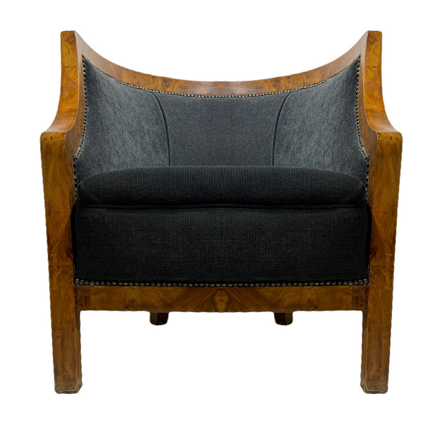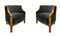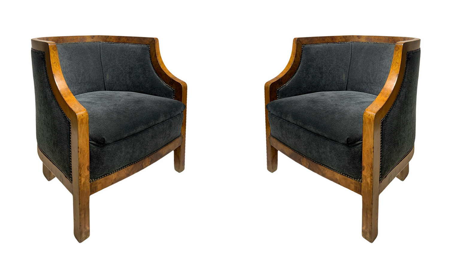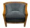 Produzione italiana, coppia di poltroncine deco, struttura in legno impiallacciato noce chiara. Italia,sedute nei toni del grigio scuro. Ricondizionate. Segni di uso. H cm 65, larghezza cm 60, profondità cm 50