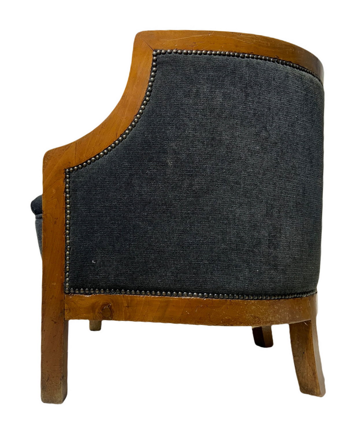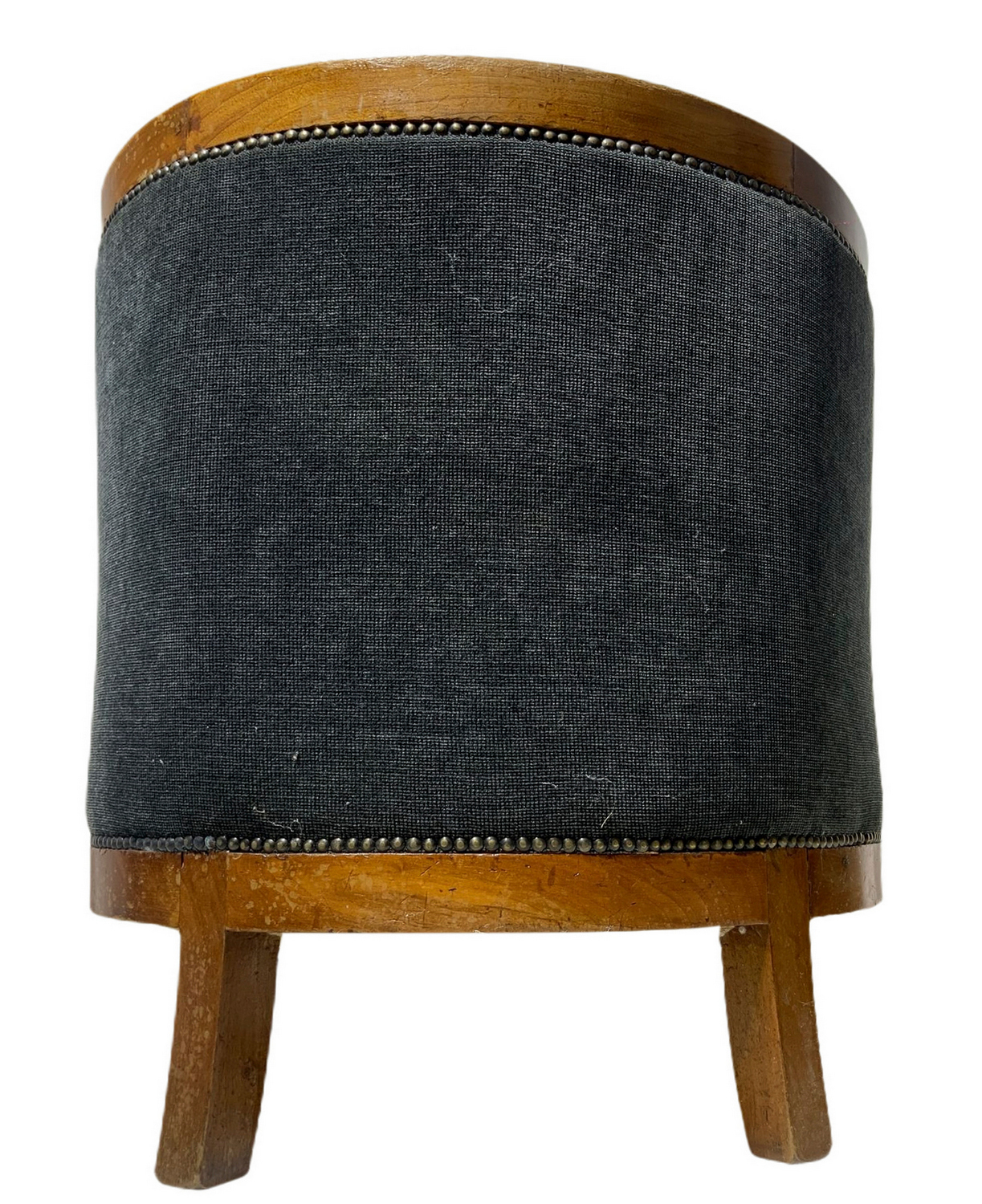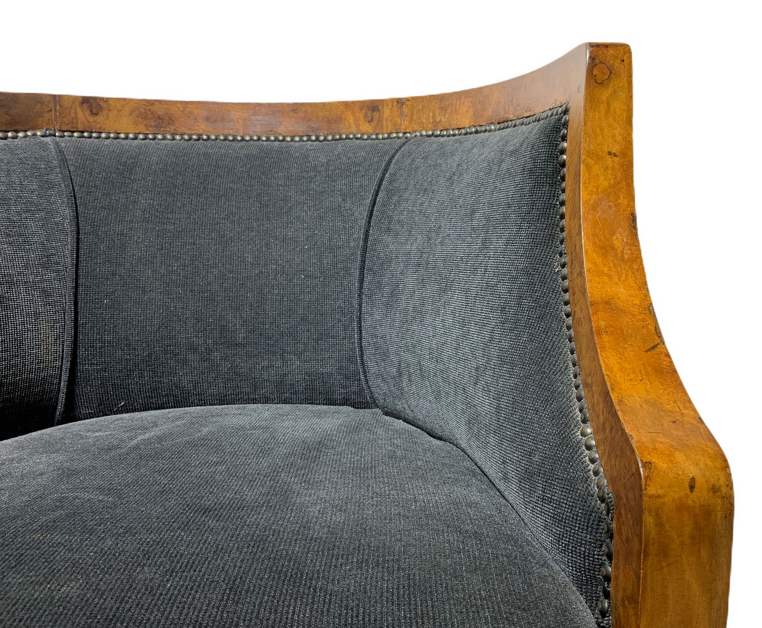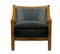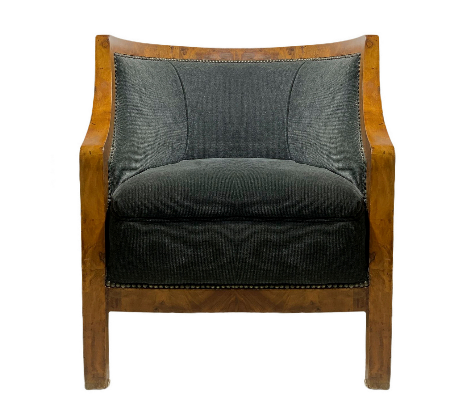 Produzione italiana, coppia di poltroncine deco, struttura in legno impiallacciato noce chiara. Italia,sedute nei toni del grigio scuro. Ricondizionate. Segni di uso. H cm 65, larghezza cm 60, profondità cm 50