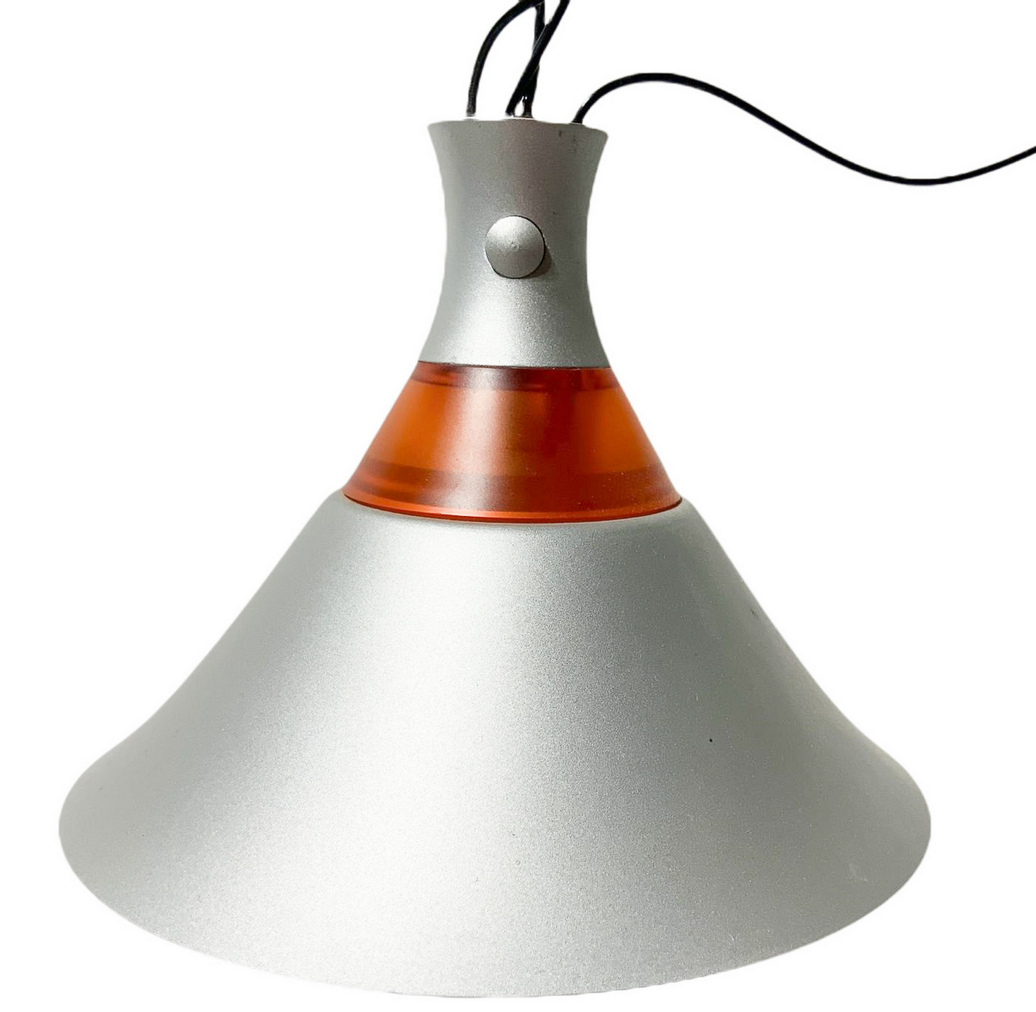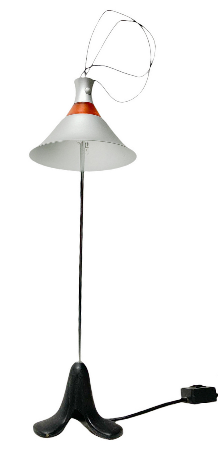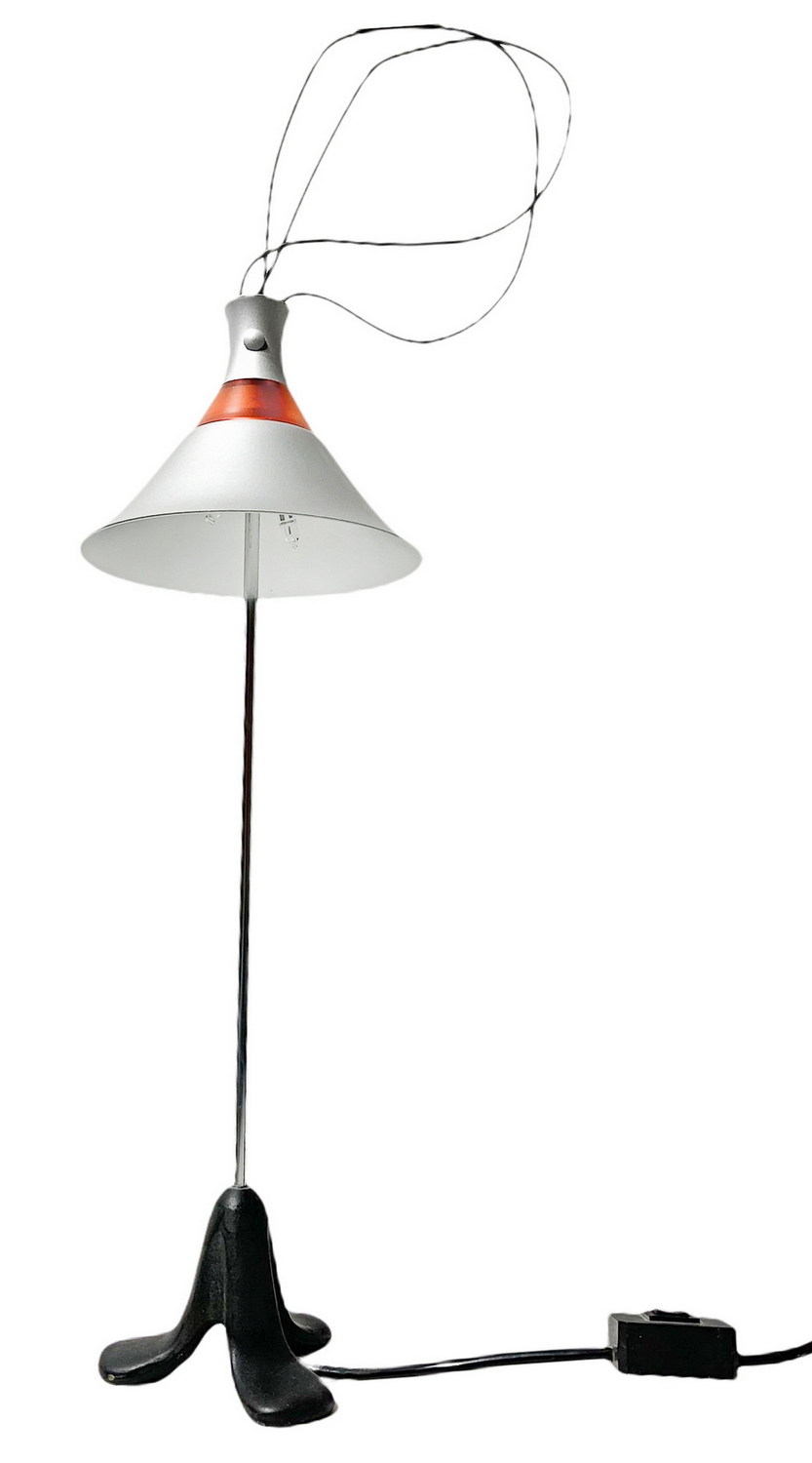 Produzione Italiana. Italia ,Lampada da tavolo con base in ghisa e diffusore in acrilico arancio e alluminio satinato.