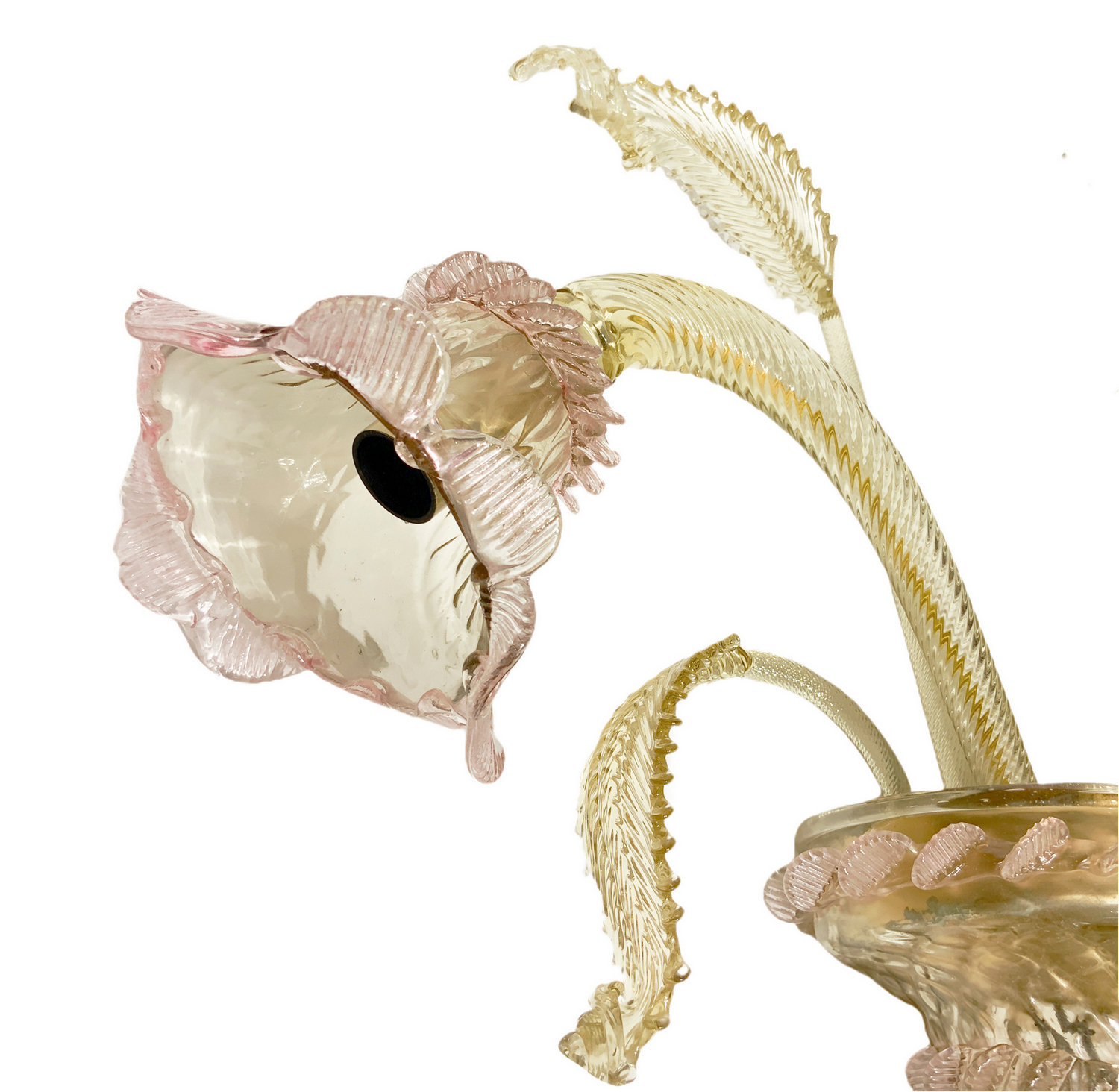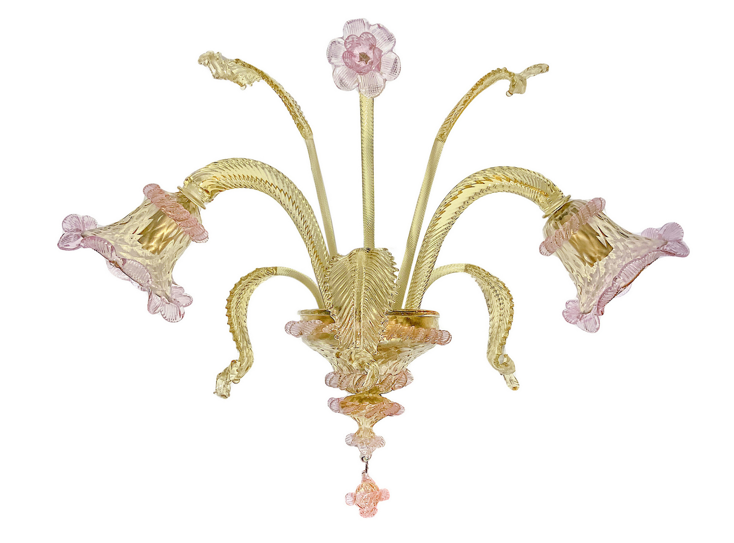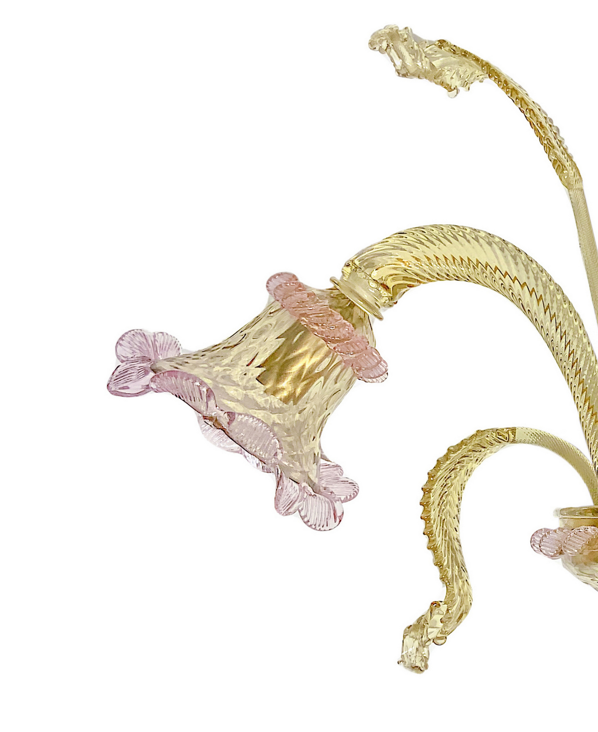 N. 2 appliques, Murano. Italia,in vetro di colore rosa e pagliesco, otto luci lavorazione a foglie e fiori.