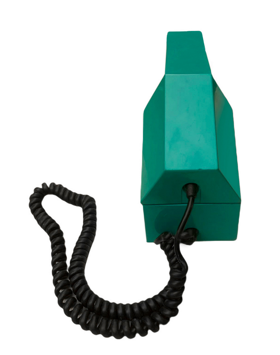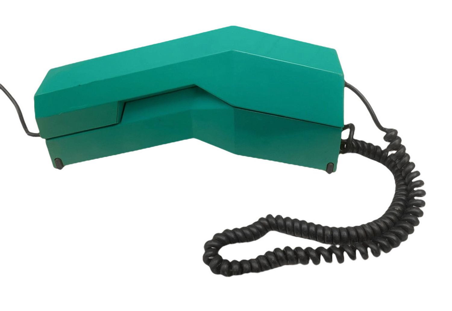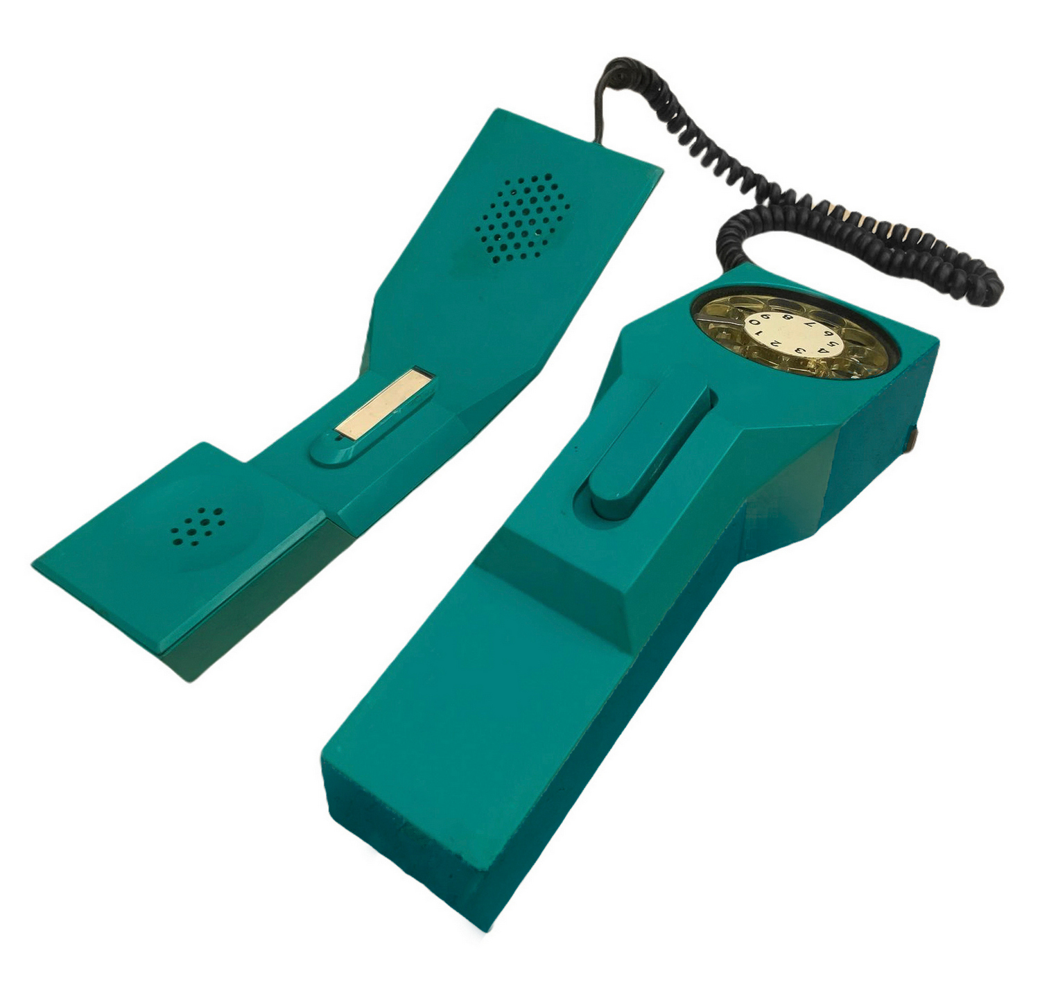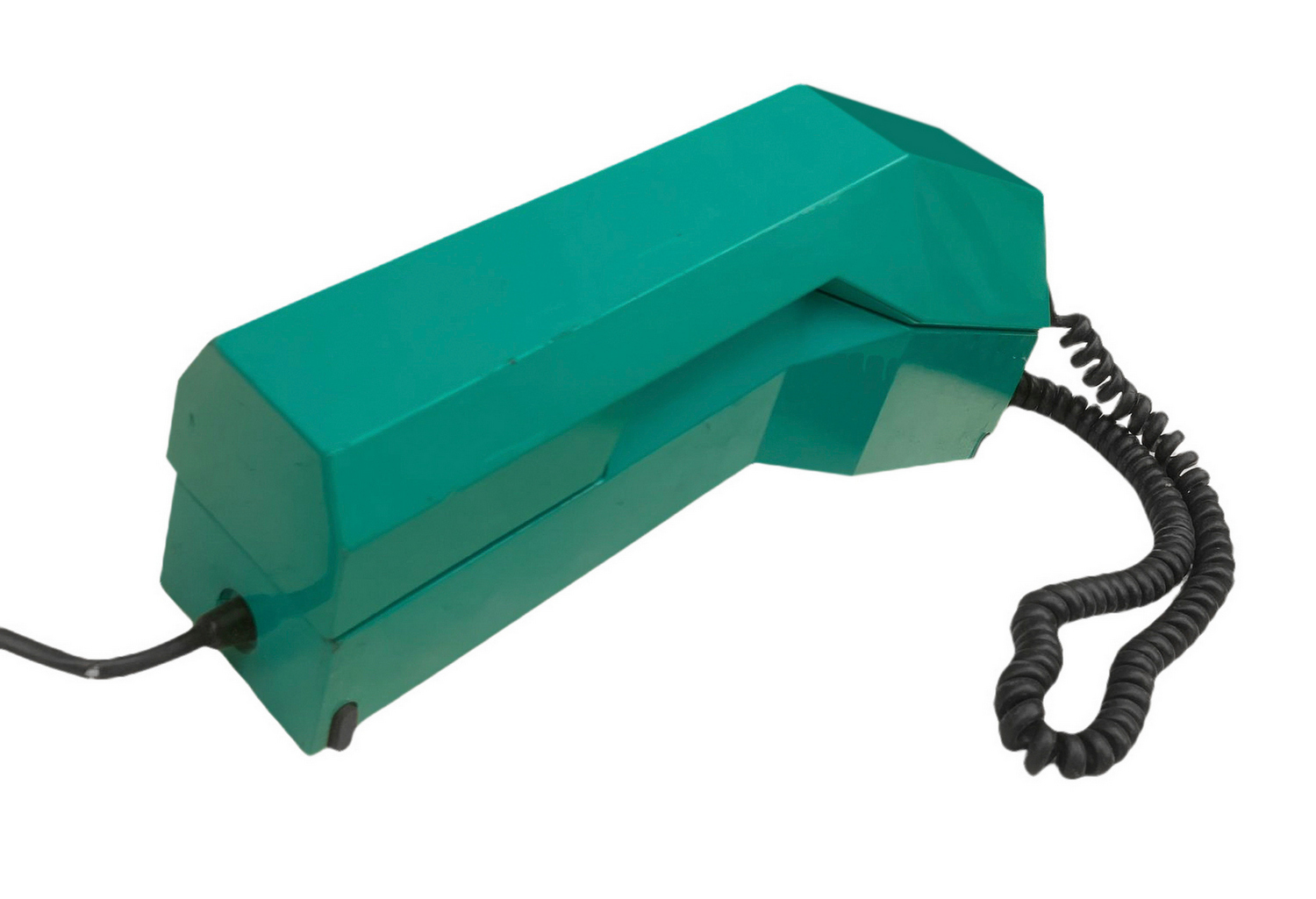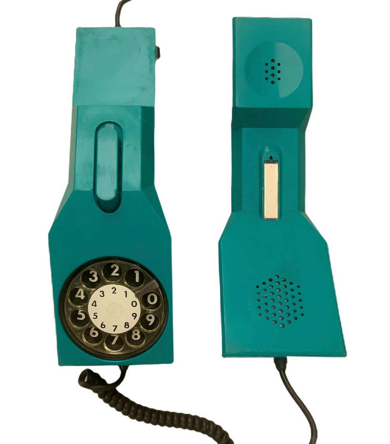 Produzione italiana, apparecchio telefonico in plastica modello diamante nei toni del turchese. Anni ’70,Da testare.