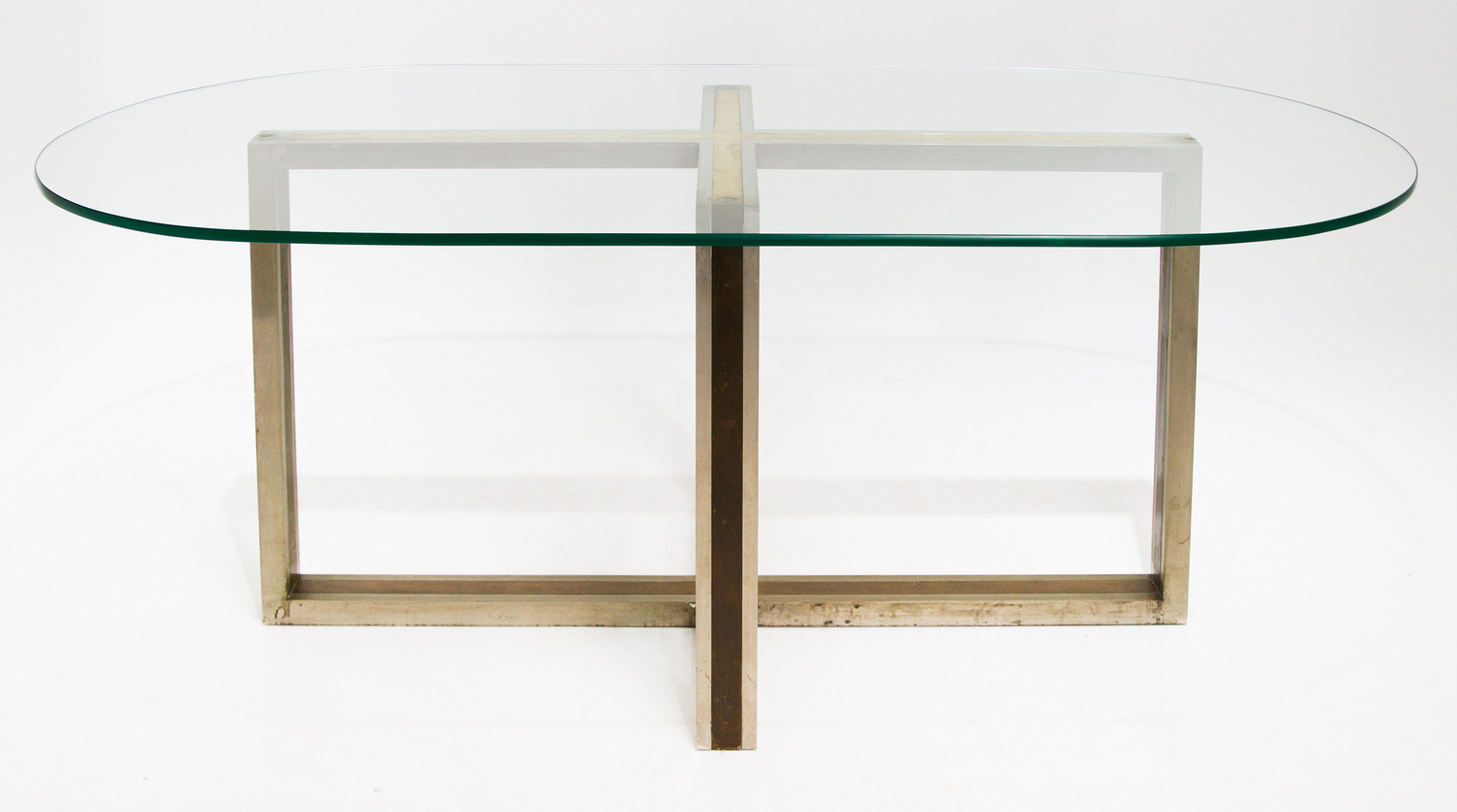 Tavolo in metallo cromato e ottone nello stile di Romeo Rega, piano in vetro.