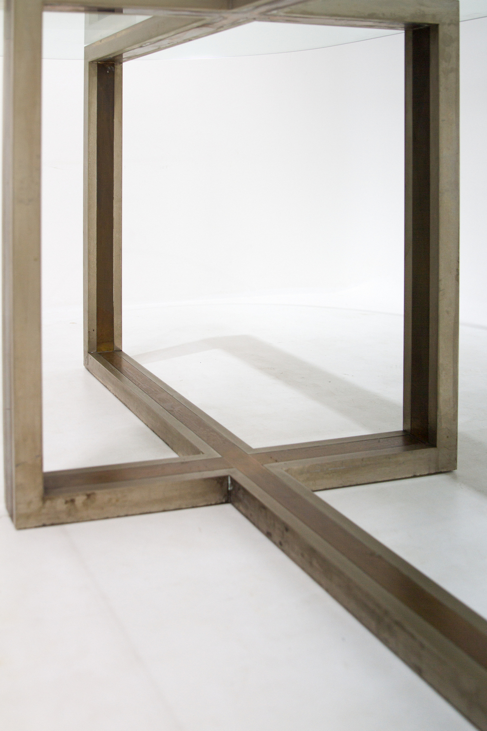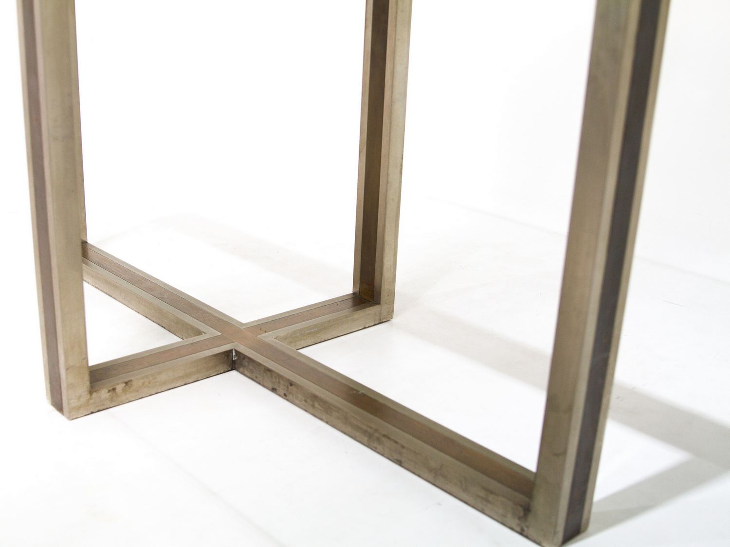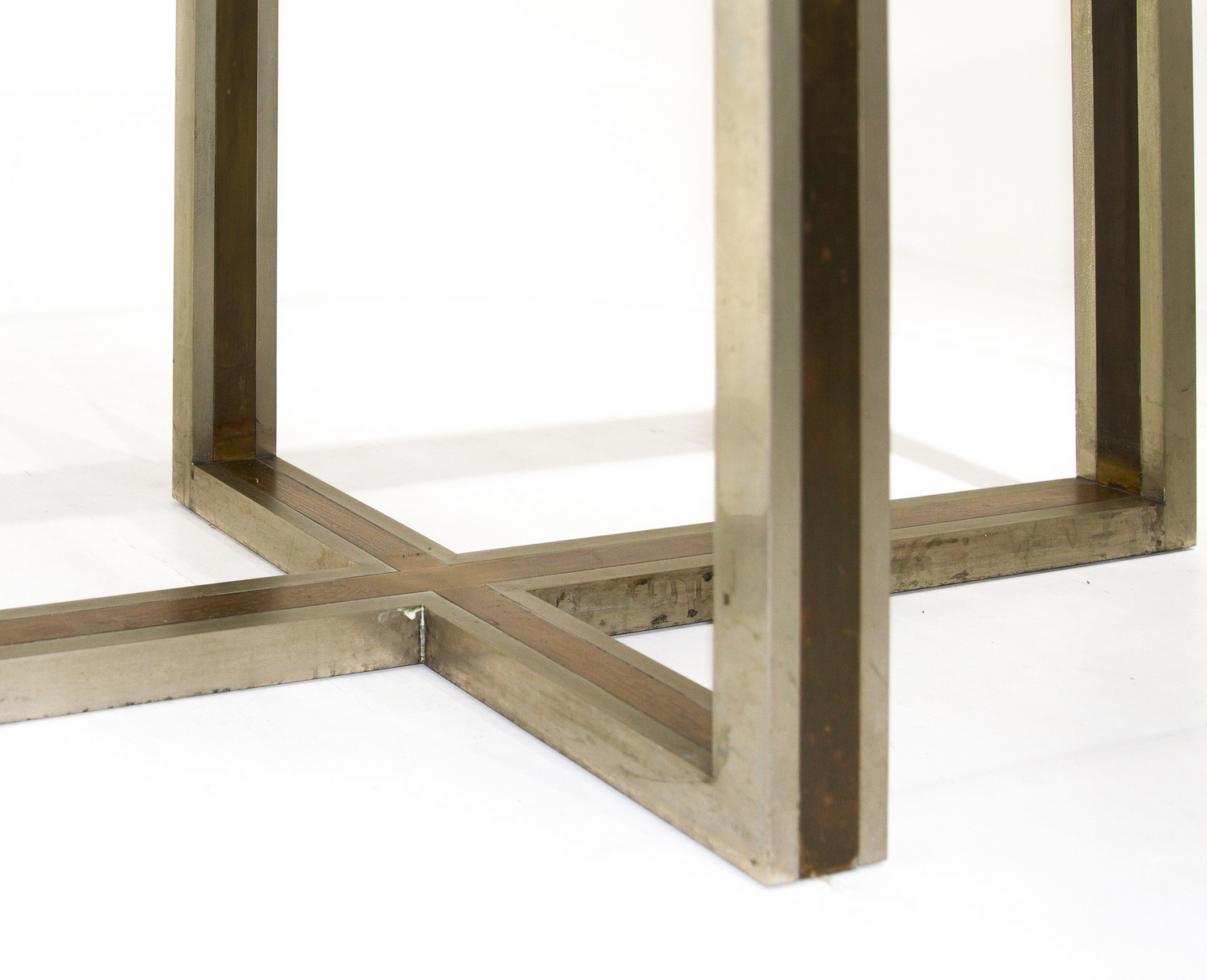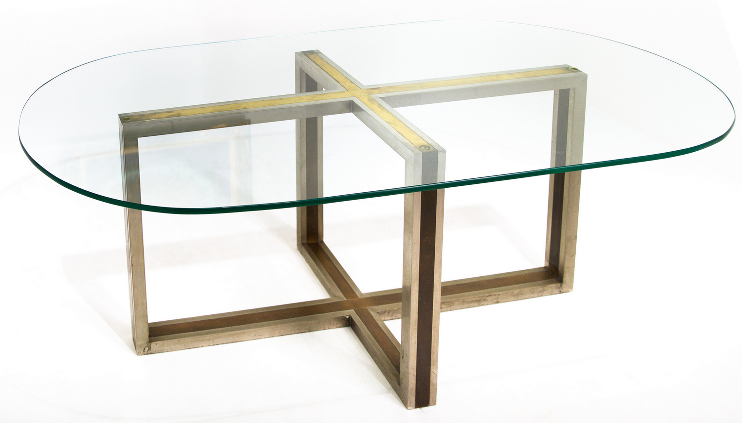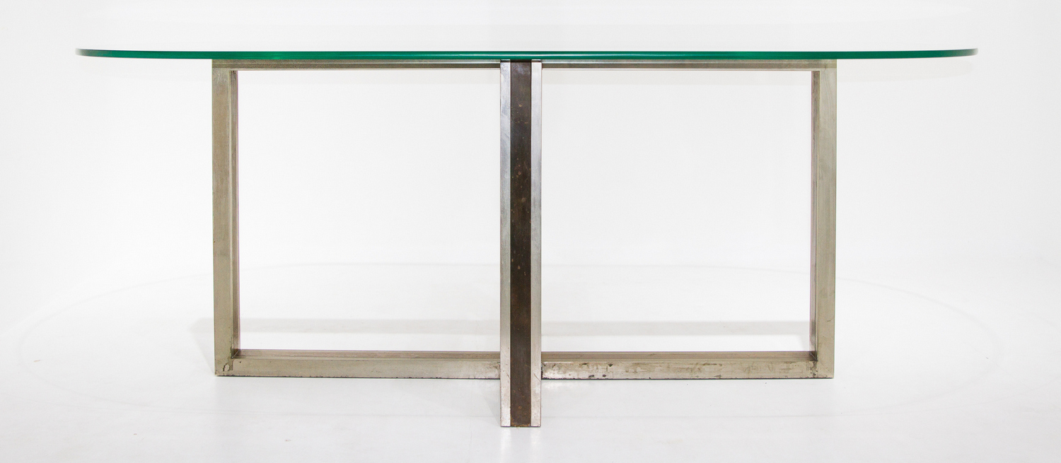 Tavolo in metallo cromato e ottone nello stile di Romeo Rega, piano in vetro....