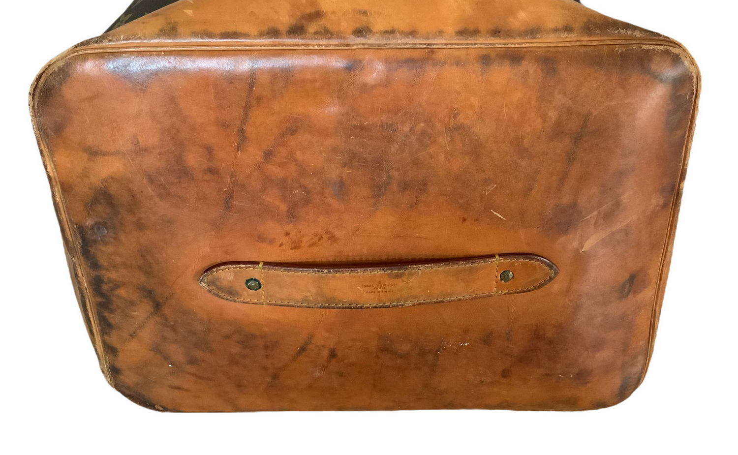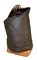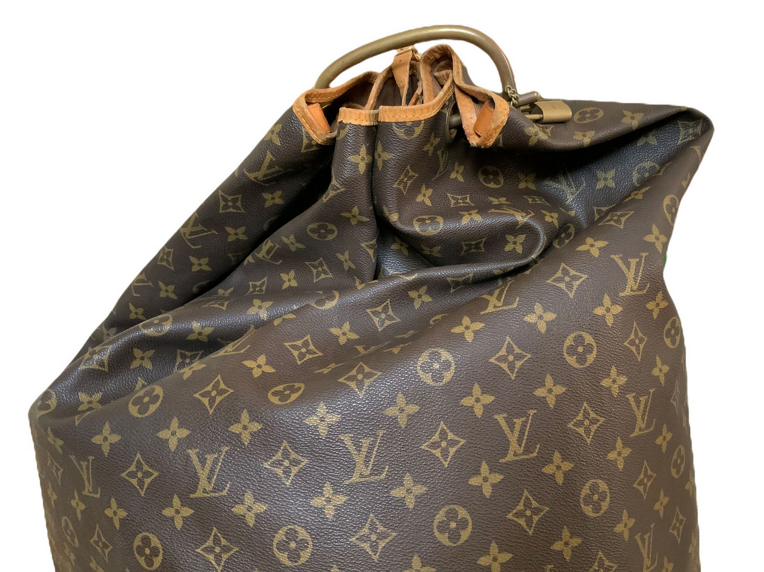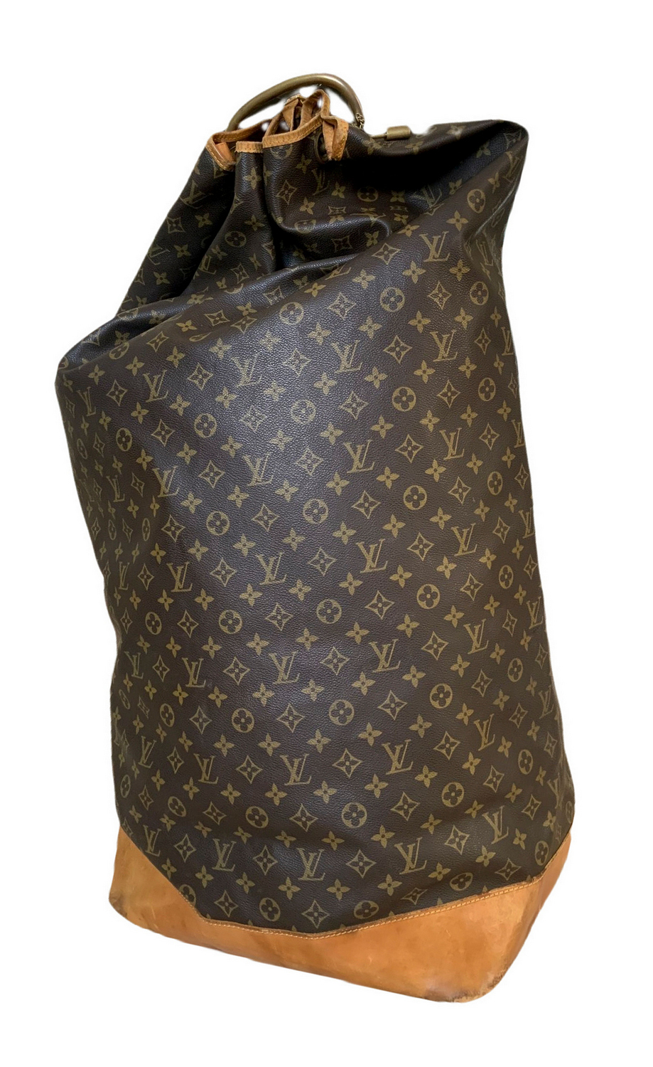 Produzione Louis Vuitton, sacca da marinaio, in vinile riportante monogrammi della manifattura. Anni ’60,Dettagli in cuoio color cognac e ottone. Segni di uso.