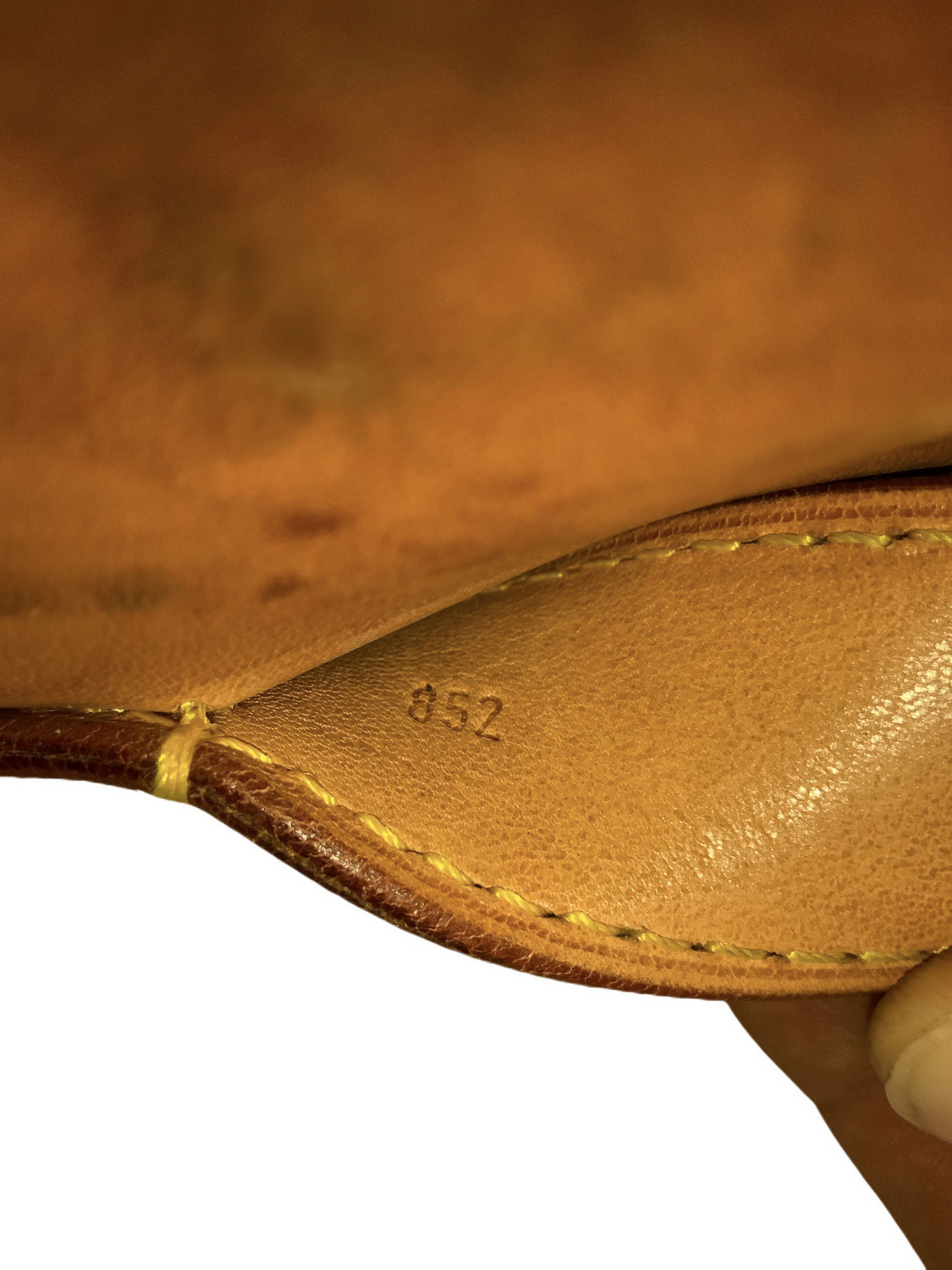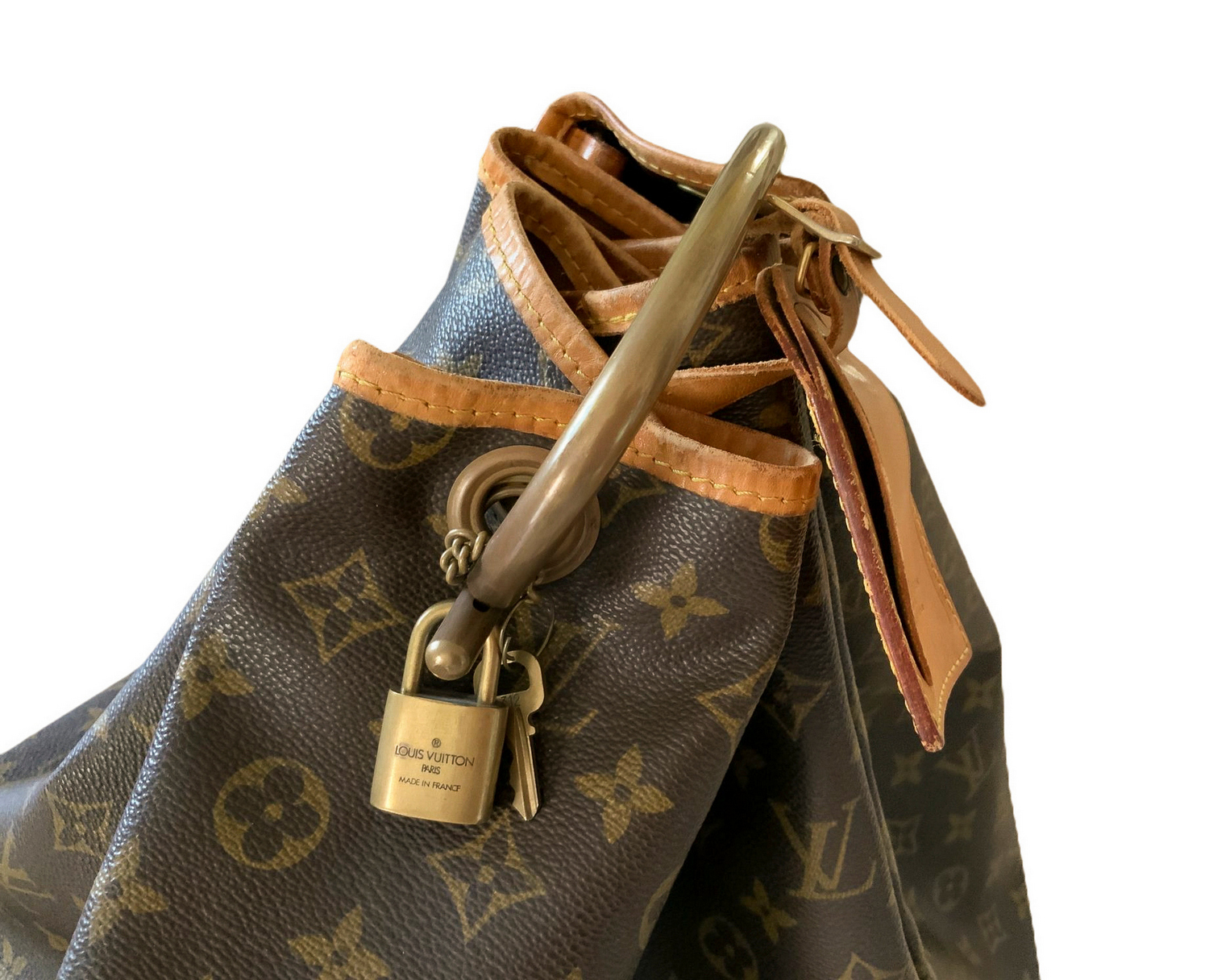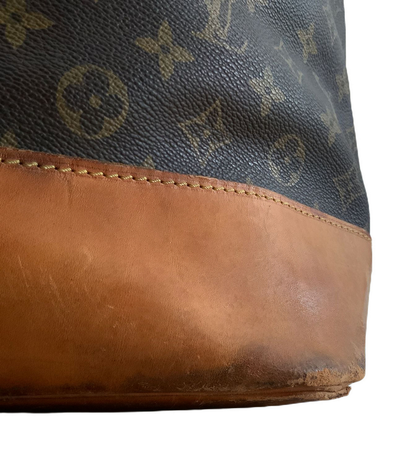 Produzione Louis Vuitton, sacca da marinaio, in vinile riportante monogrammi della manifattura. Anni ’60,Dettagli in cuoio color cognac e ottone. Segni di uso.