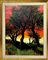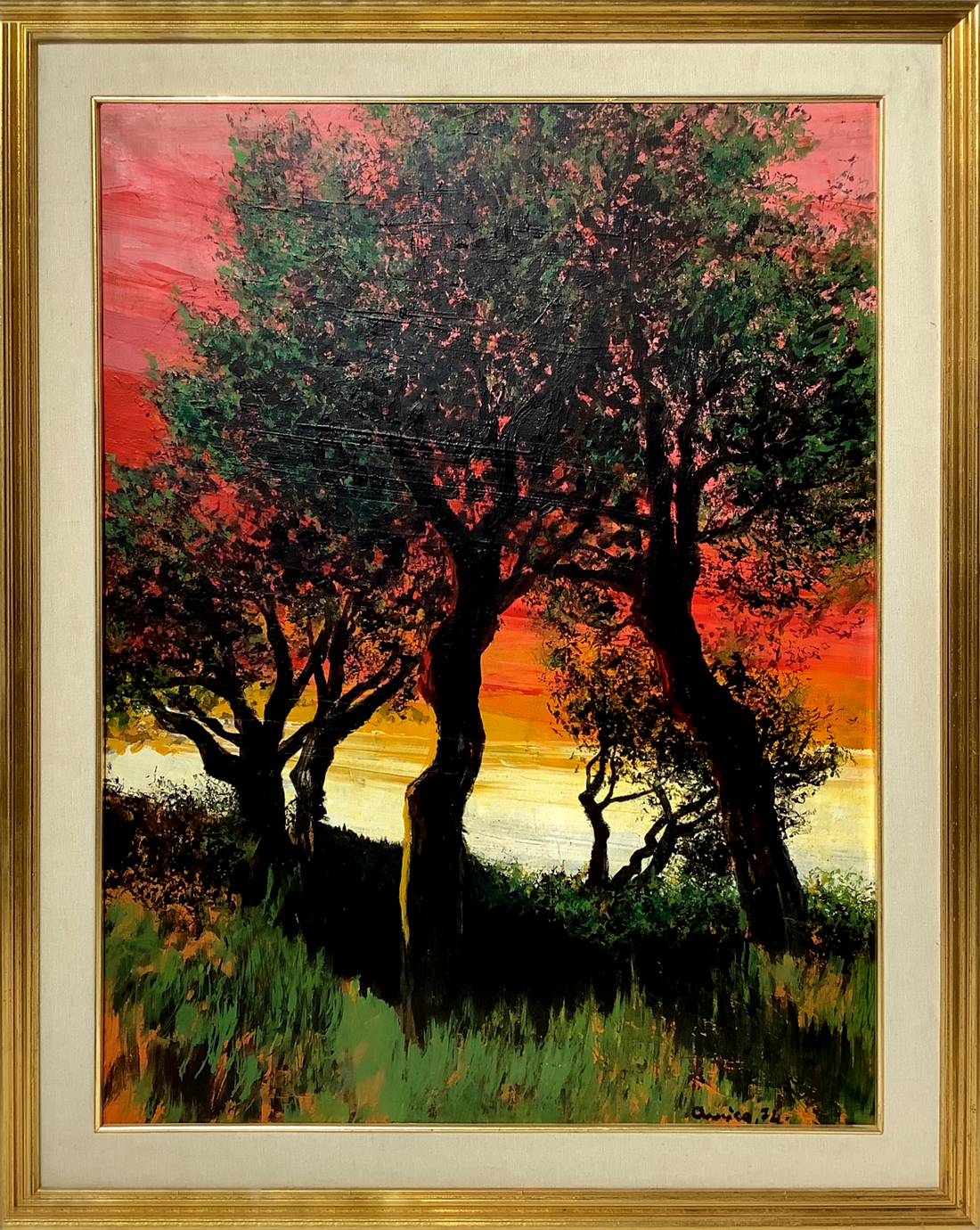 Dipinto ad olio su tela raffigurante paesaggio con alberi al tramonto. Firmato in basso a sinistra Amico 74