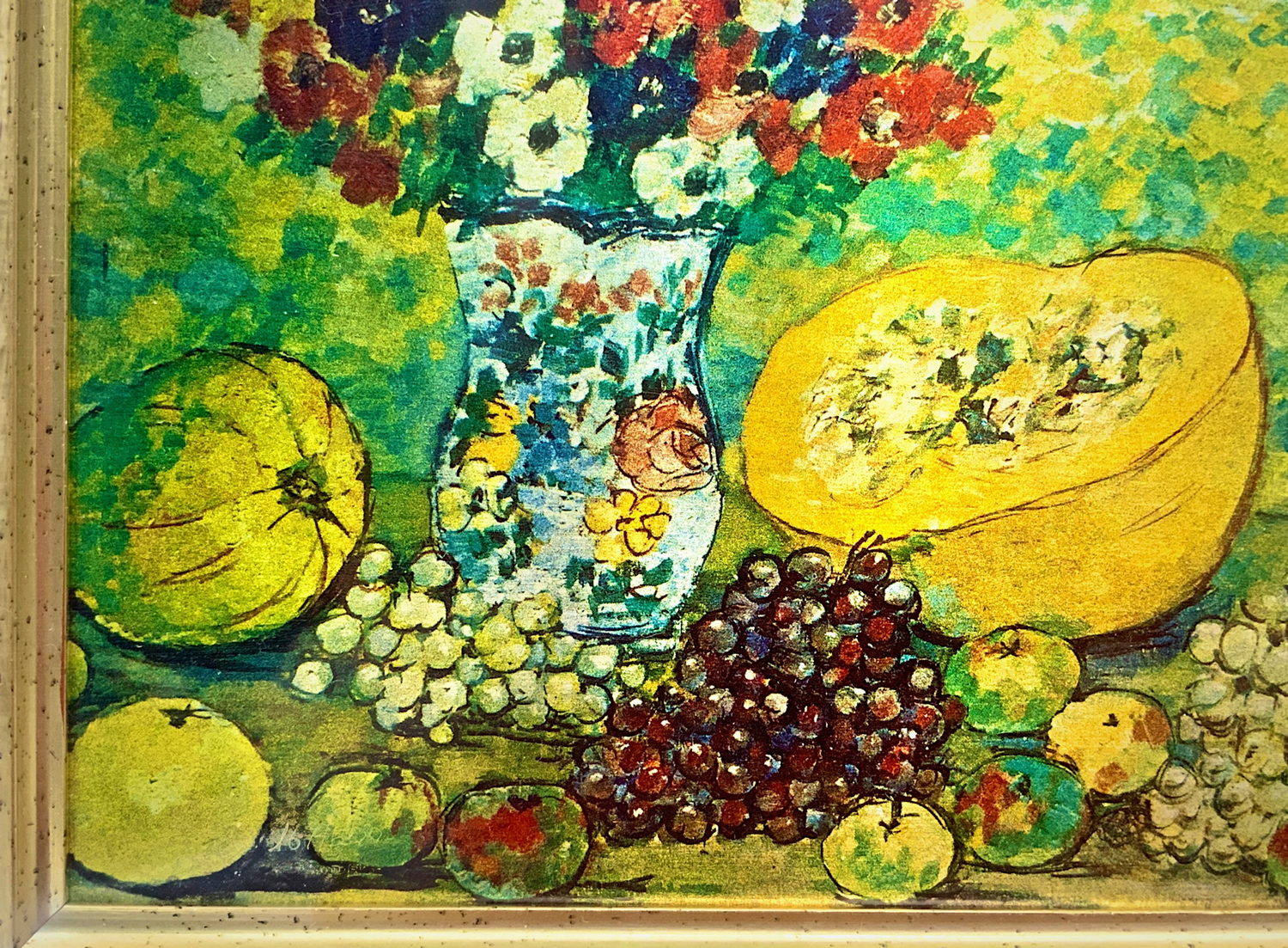 Litografia su rivestimento in argento raffigurante natura morta di frutta e fiori, 167/500. Firmata Michele Cascella.