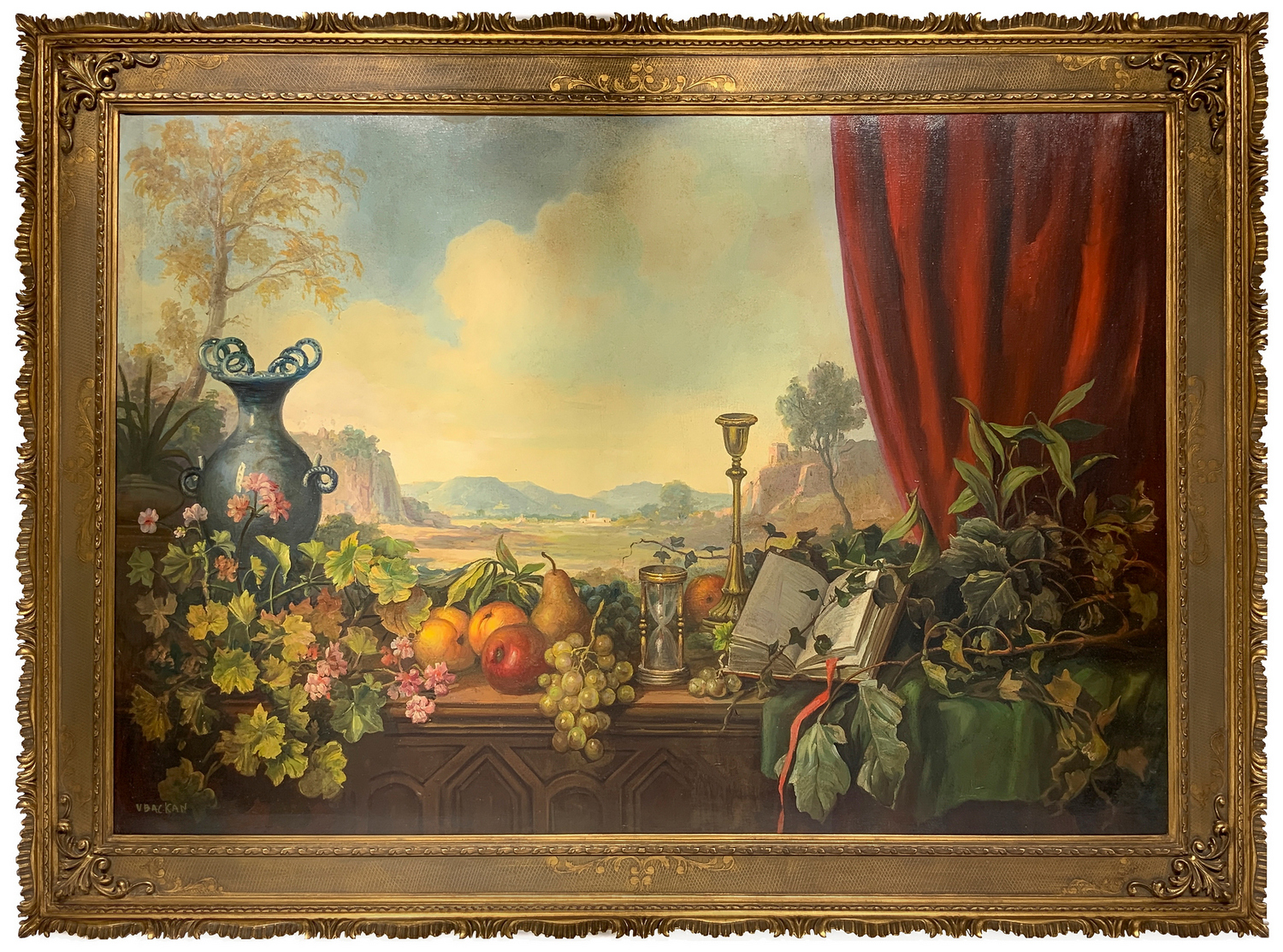 Olio su tela raffigurante natura morta di frutta con paesaggio. Firmato UvacKan.