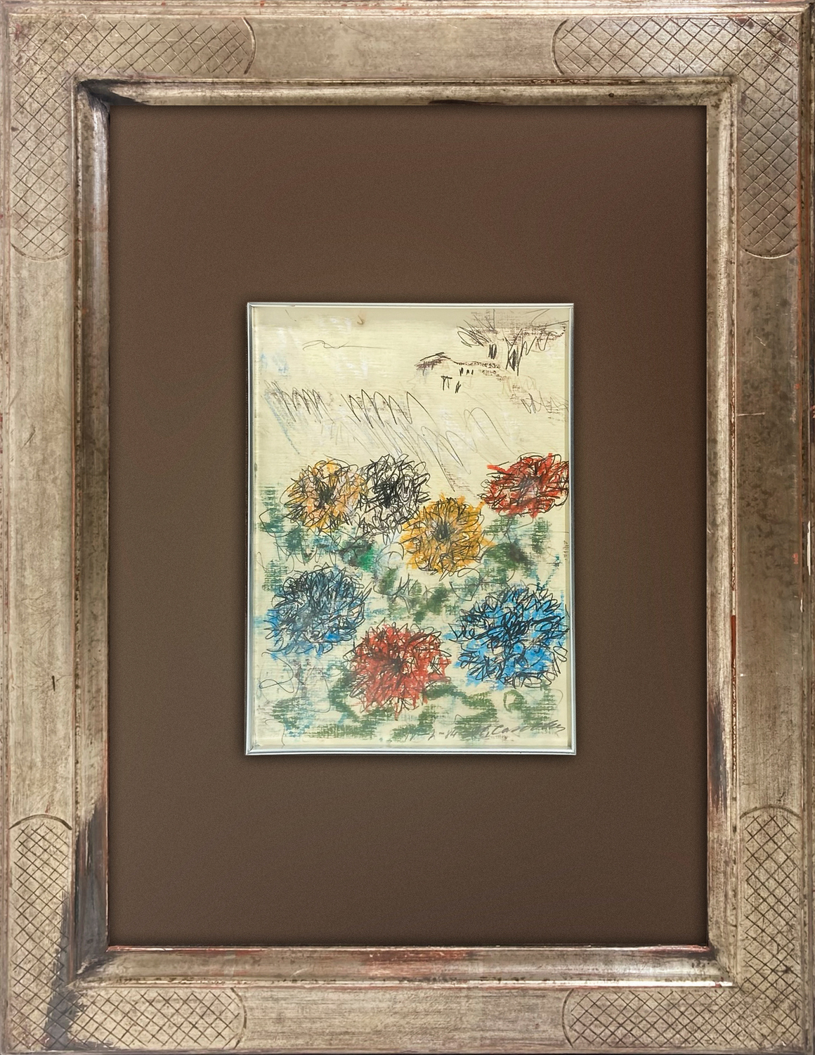 Dipinto tecnica mista matita carboncino e pastello, carta applicata a tela raffigurante fiori. firmato e datato Michele Cascella 11/02/84.