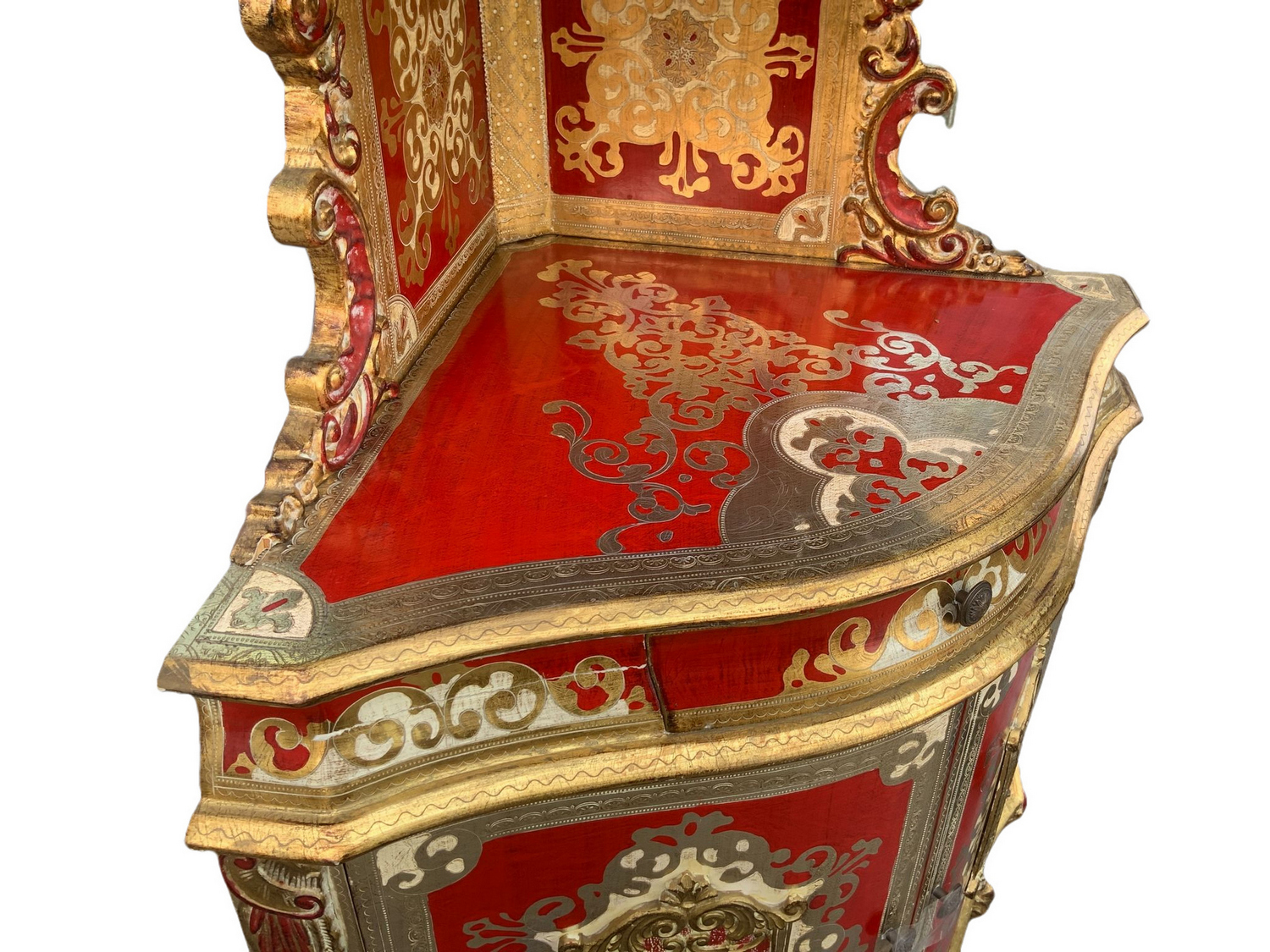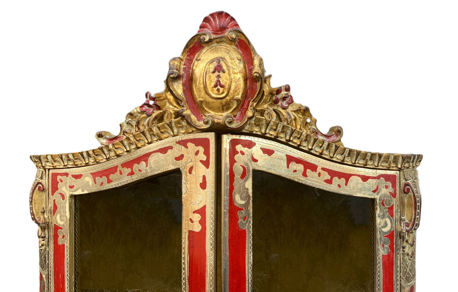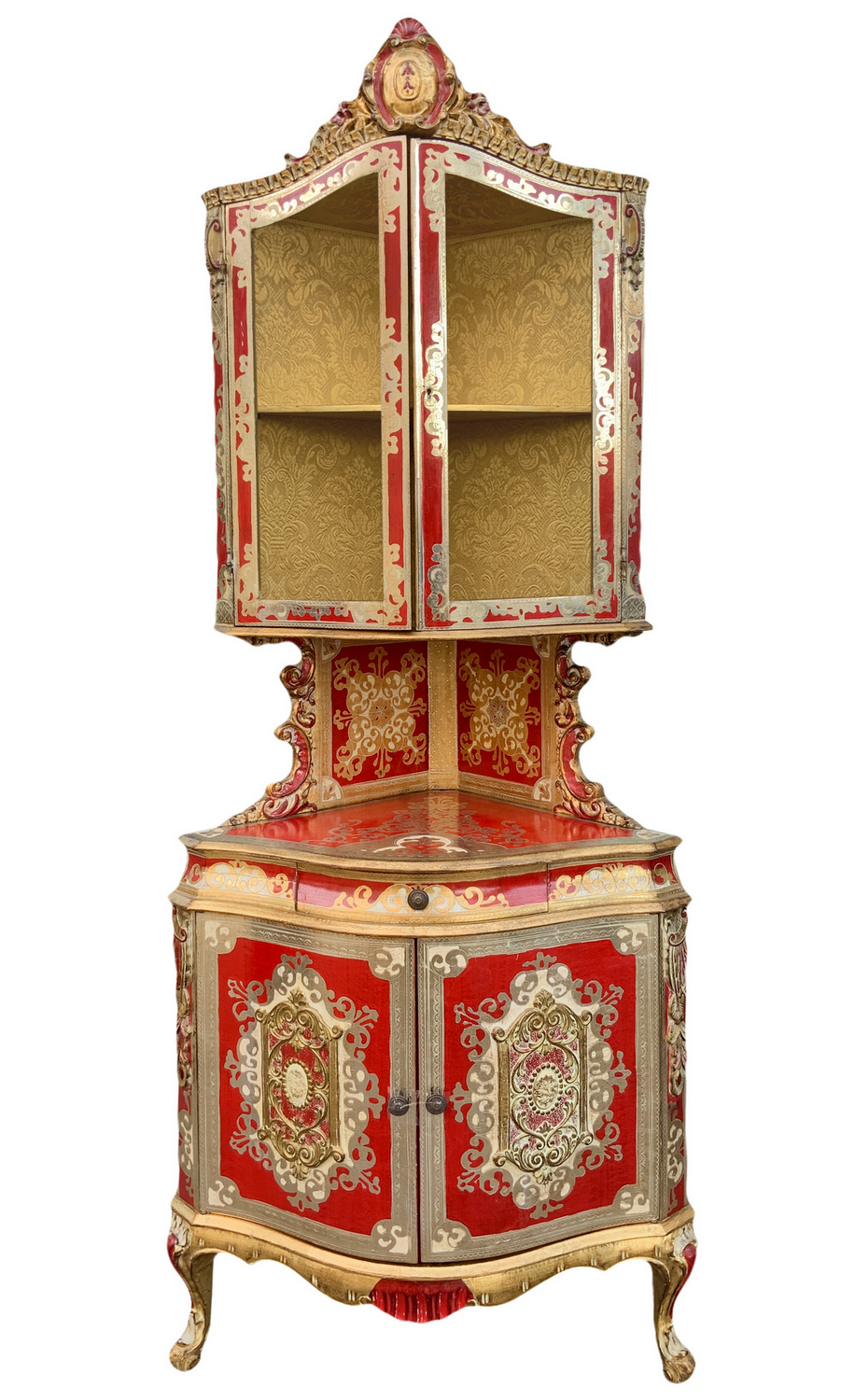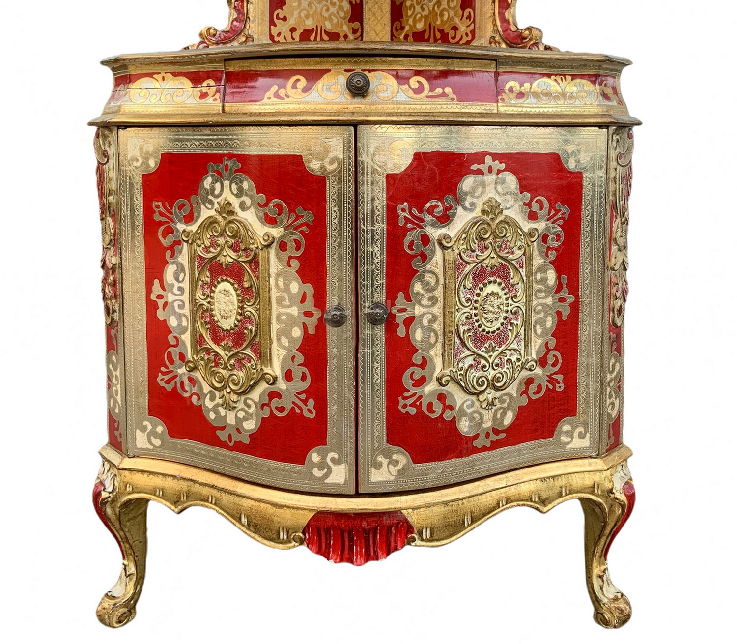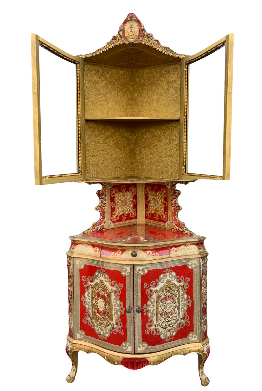 Angoliera in stile neoclassico. riproduzione fiorentina a due corpi laccata in rosso, oro e bianco corpo inferiori a due sportelli, corpo superiore due ante a vetri. H cm.210, larghezza cm 80, profondità cm 55