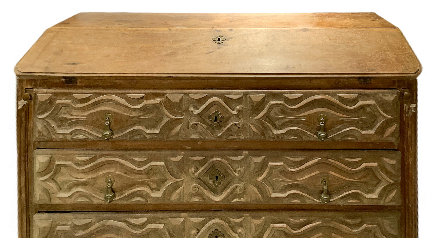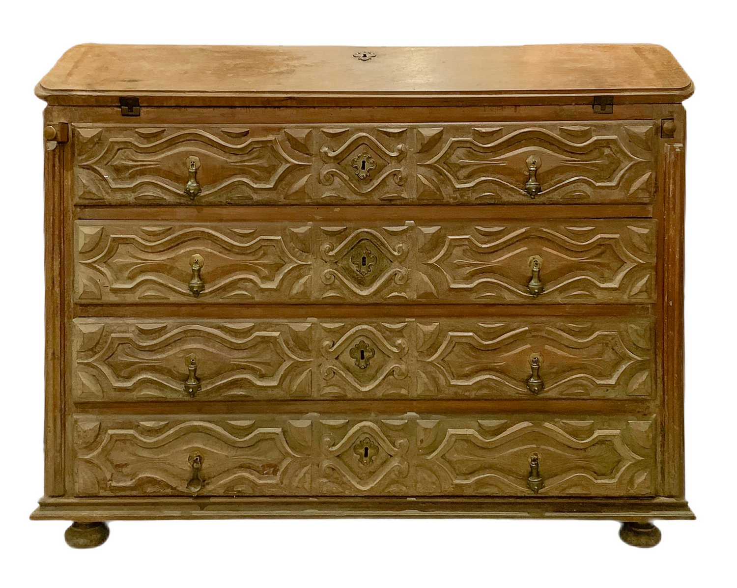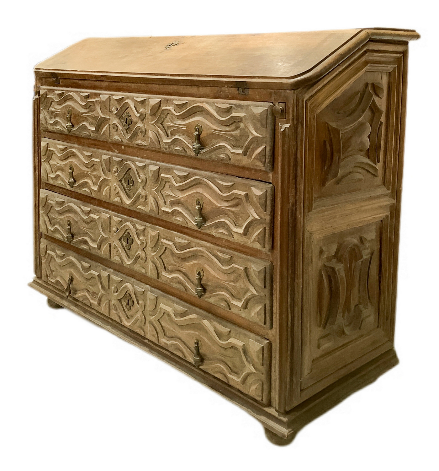 Ribalta in legno di rovere, Francia , XVIII secolo. Sul fronte quattro cassetti intagliati in tre sezioni con forma oblunga recante pendente a tiretto e al centro bocchetta a forma di giglio. Sui fianchi intagli divisi in due grandi sezioni. Ferramenta originali, piedi rotondi schiacciati.