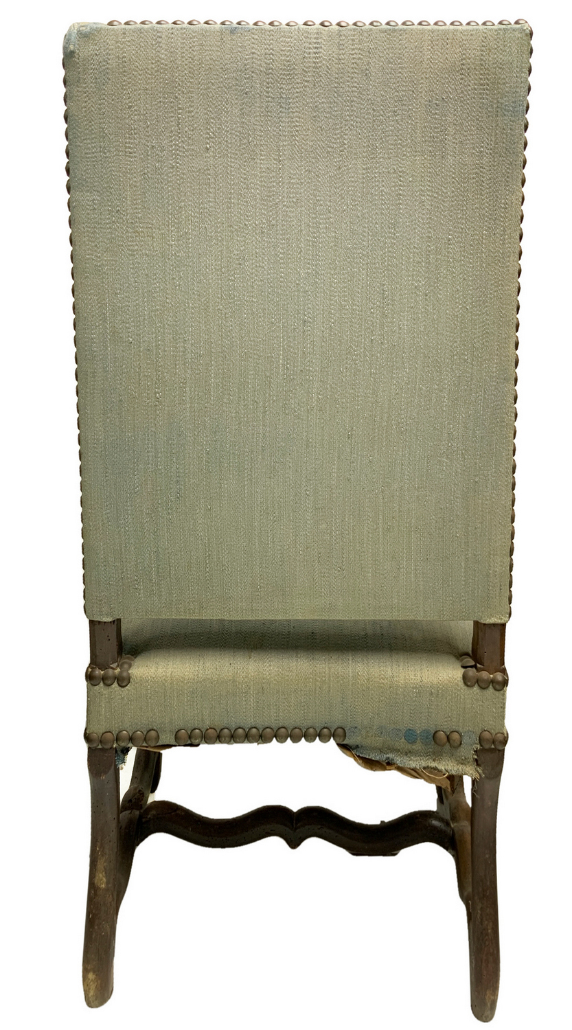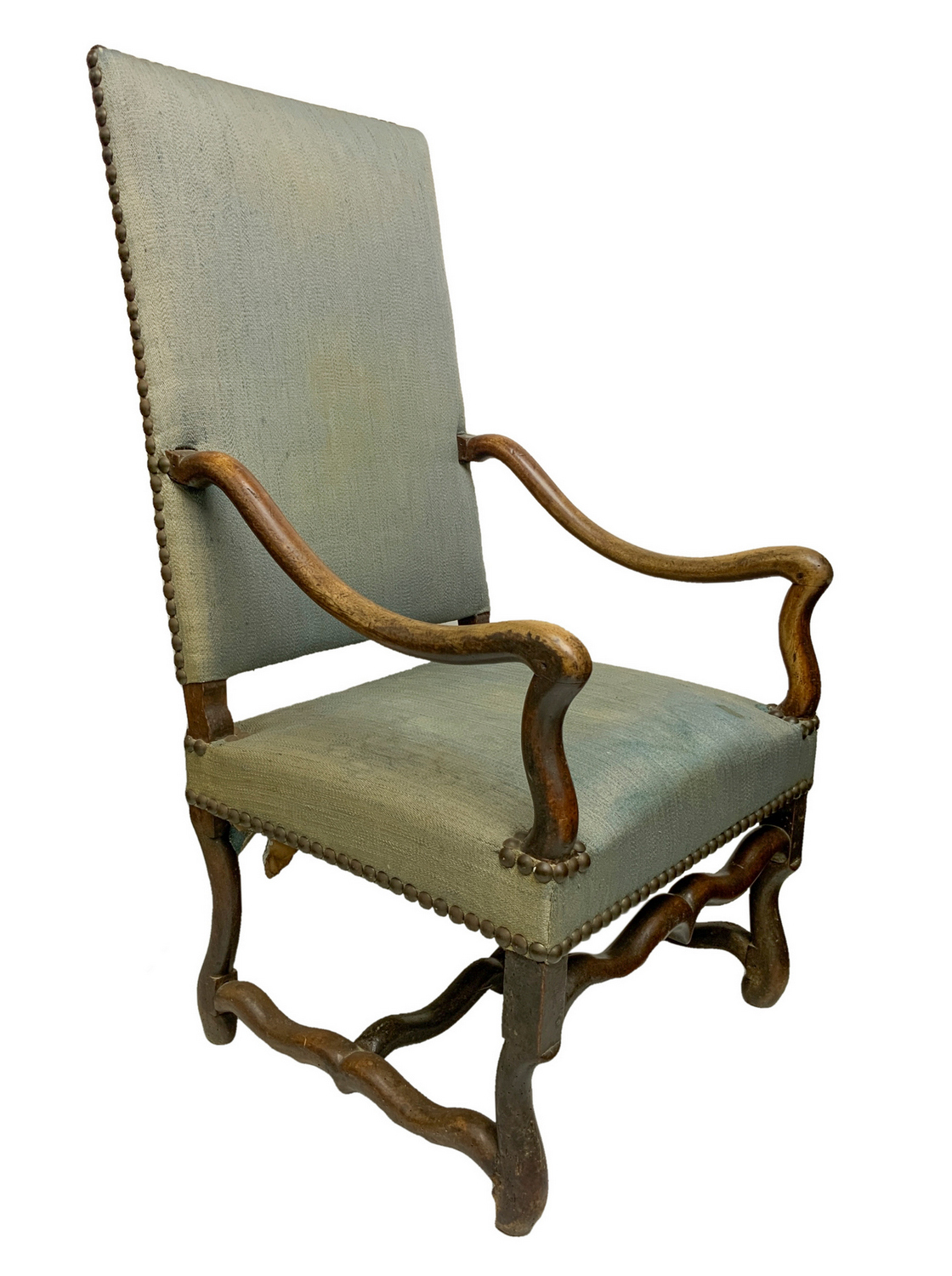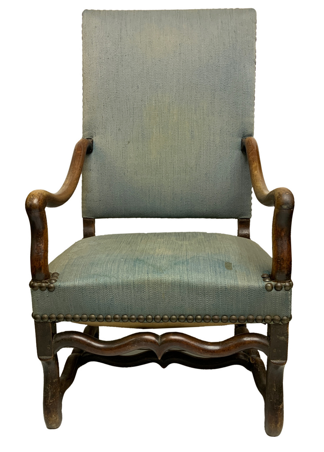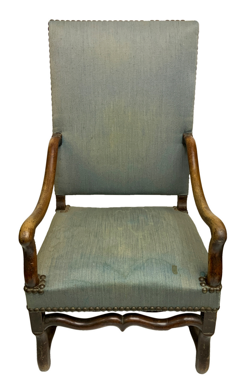 Poltrona in legno di noce, XVII/ XVII secolo. Con schienale a cartella rettangolare, braccioli mossi e gambe sinuose raccordate da traverse. Segni d'uso sulla tappezzeria.