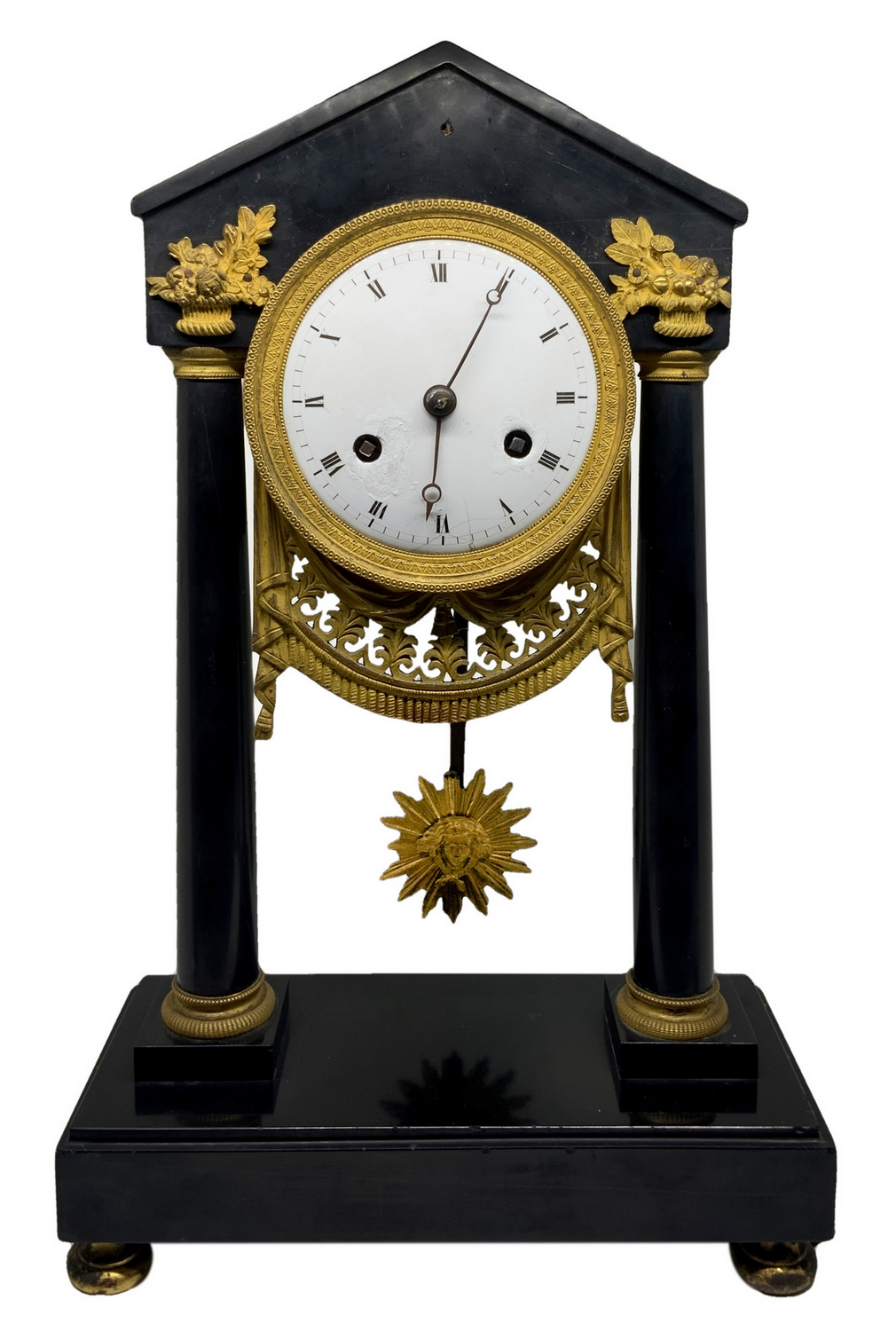 Orologio a pendolo da tavolo, Impero, primi XIX secolo. In marmo nero belga, con pendolo a filo. Da revisionare, salti di smalto nel quadrante.