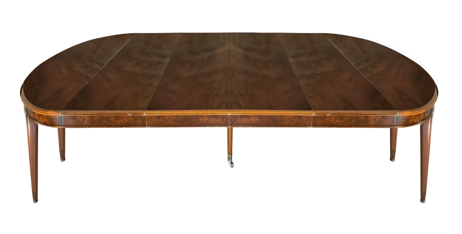Tavolo in radica di noce e n. 4 sedie. Tavolo di forma ovale allungabile, XX secolo. Comprensivo di 4 allunghi da cm 45.