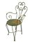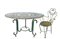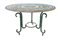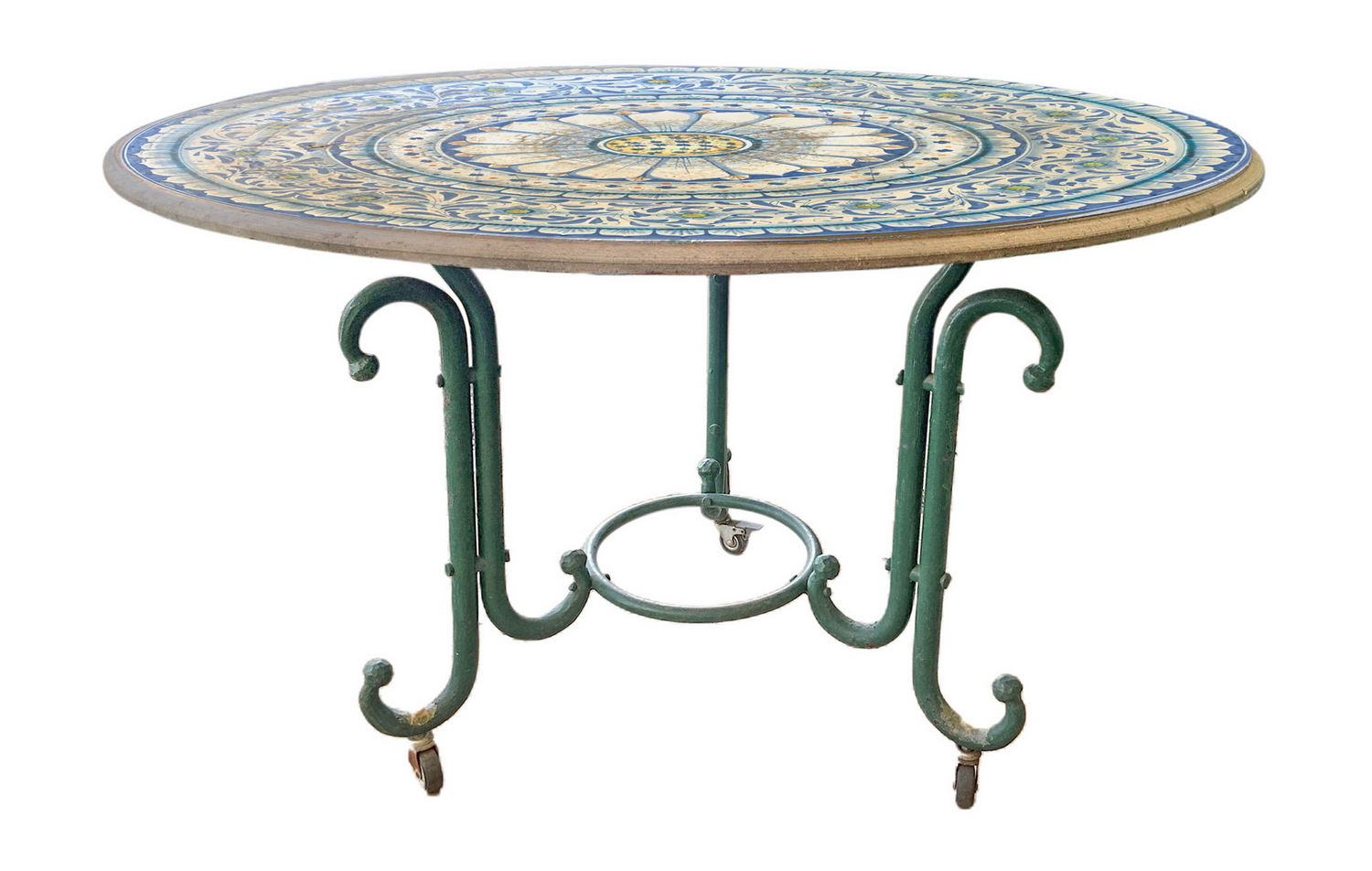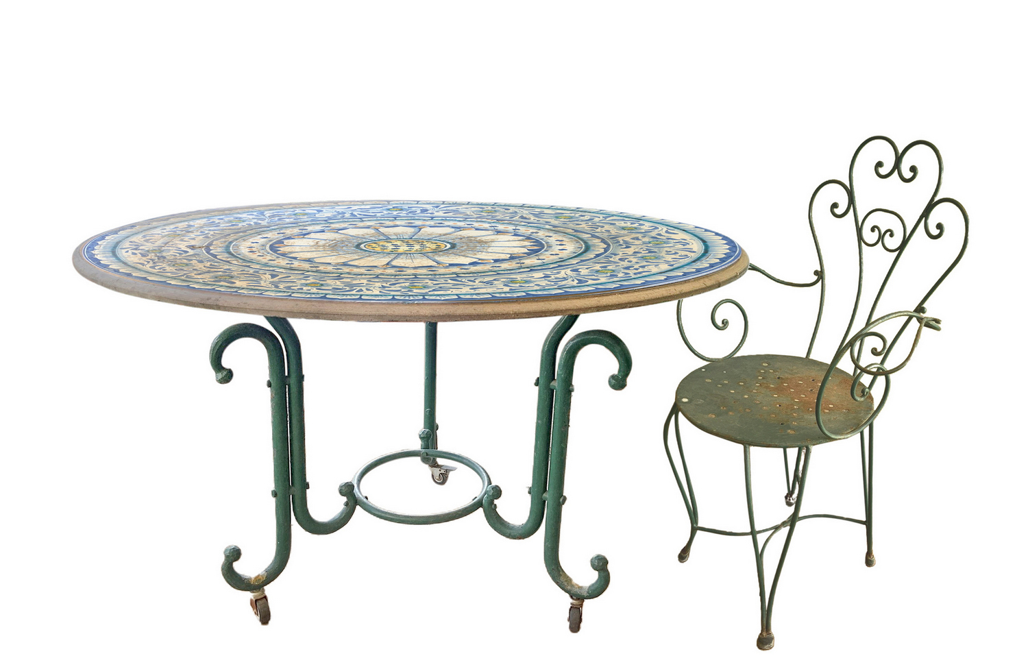 Tavolo rotondo in pietra lavica e 4 sedie. Decorato a ceramica policroma con disegno a gelsomino. XX secolo,e decorazione floreale sulla circonferenza. Quattro sedie in ferro battuto. Misure tavolo H cm 80. Diametro cm 115.