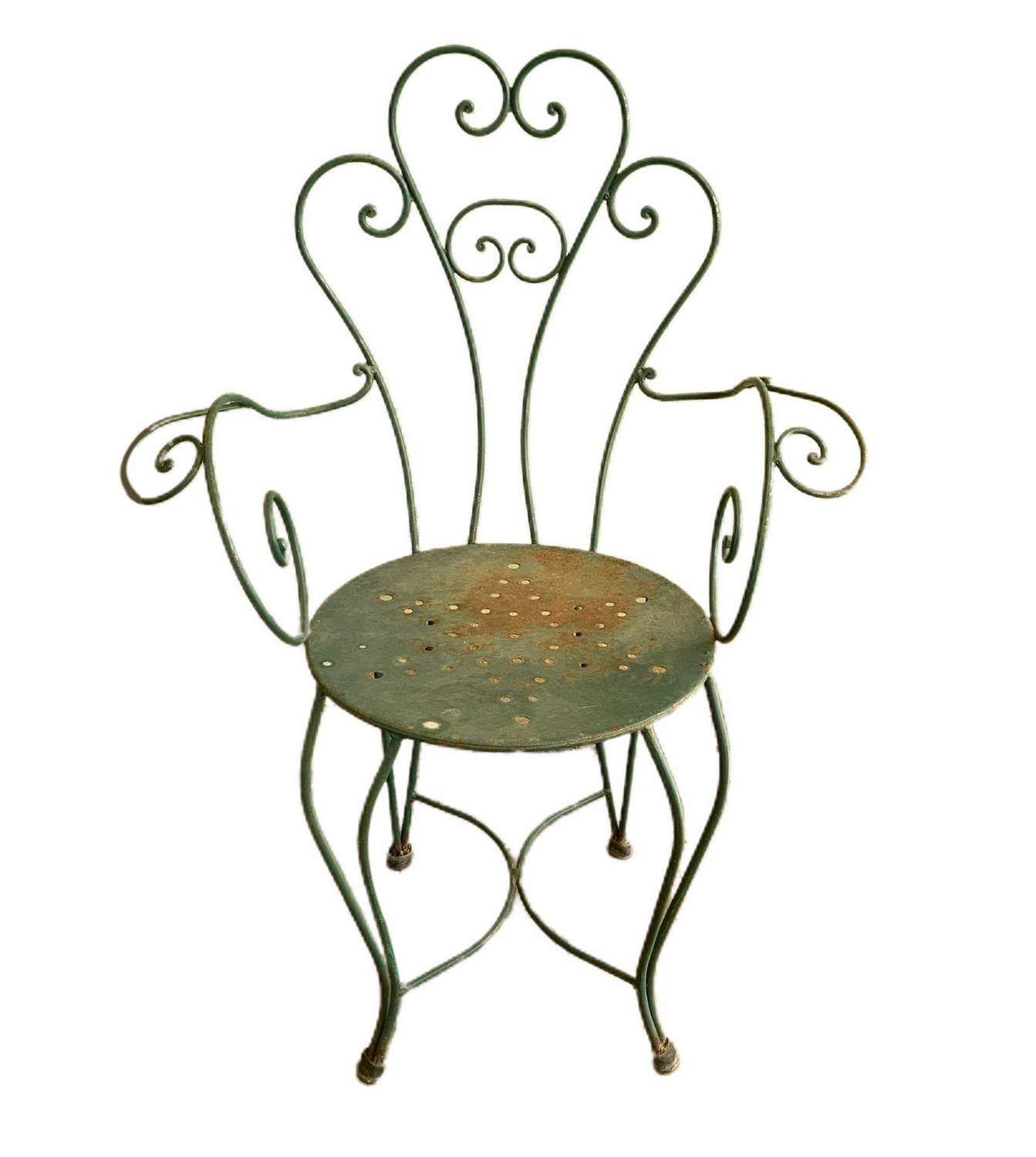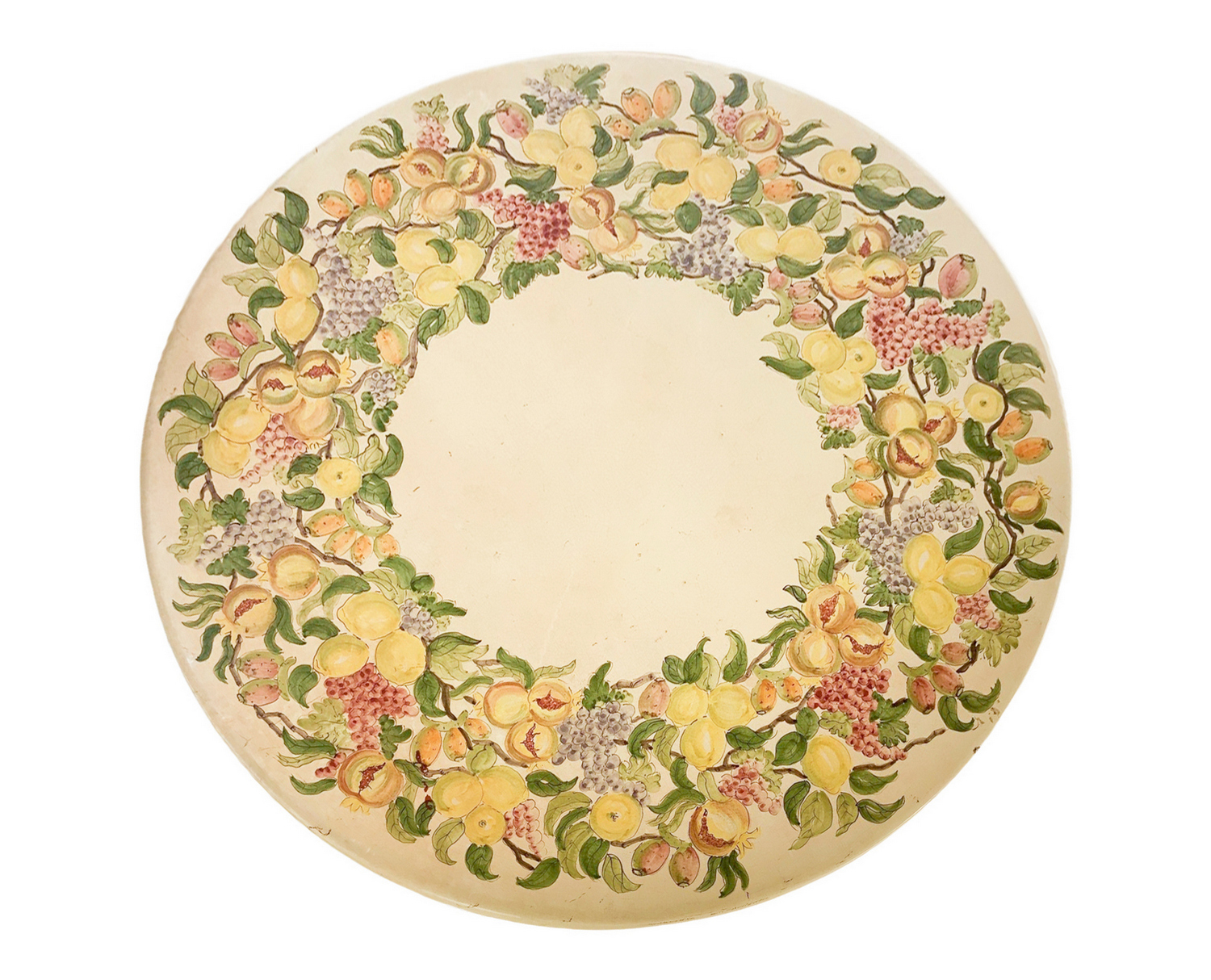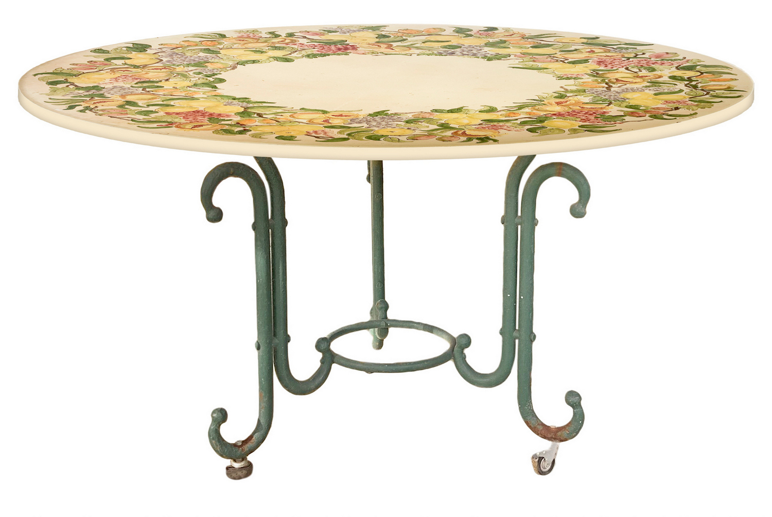 Tavolo rotondo in pietra lavica e n. 4 sedie. Tavolo decorato a ceramica policroma con limoni e. XX secolo,melograni al piano. Quattro sedie in ferro battuto. Misure tavolo H cm 80, diametro cm 125