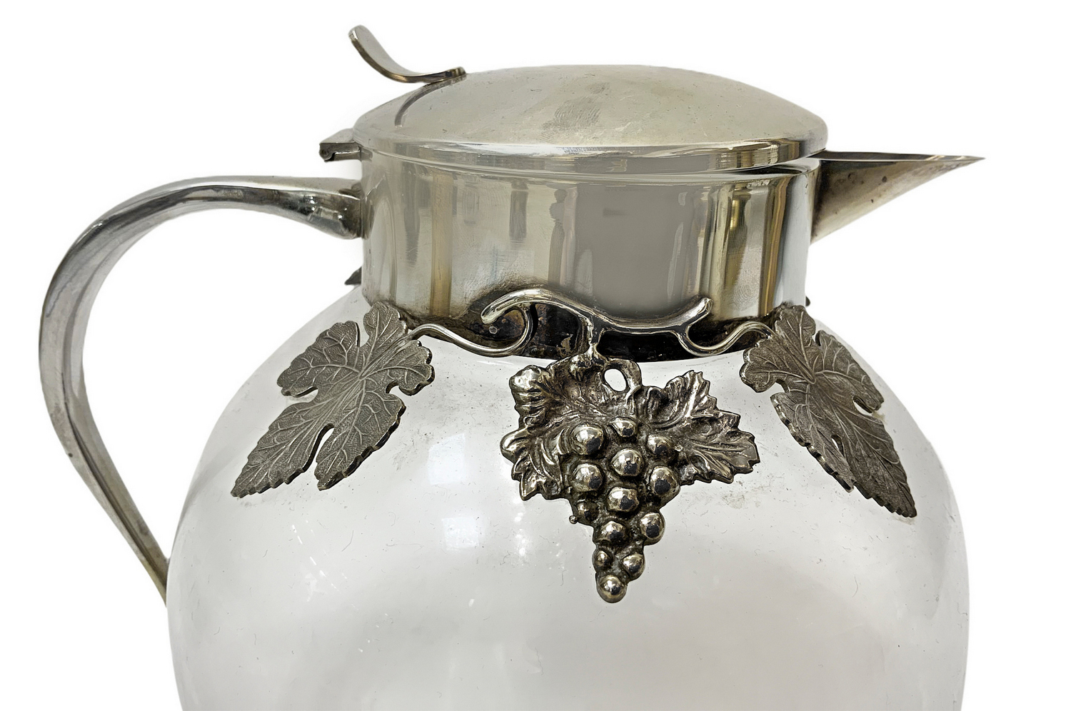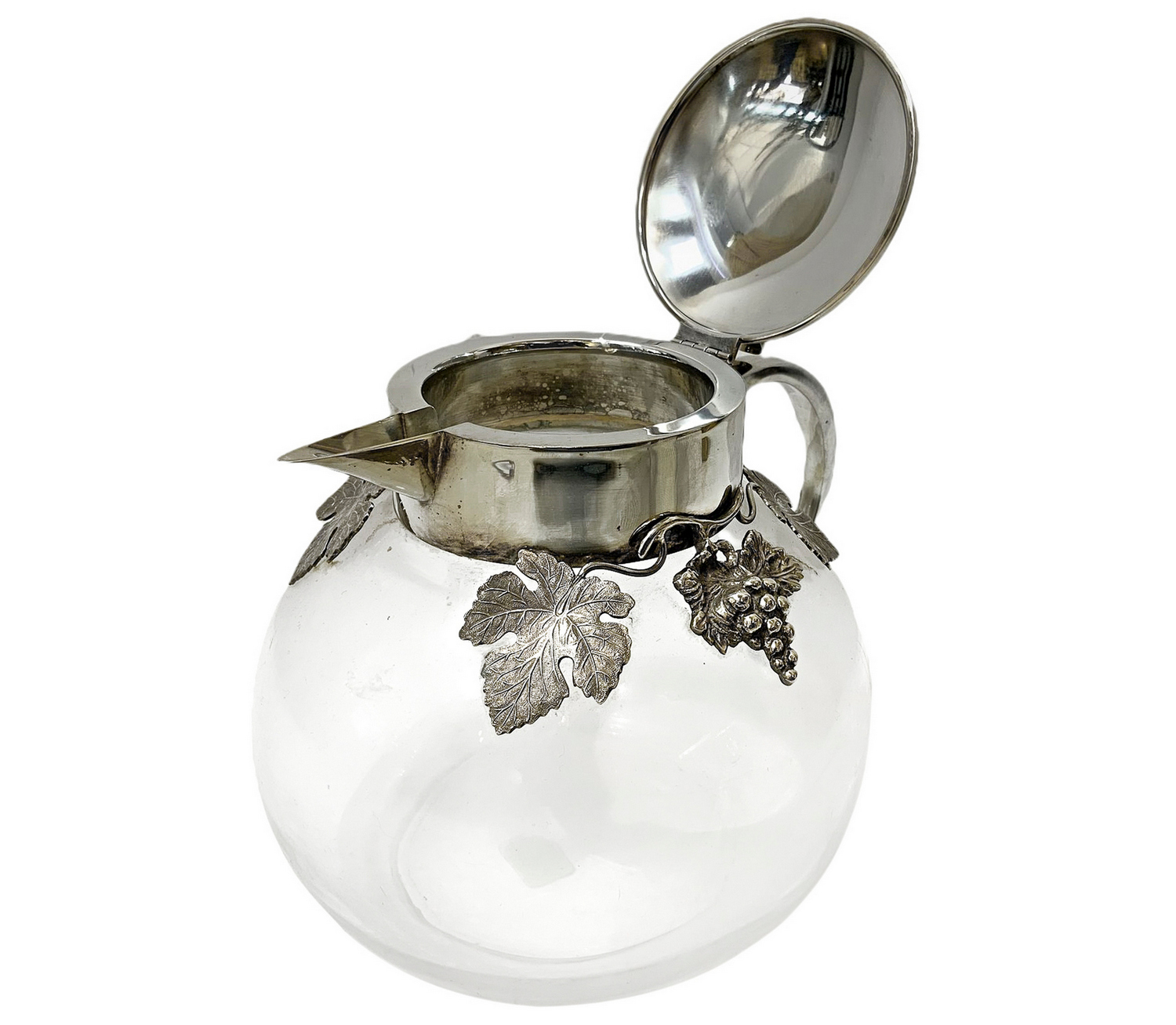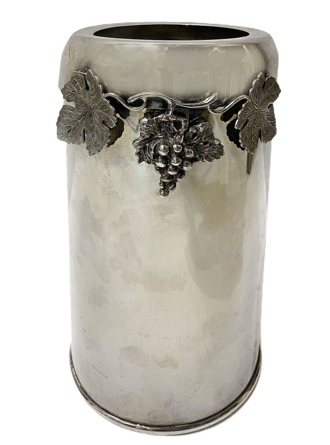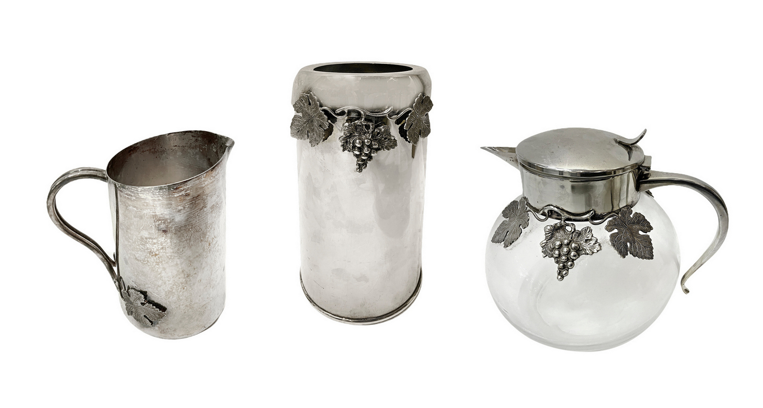 Trittico in Sheffield con applicazioni di foglie ed uva. anni '60,Composto da 2 caraffe ed un portabottiglie.